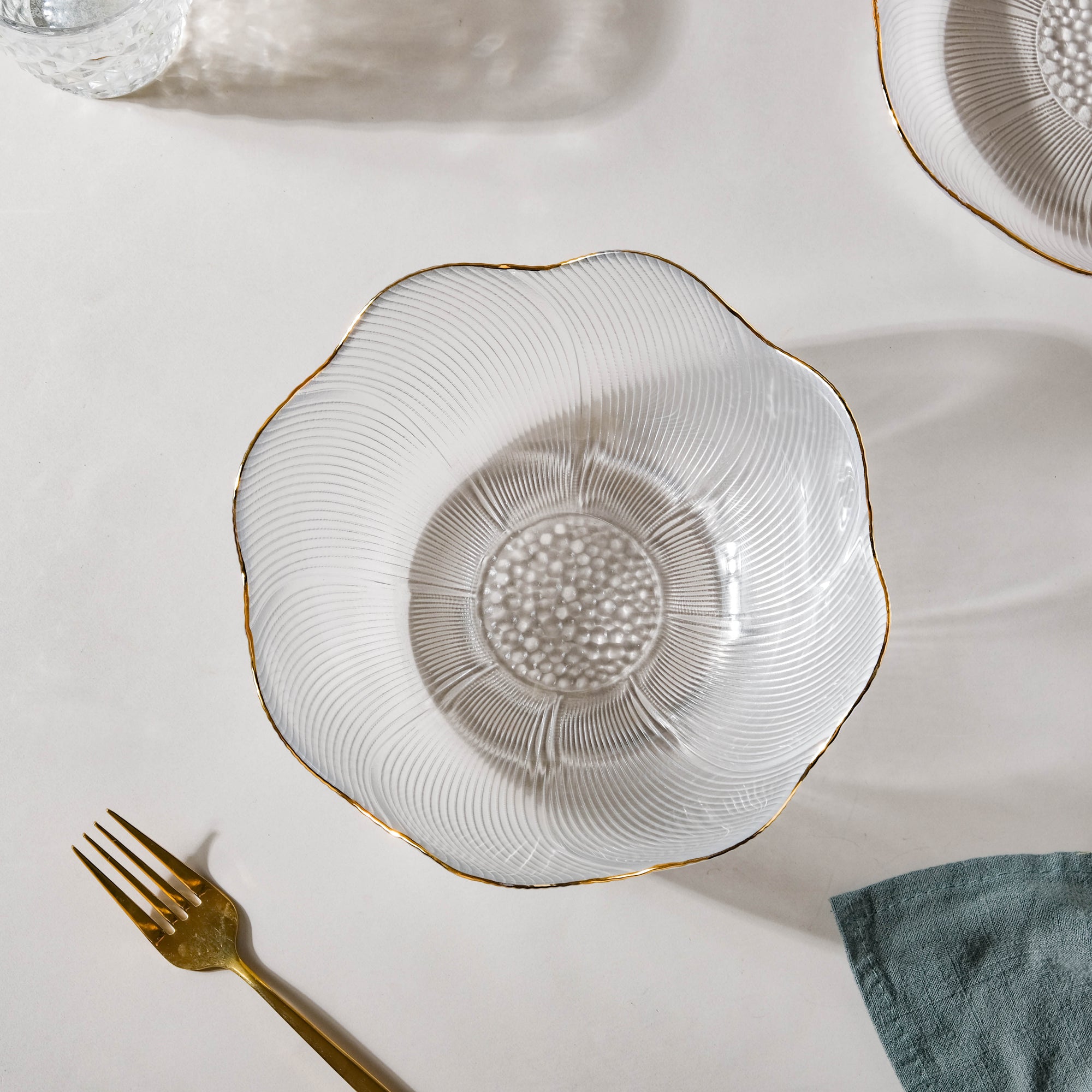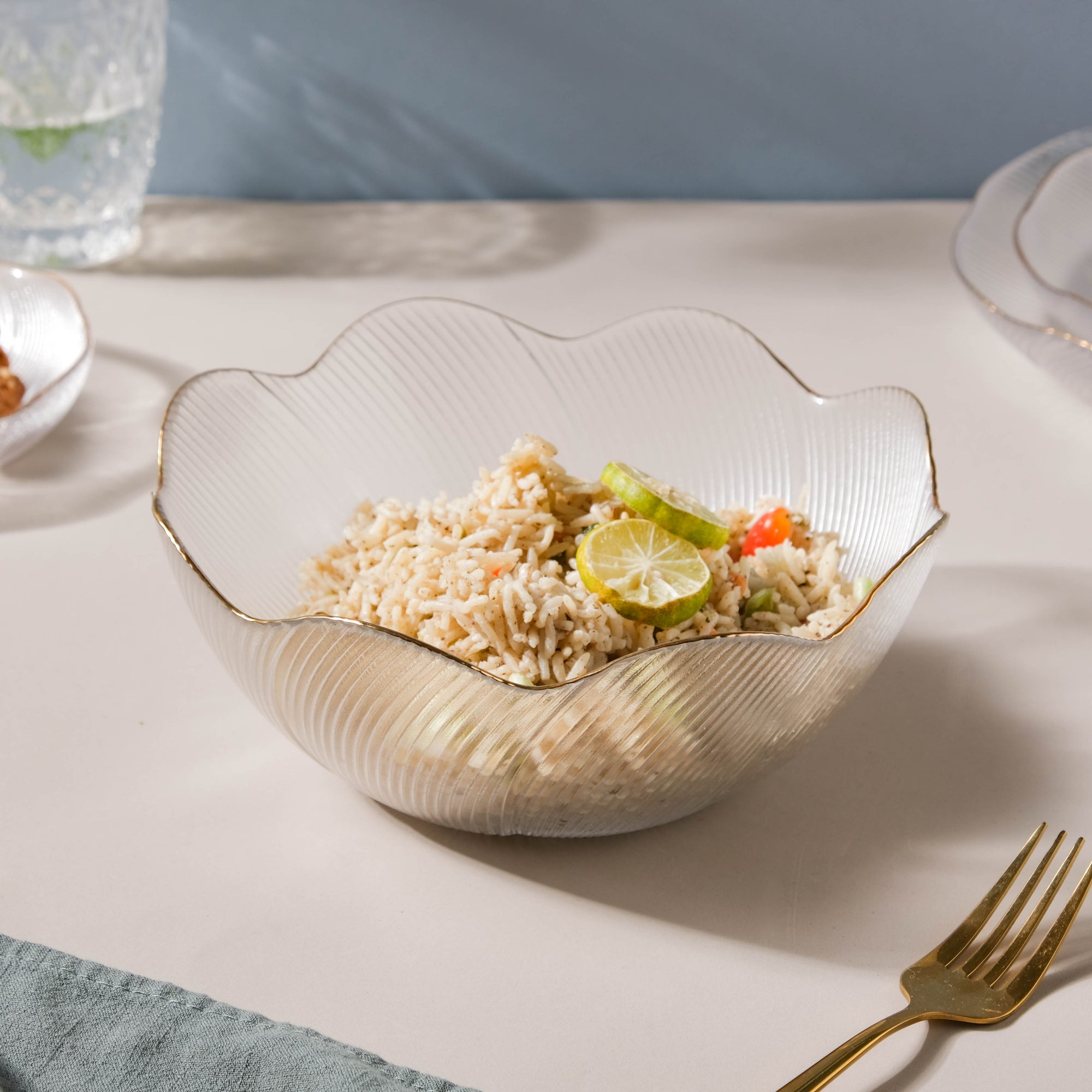 The glass serving bowl has a wavy floral rim and a ribbed outer surface. From day-to-day use or serving food during festivities, the bowl is suitable for all occasions. The bowl may also be placed in the center of the table and be used to place fresh fruits of varied choices.