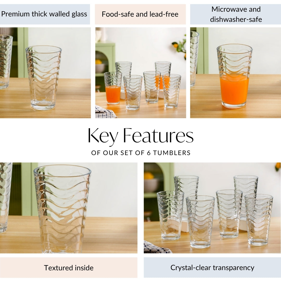 Benefits: The wave tumbler balances everyday functionality with refined design. The inner molded wave pattern adds visual appeal while keeping the exterior smooth and comfortable to handle. Made from durable, food-safe glass, it’s perfect for serving water, juices, sodas, or cold brews. The wide mouth allows for easy pouring and hassle-free cleaning, and the thicker base offers added stability to help prevent tipping. Dishwasher-safe and low-maintenance, this set of six is ideal for both daily use and entertaining, bringing a touch of elegance to any setting.