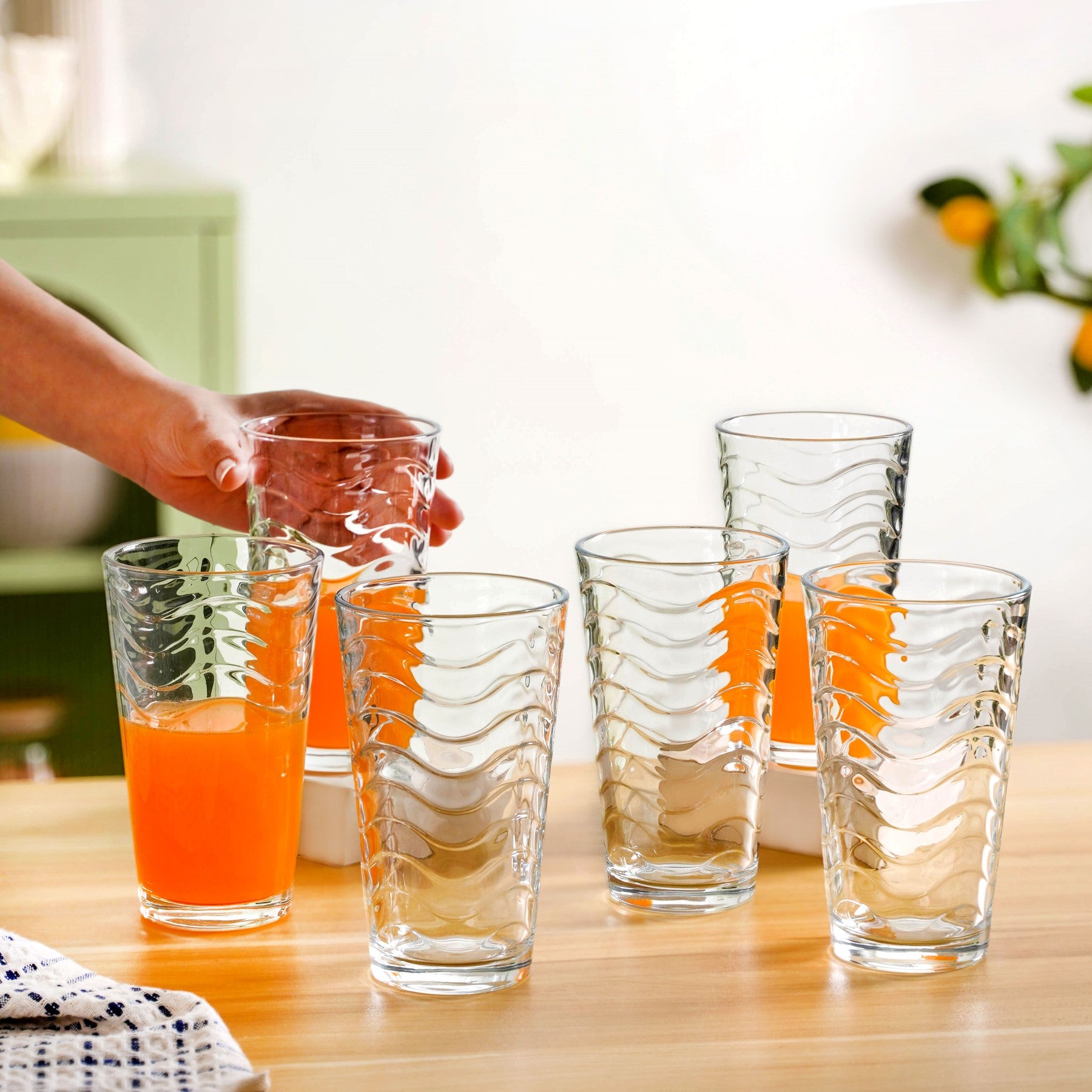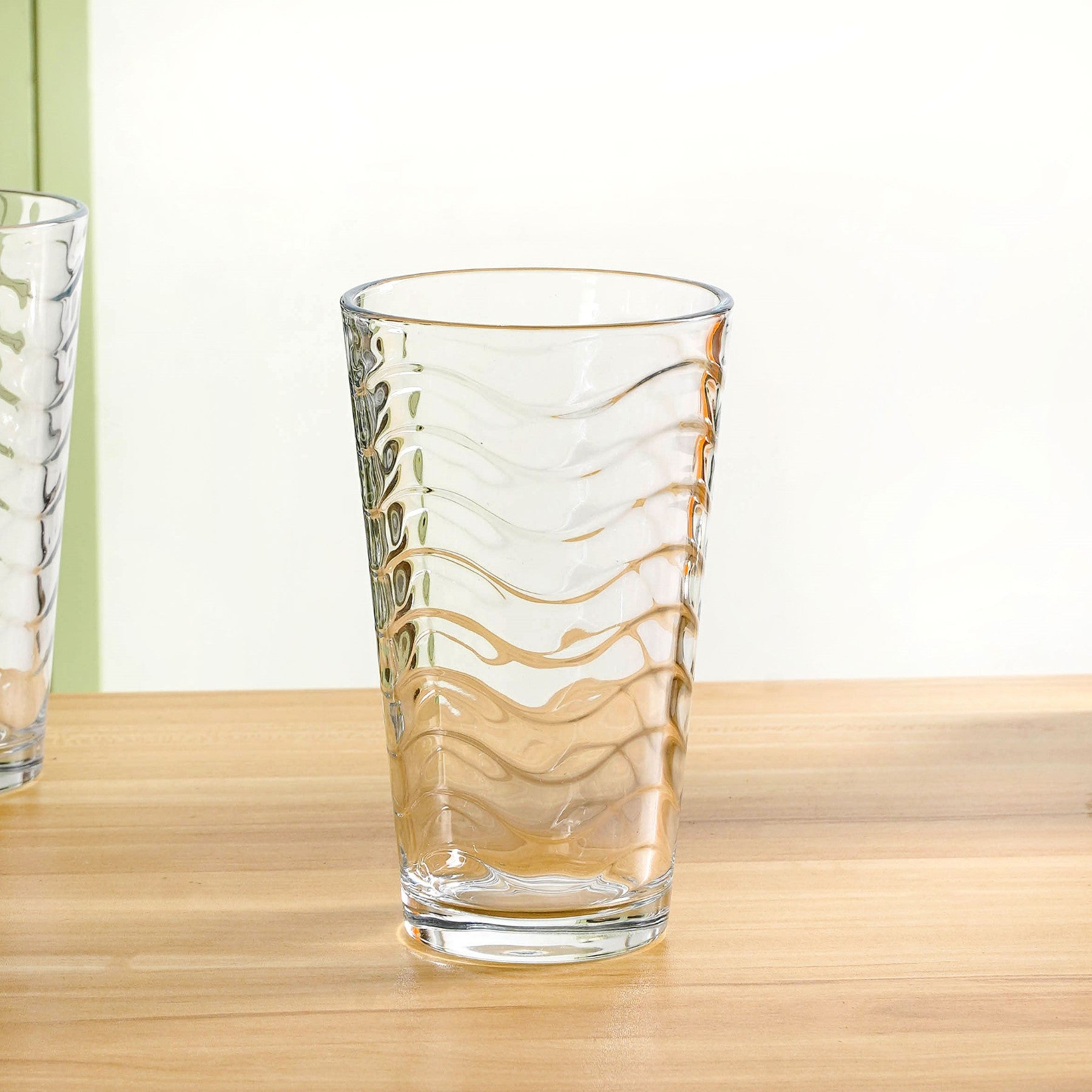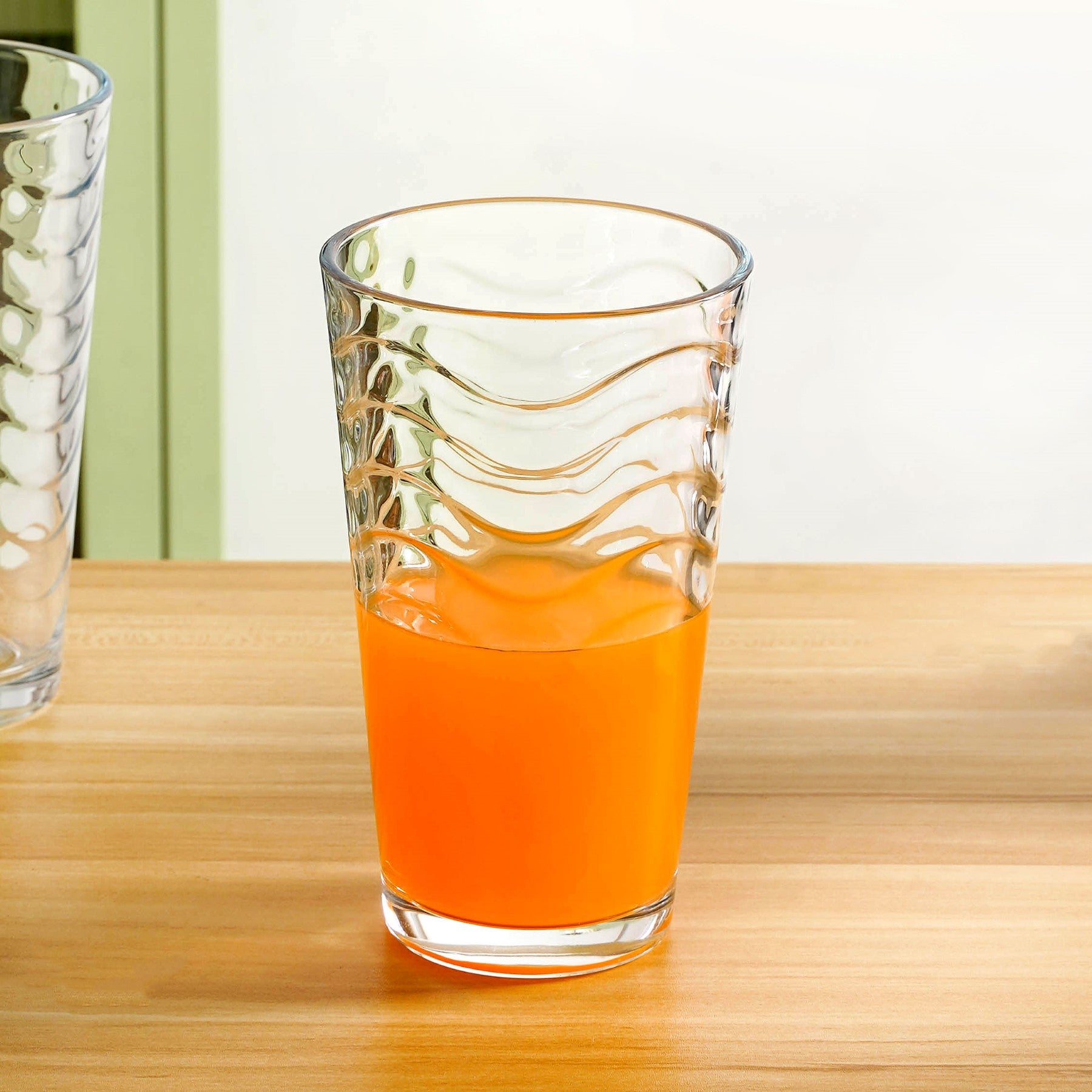 Add a twist of texture to your drinkware with this clear glass tumbler set. Designed with a smooth, wavy pattern that wraps around the surface, these tumblers bring a fresh, tactile element to everyday hydration. Perfect for water, juice, mocktails, or cold brews!