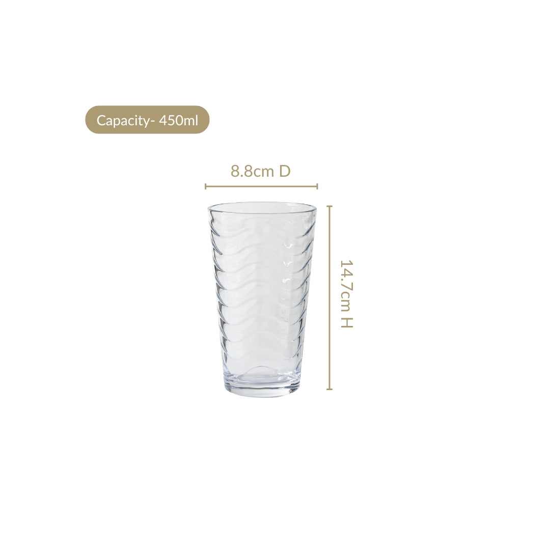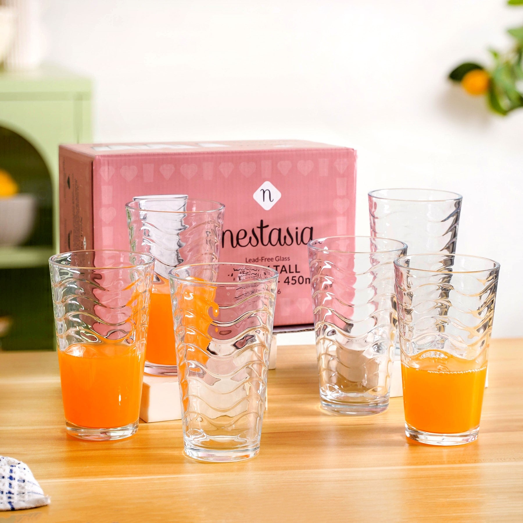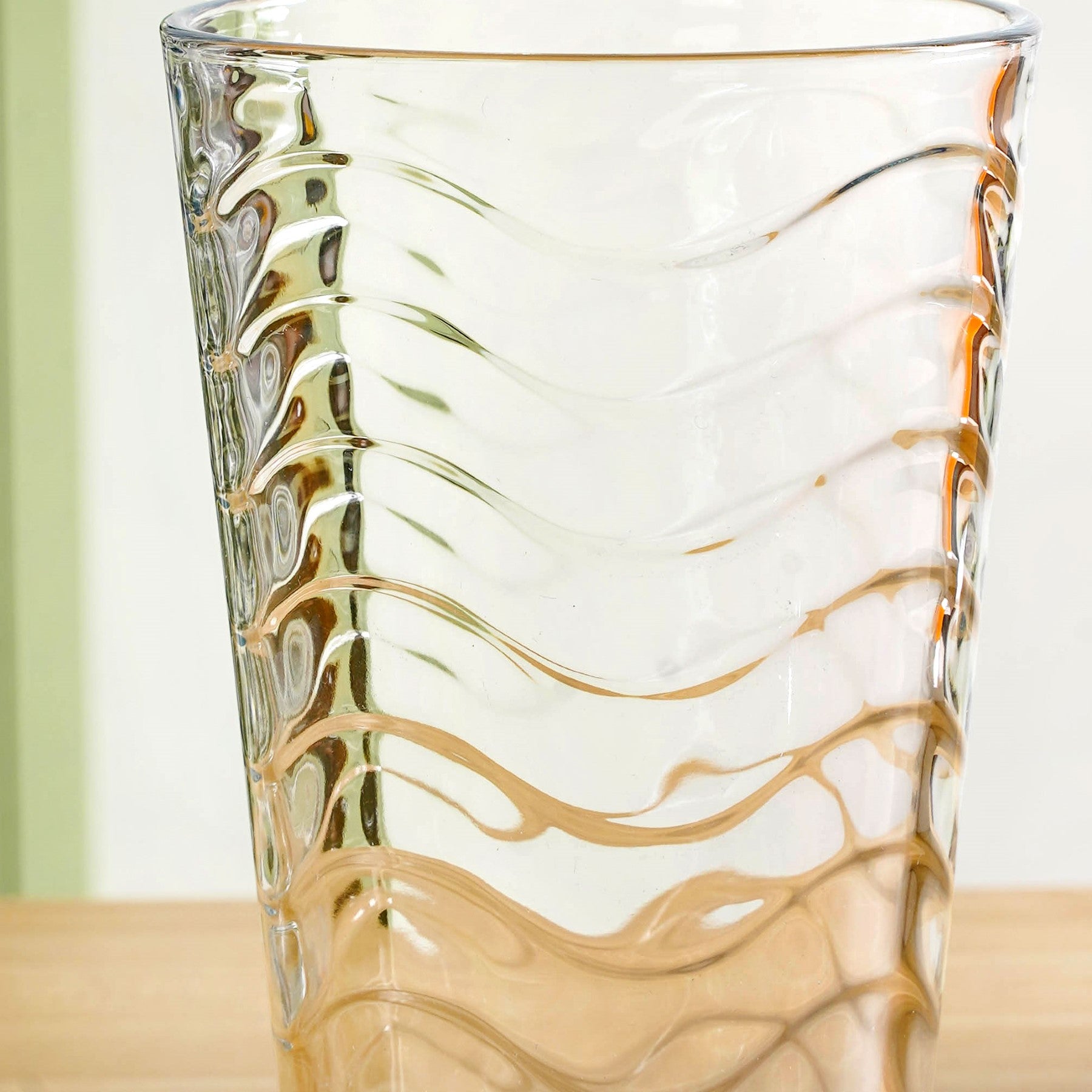 Add a twist of texture to your drinkware with this clear glass tumbler set. Designed with a smooth, wavy pattern that wraps around the surface, these tumblers bring a fresh, tactile element to everyday hydration. Perfect for water, juice, mocktails, or cold brews!