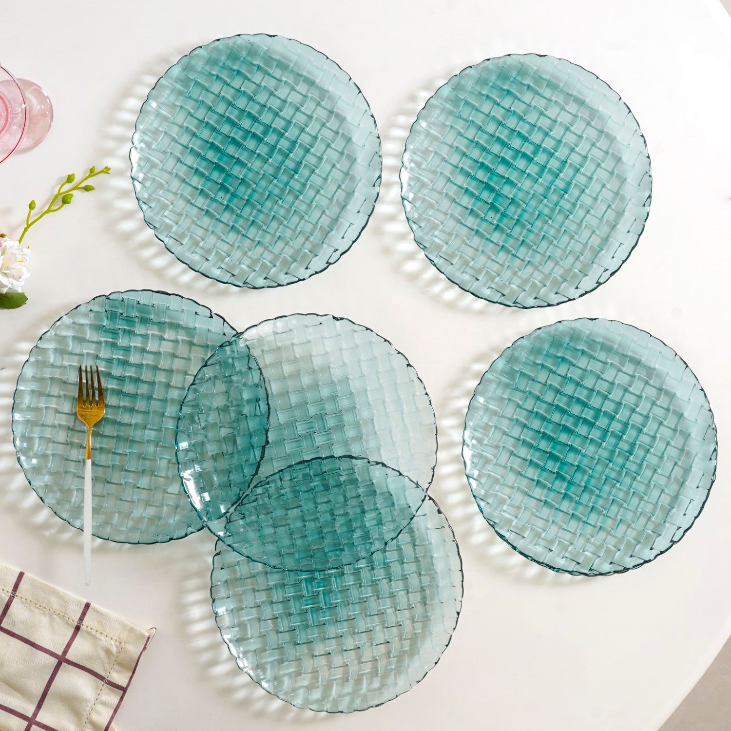 Design: This glass dinner plate set features a distinctive basket-weave textured base for added visual appeal. The transparent plates are enhanced with a subtle grey-blue tint, lending a modern and elegant touch to your table setting.