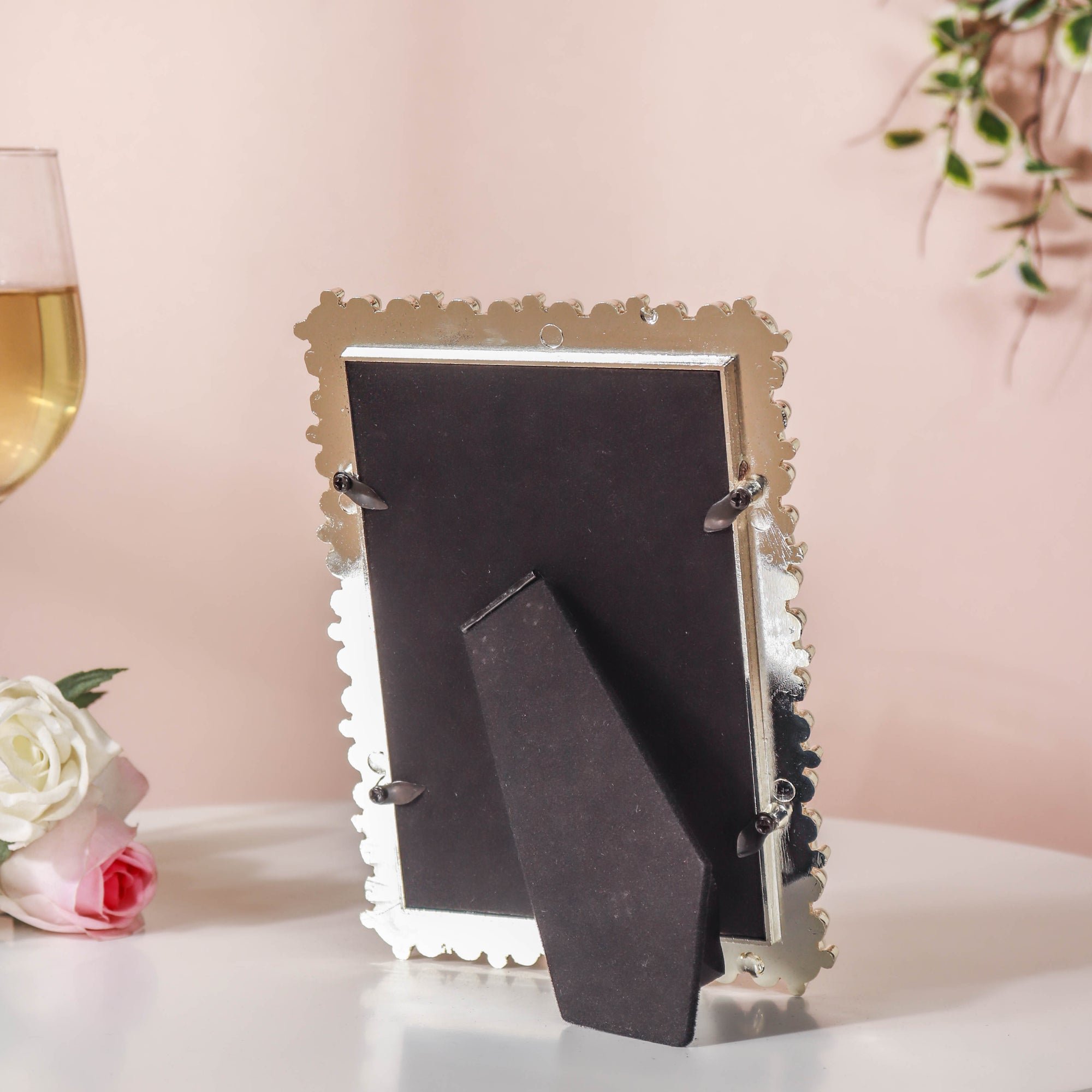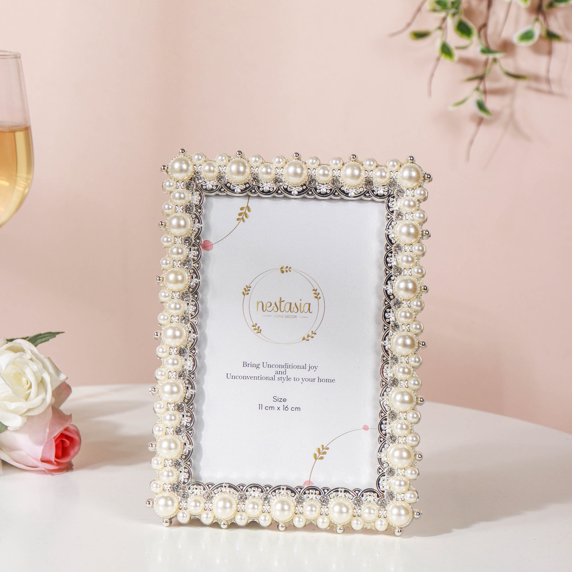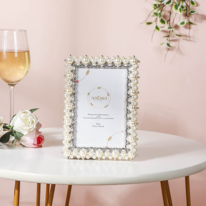 The artful photo frame comes with curved inlays in eye-pleasing silver tones that border all the sides. Iridescent pearls sit on the inlays, one next to the other, adding an elegant glimmer to the entirety of the photo frame.