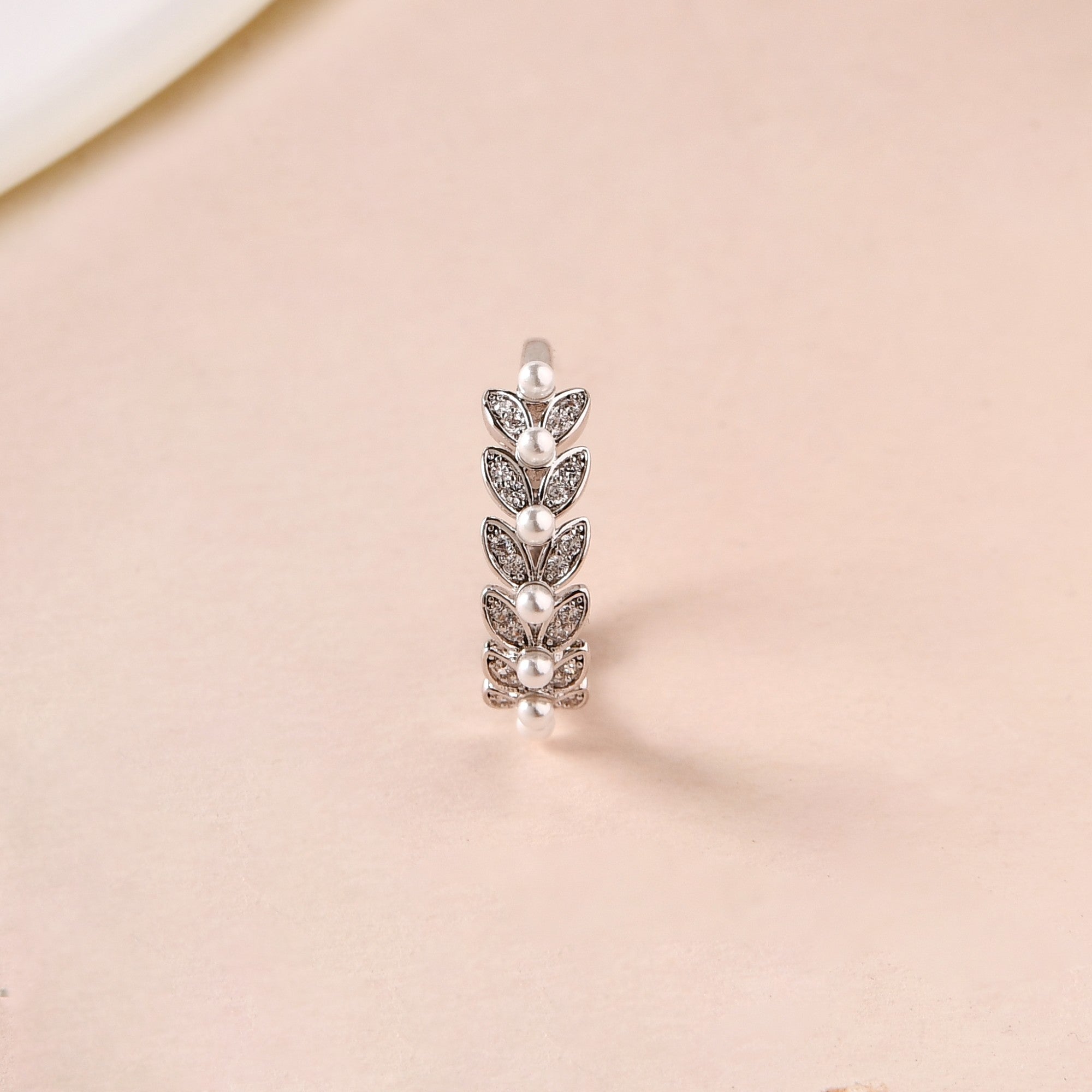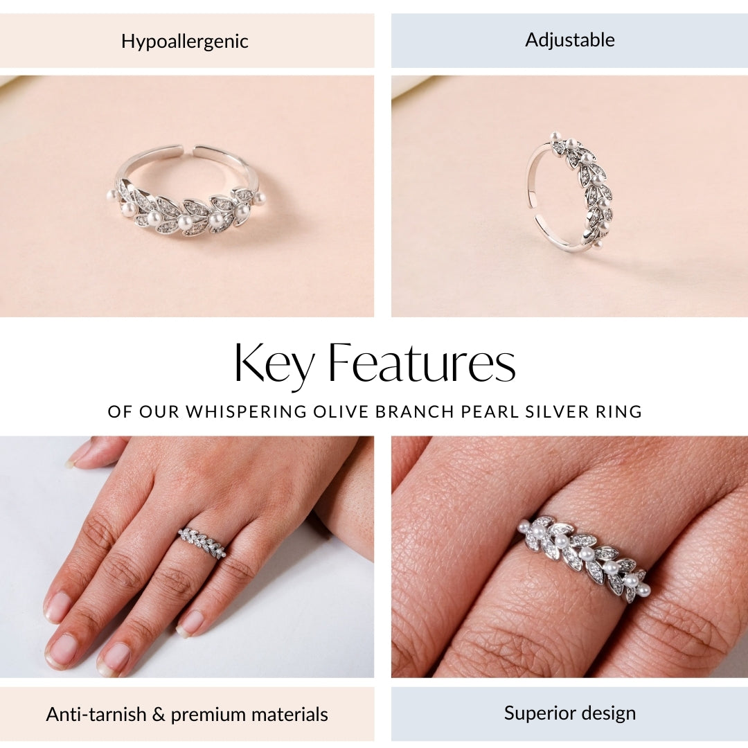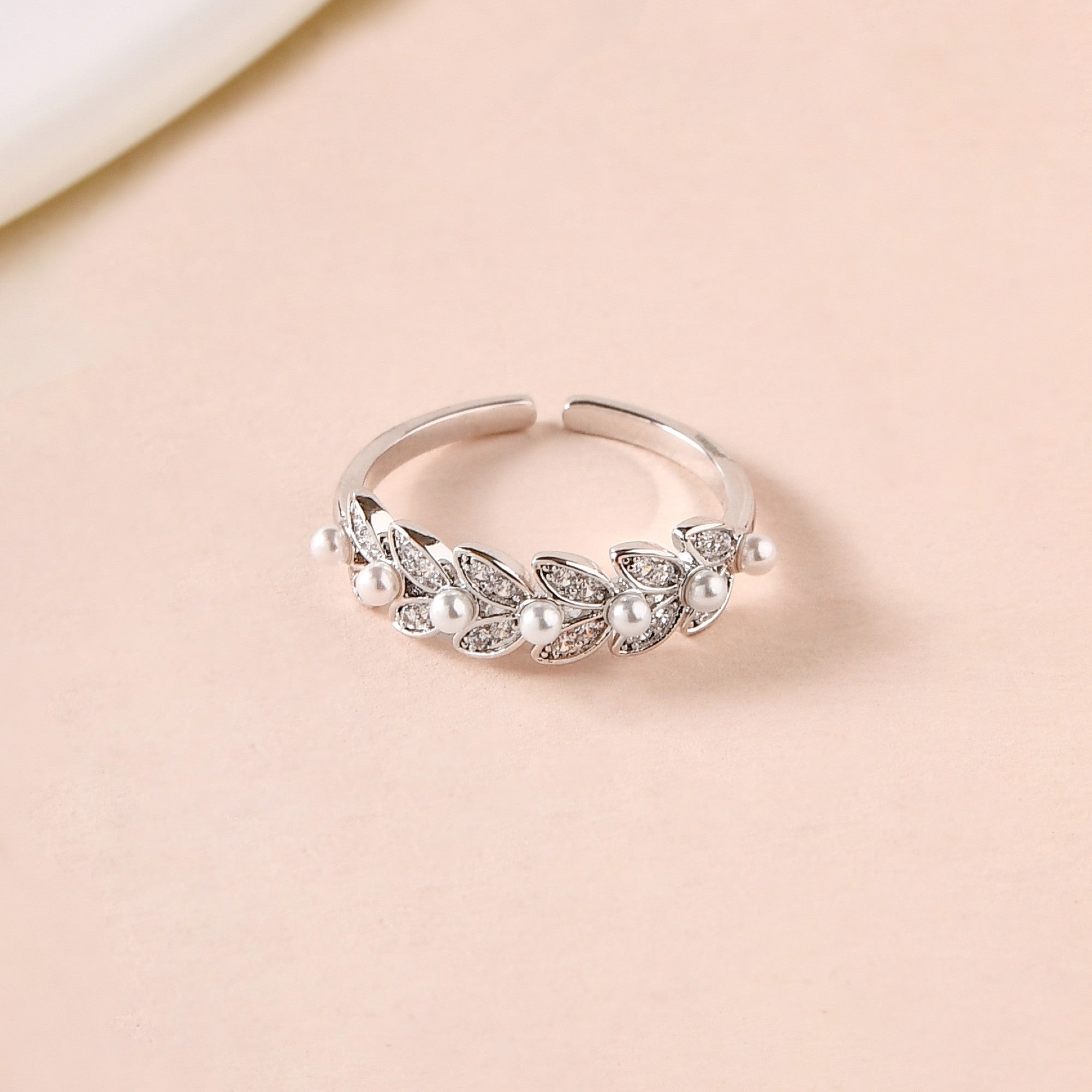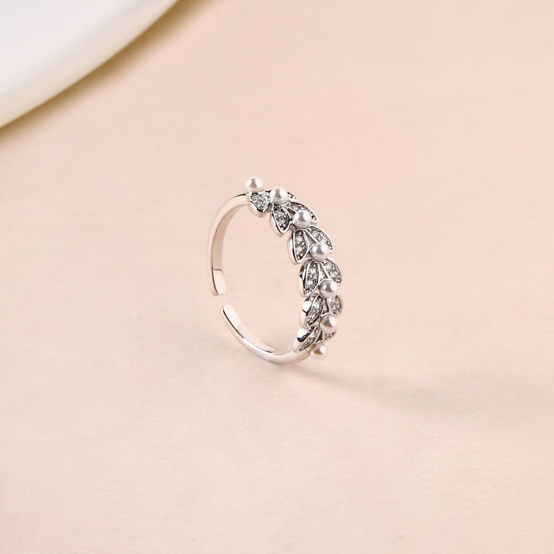 A delicate olive branch wraps gracefully around the finger in this silver-toned ring, capturing the beauty of nature in an elegant design. The adjustable band offers a comfortable fit while shimmering stones highlight the petite olive leaves with a subtle sparkle. Tiny white pearls add a classic touch, enhancing its timeless charm. Whether worn daily or on special occasions, this ring effortlessly complements any outfit. A symbol of peace and prosperity, it also makes a thoughtful gift for someone who appreciates meaningful jewellery.