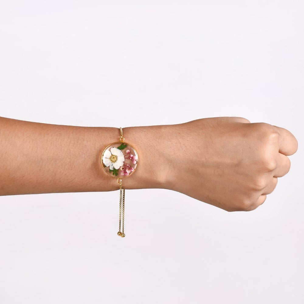 Bloom with style and celebrate the enduring beauty of daises with our awe-inspiring bracelet for women. Showcasing the purity and innocence of a daisy, this charming bracelet adds a touch of elegance to every look. Captured inside a round transparent case is a pressed and everlastingly preserved real Daisy (Bellis perennis). Complemented by mildly purplish dainty floral blossoms and leaf ferns, the bracelet is a still representation of nature's wonders. The casing is encircled by golden borders, infusing a sense of opulence. The chain and tassels are also covered in gold, accentuating the aesthetics of our adjustable bracelet. Flaunt it with chic blouse and jeans or pair it with an A-line dress - the vibrant colours and delicate accents of this captivating bracelet will turn heads.