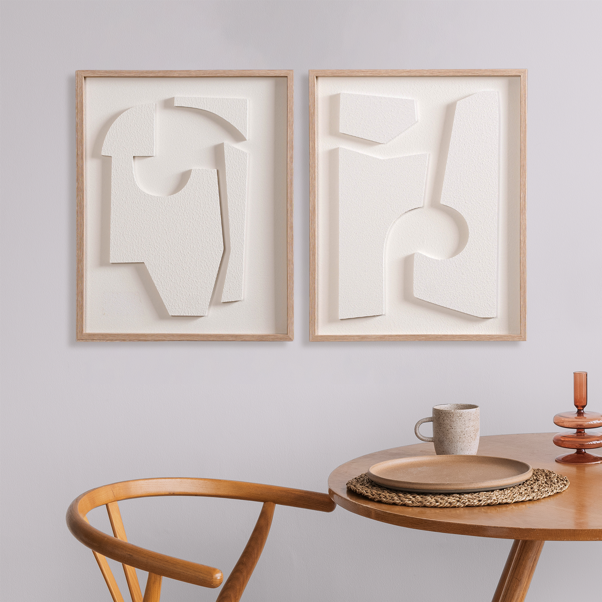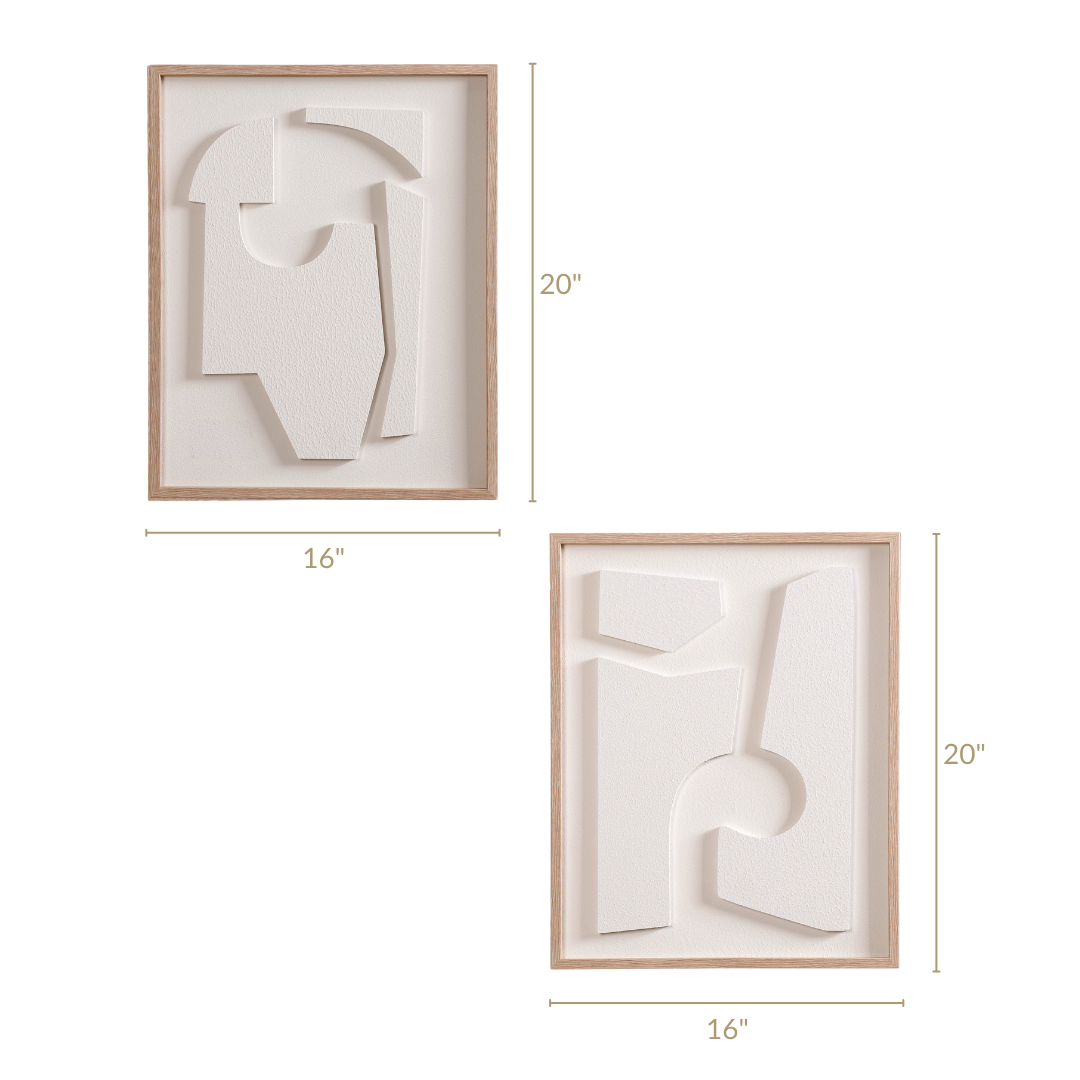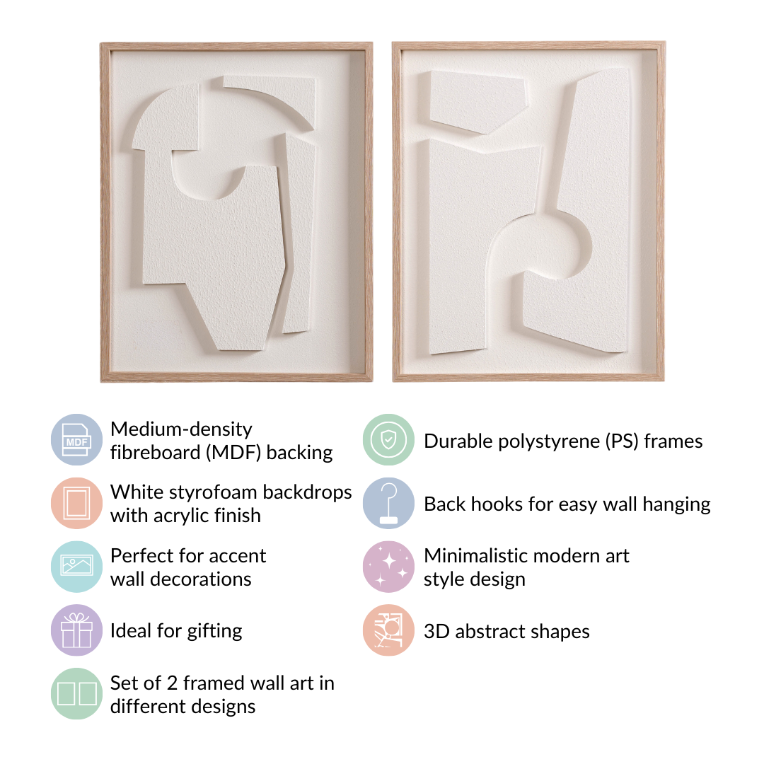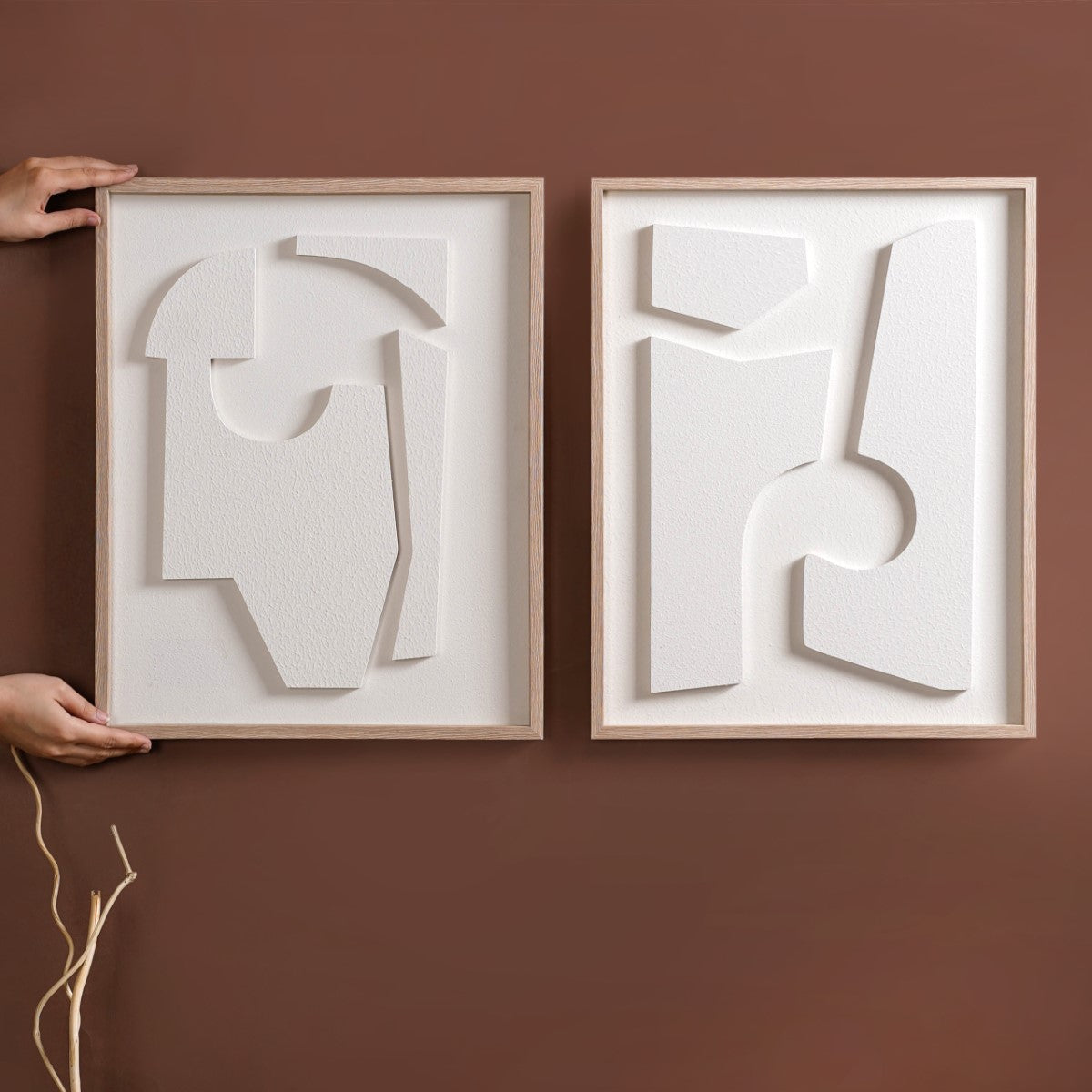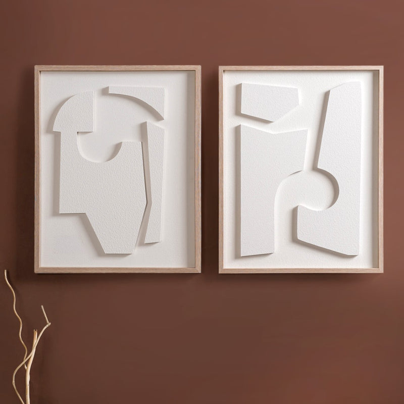 These art pieces are the epitome of minimalism, embodying simplicity and elegance in their design. Featuring sleek 3D shapes against a pristine white styrofoam backdrop with an acrylic finish, they offer a clean and uncluttered aesthetic that resonates with minimalistic principles.