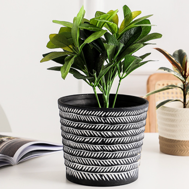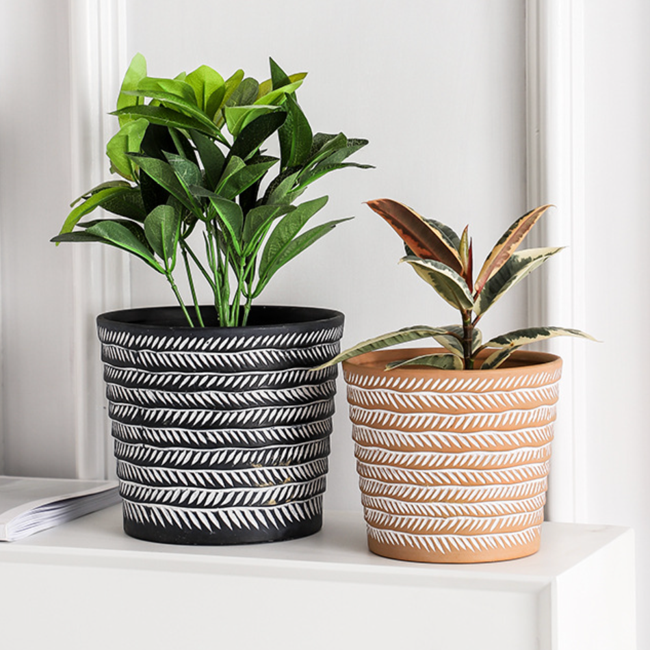 The circular white textures against the black pot look spectacular when placed in a modern living space. The large pot is intricately crafted in ceramic and is ideal for holding indoor plants, succulents, and flowering plants. The densely textured overlapping white lines on the exterior lend an extravagant style to the plant pot. The well-crafted handmade pot can be combined with other ceramic pots of muted shades to create a contemporary setting in the balcony garden. Combine the black textured pot with white and beige pots to complete the look.
