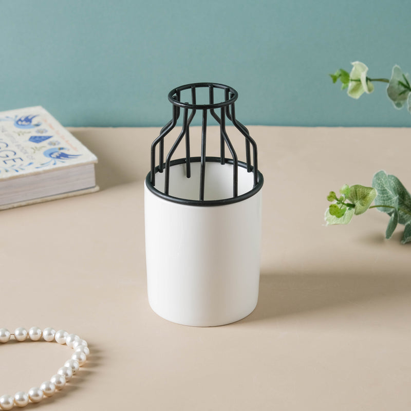 The modish ceramic planter has been delicately fashioned, to give the space an urban and contemporary vibe. The planter's sleek ceramic finish and sturdy construction give it a majestic appearance. The planter has a detachable metal top so one can place long stems in the planter as well. The planter is not only soothing to the eye but also attracts positivity, harmony, and tranquility with the neutral tones. Fill the planter with fresh flowers or use faux floral stems to decorate the planter.
