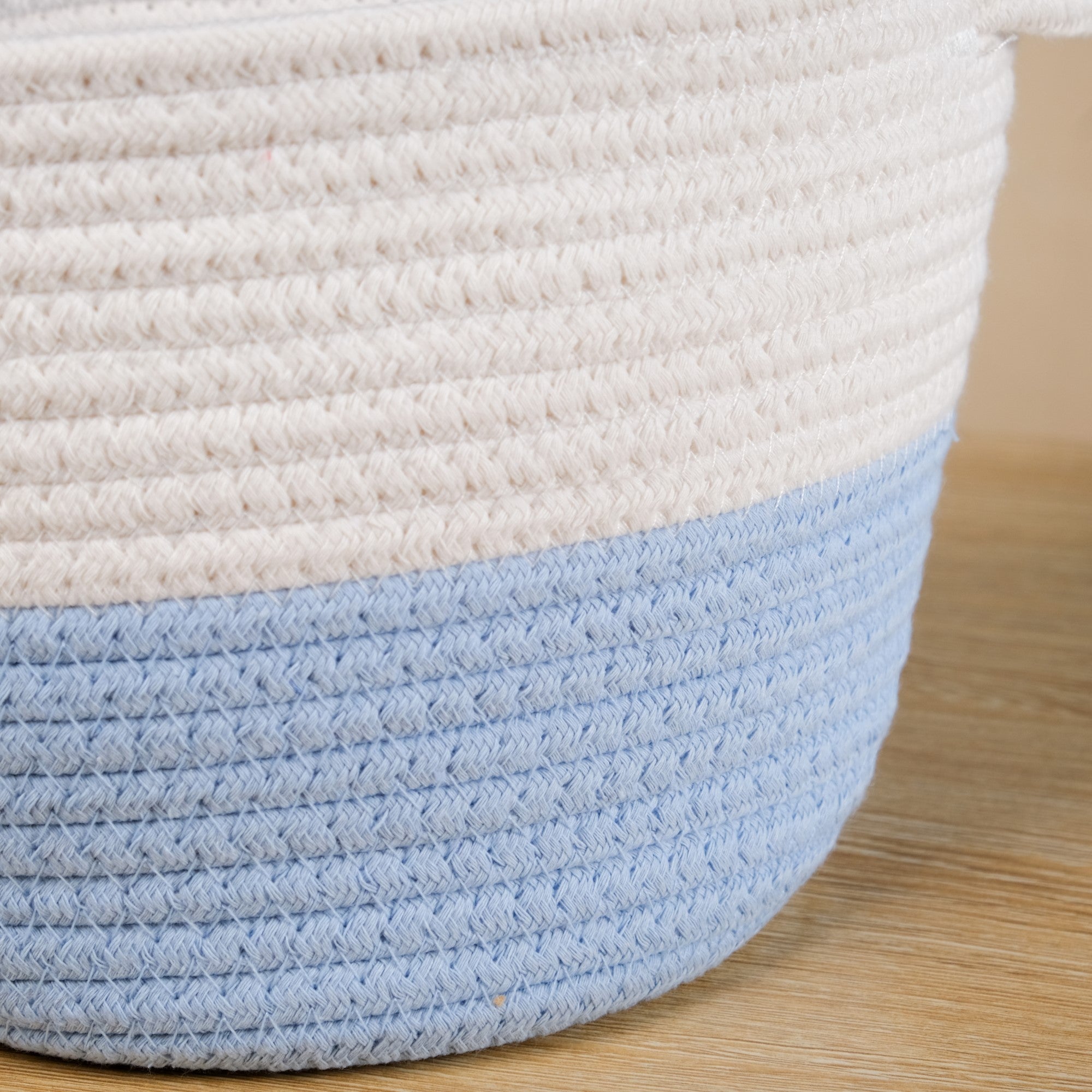 Design: Thoughtfully crafted with a soft yet sturdy woven texture, this organizing basket features a soothing combination of white and powder blue, evoking a sense of calm and freshness. The structured yet flexible design allows for easy handling, making it a great fit for little hands learning to stay organized. The side handles also make it easy to carry.