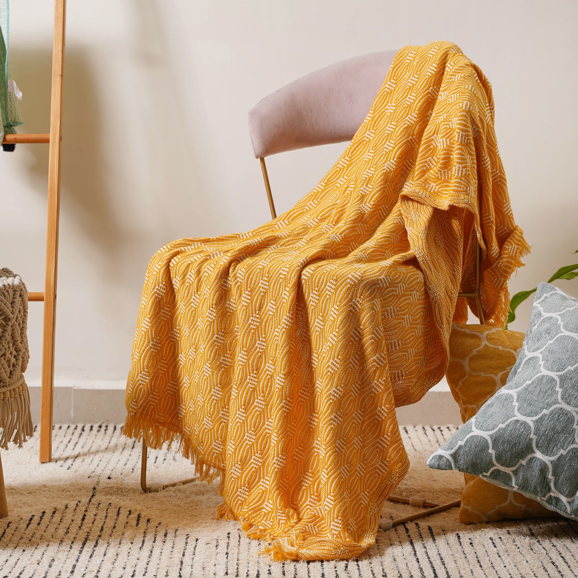 The two-toned throw in a simple yet detailed design is an excellent accent to any humble abode. On a chilly evening, enjoy a hot cup of coffee while cuddled up in this warm and delicate throw blanket. The contrasting combination of mustard and white is a magnificient combo of gentle colours to add to any interior space.