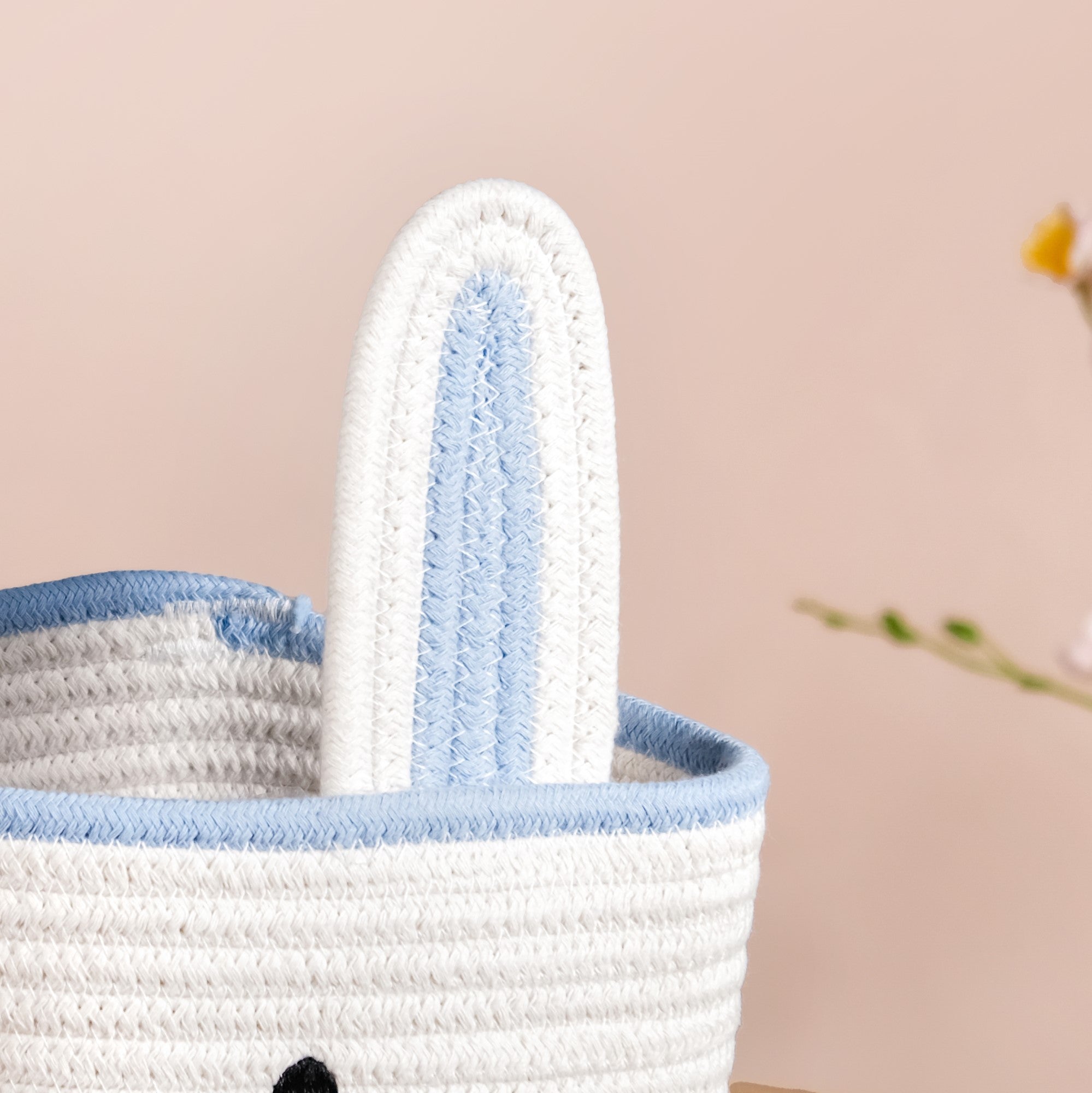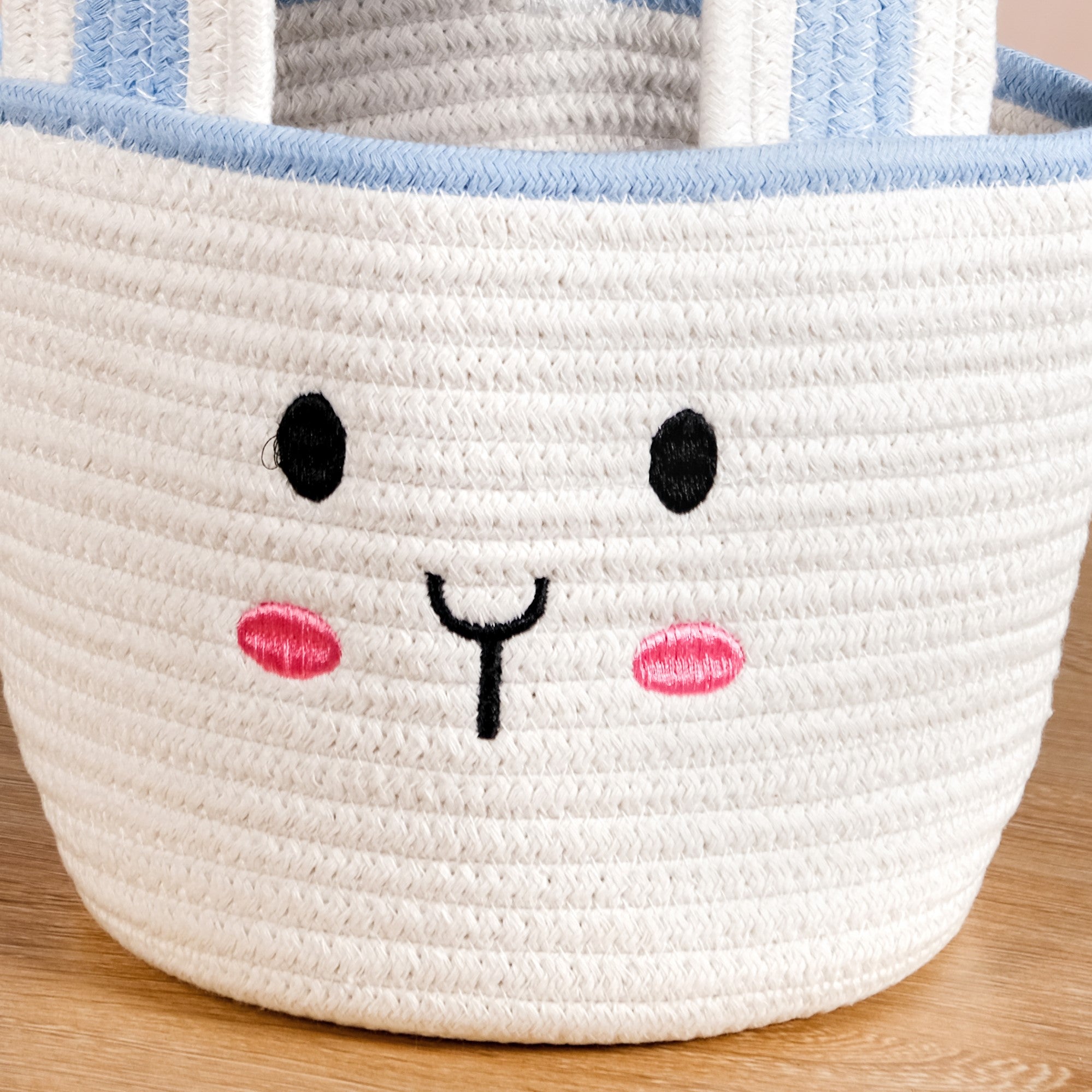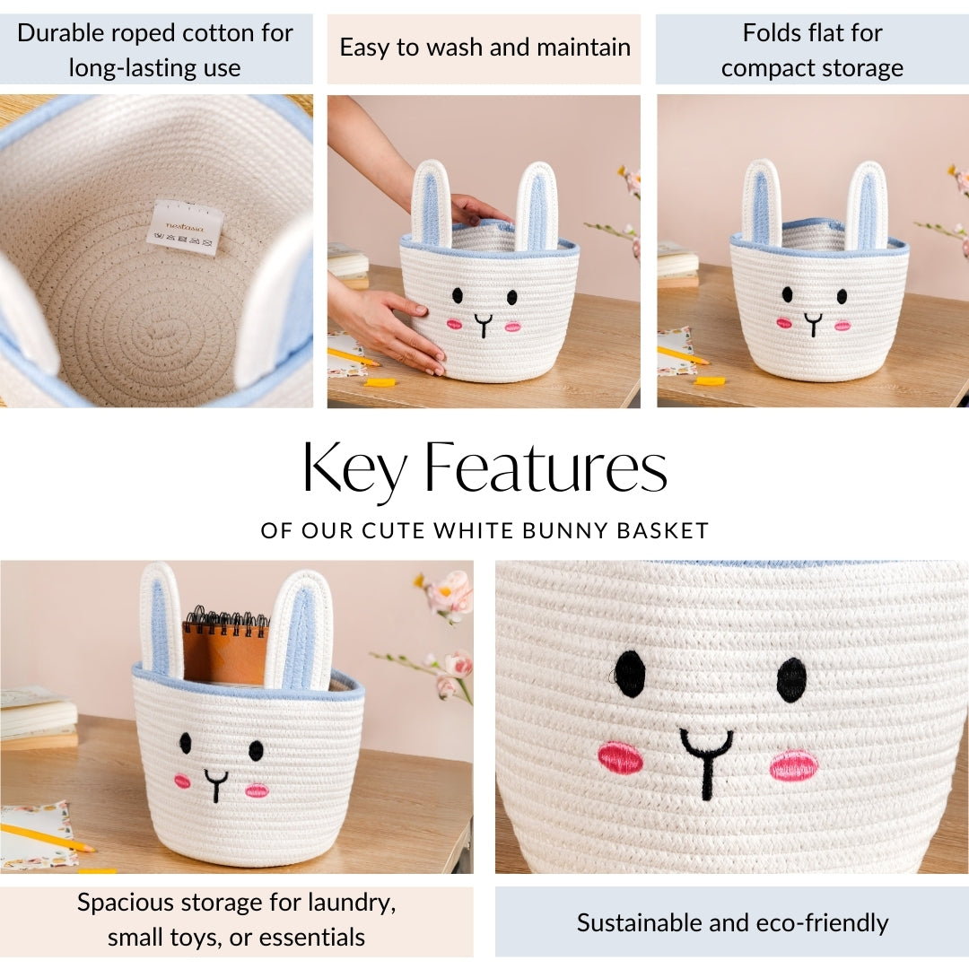 Design: Crafted from soft, durable woven fabric, this white and blue basket features an endearing bunny face with 3D ears, making storage both playful and stylish. The lightweight structure ensures easy portability, while the neutral colours blend effortlessly into any nursery or kids' room décor.