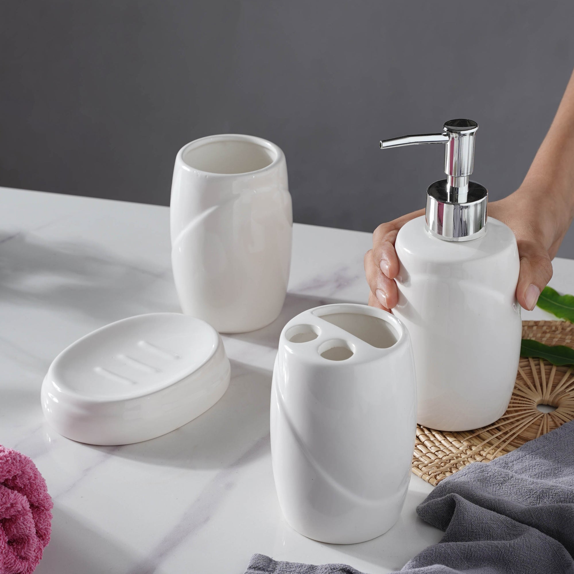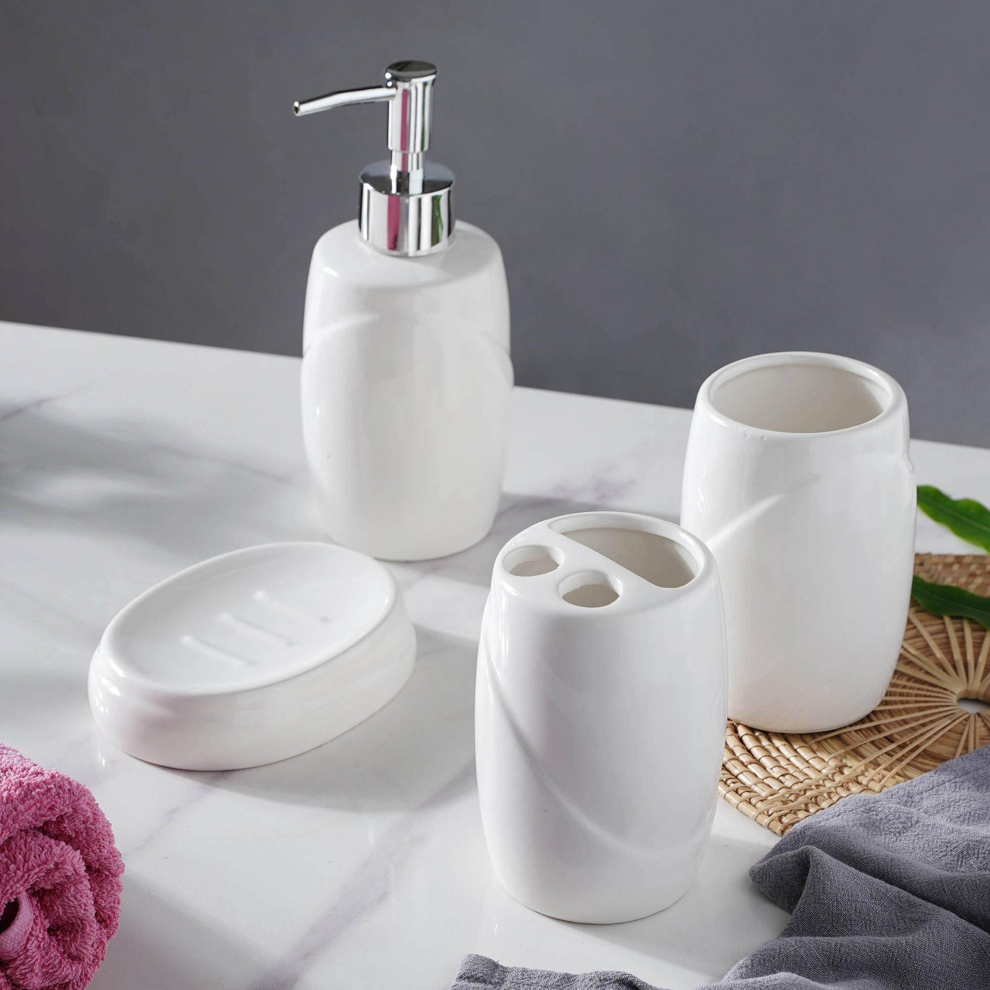 Color: White Material: Ceramic Products included: 1 lotion dispenser bottle, 1 toothbrush holder, 1 tumbler, 1 soap dish Style: O15M21O01