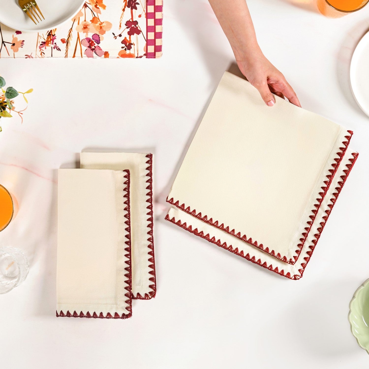 Design: Discover the impeccable harmony of durability and finesse in our refined table linen. The primary white textile is expertly treated with an acrylic coating, creating a reliable shield that repels spills and keeps stains at bay. The borders are finished with an eye-catching, dark brown, small V-stitch edge embroidery, lending an instantly graceful look. The fabric stays largely wrinkle-free and has a gentle surface texture for easy handling. Each napkin in this set of 4 is packaged tidily and showcases impeccable, reinforced edges with sturdy, consistent stitching, promising superior quality and excellent value.