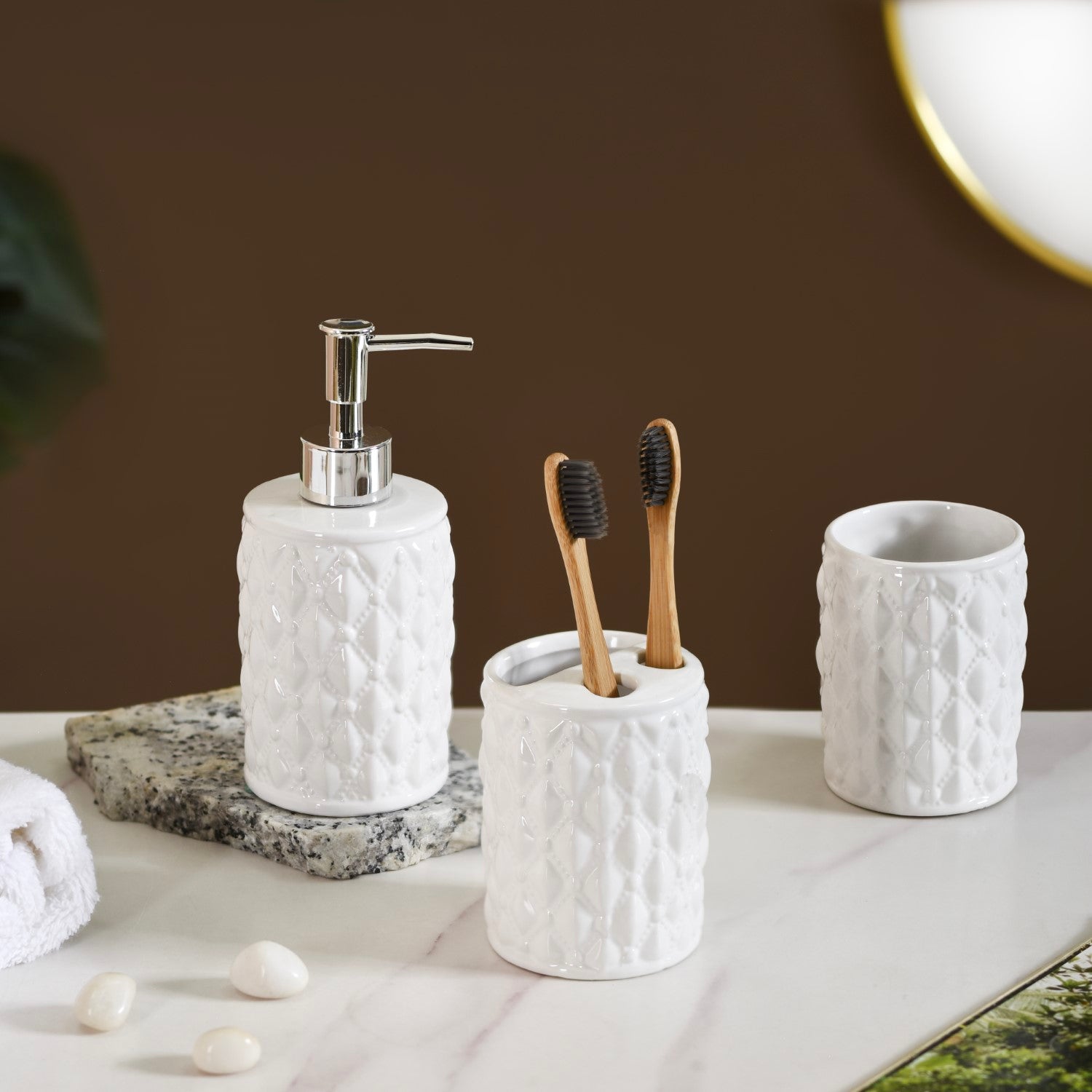 White Cross Knit Ceramic Bathroom Accessories Set Of 3