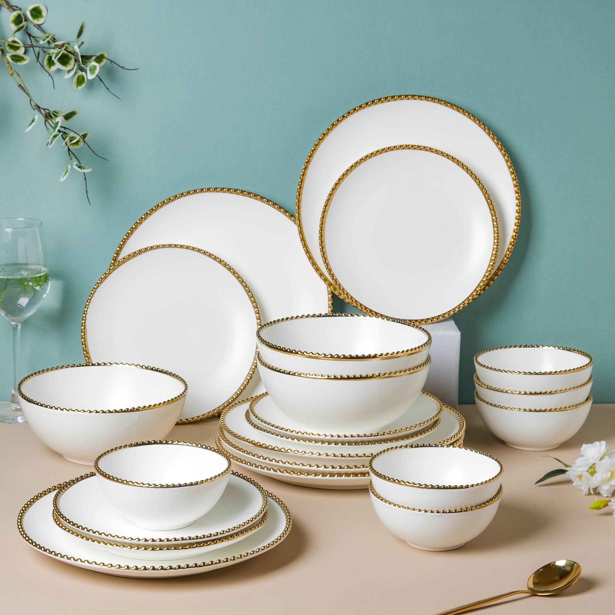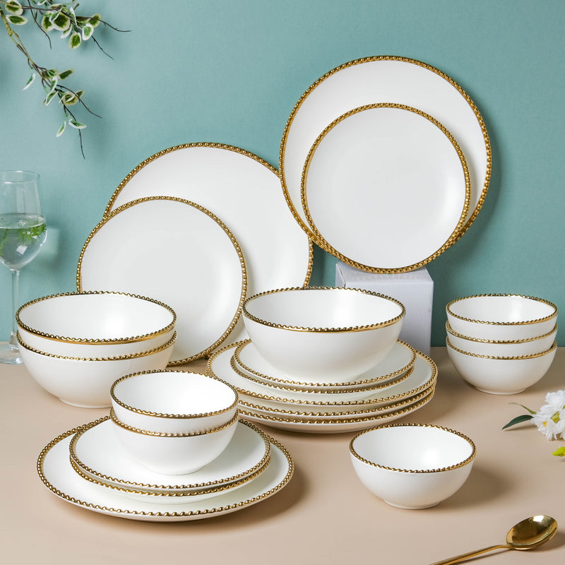 A dinner set designed to impress with its elegance and opulence. The stark white color of the ceramic dishes has been expertly glazed to provide a sleek regal finish. The plates and bowls are crowned with a ring of gold at the rim, adding to their lavishness. The dinner set consists of 6 dinner plates, 6 appetizer plates, 6 soup bowls which can also be used to serve snacks, and 3 serving bowls which may also be used to present mixed fruit or fresh vegetable salads on the table. The dinner set may be elegantly used to serve full meals during dinners or soirees. The contrasting gold rim against the white backdrop creates a luxe feel that elevates the glam quotient on the dining table.