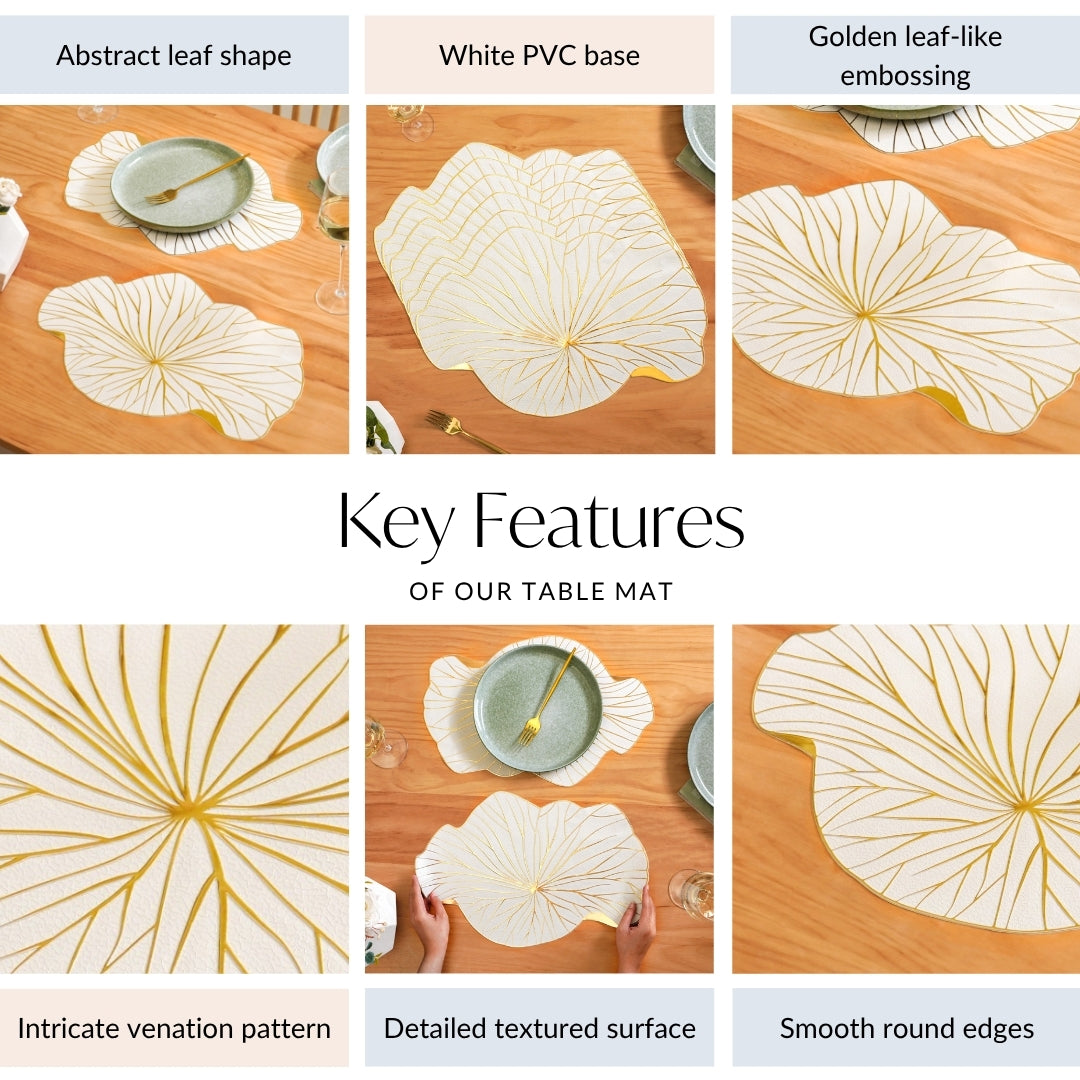 Design: These table mats break away from ordinary silhouettes. Each mat is crafted in white PVC and features golden leaf-like embossing for a luxe touch. The intricate venation pattern is textured for a layered, nature-inspired look. A finely detailed embossing adds both grip and elegance. Rounded edges soften the shape and keep the finish sleek. These placemats strike the perfect balance between organic design and modern utility.
