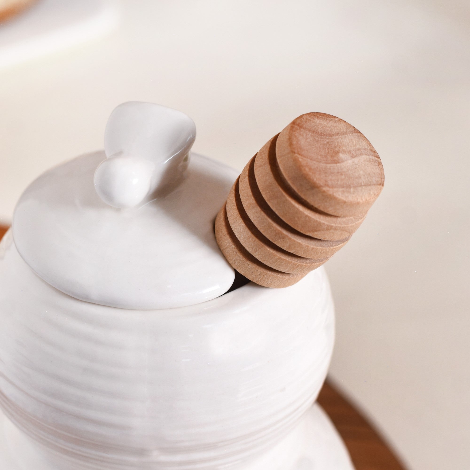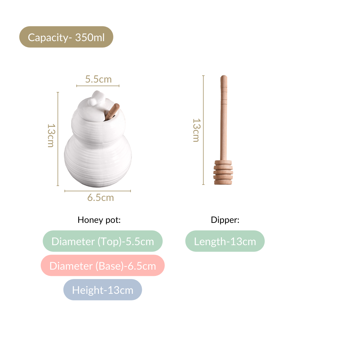 Utility: The honey pot's design ensures easy access to your honey, with the bee-shaped knob providing a secure grip. The non-porous ceramic prevents honey from absorbing into the pot, maintaining its flavour and consistency. The included wooden dipper makes serving honey effortless, enhancing your dining experience.