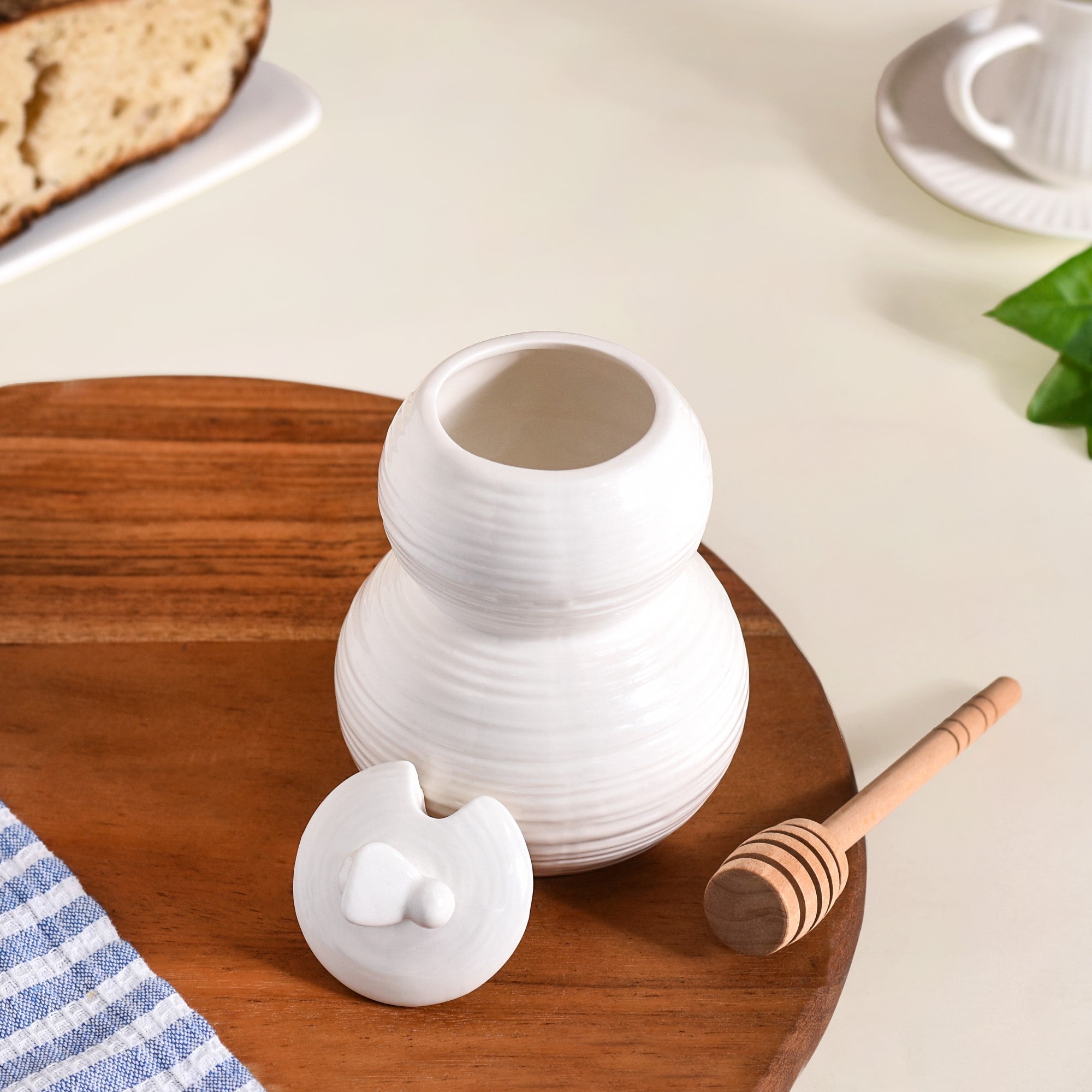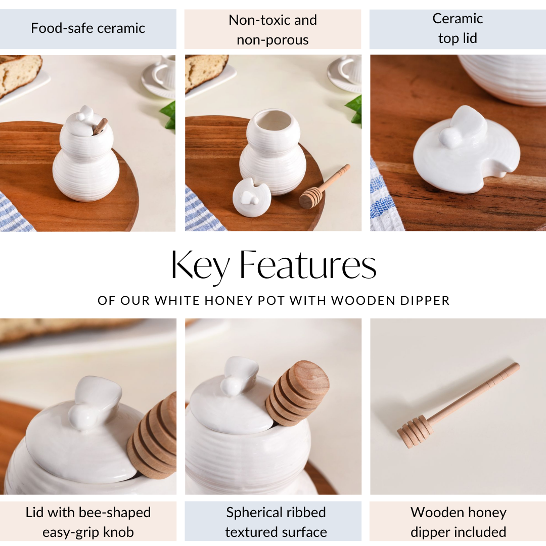 Design: The honey pot features a sleek, spherical ribbed texture that not only looks sophisticated but also enhances grip. Its ceramic top lid is adorned with a bee-shaped easy-grip knob, blending style with practicality. The pot includes a wooden dipper, perfectly designed for smooth honey dispensing.