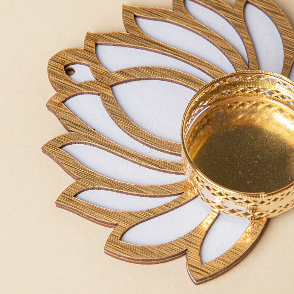 Celebrate an eco-friendly festive season with our wooden lotus tea light holder which is not just a festive essential for your home but also sustainable and reusable. The traditional combination of gold and white hues on the tea light holder looks beautiful on the wall shelves, floors, or other surfaces. The round golden metallic base is not only apt for wax candles but also for battery-operated lights. The white lotus candle holder can be reused by just changing the tealights.