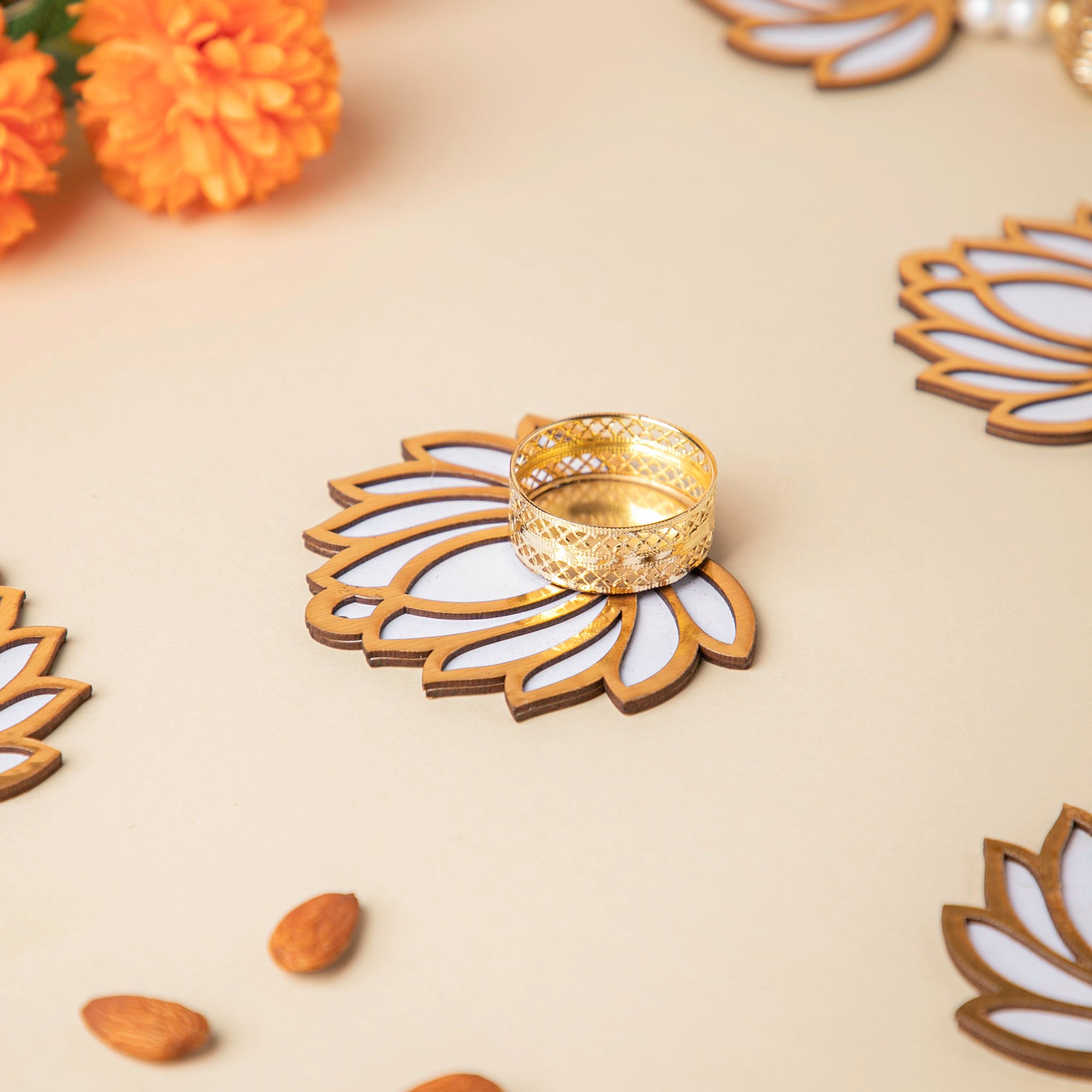 Nestip: Arrange these flowers in any design on the backdrop of an alpana or rangoli to bring out your creative side.