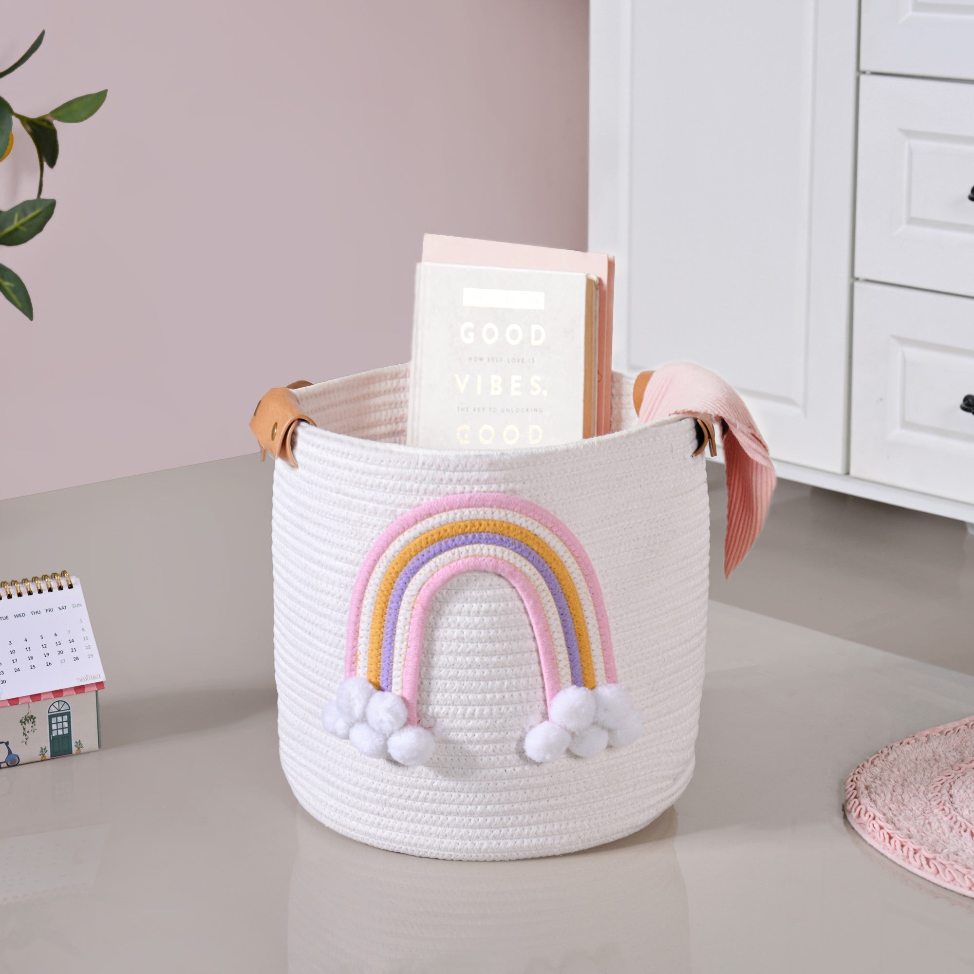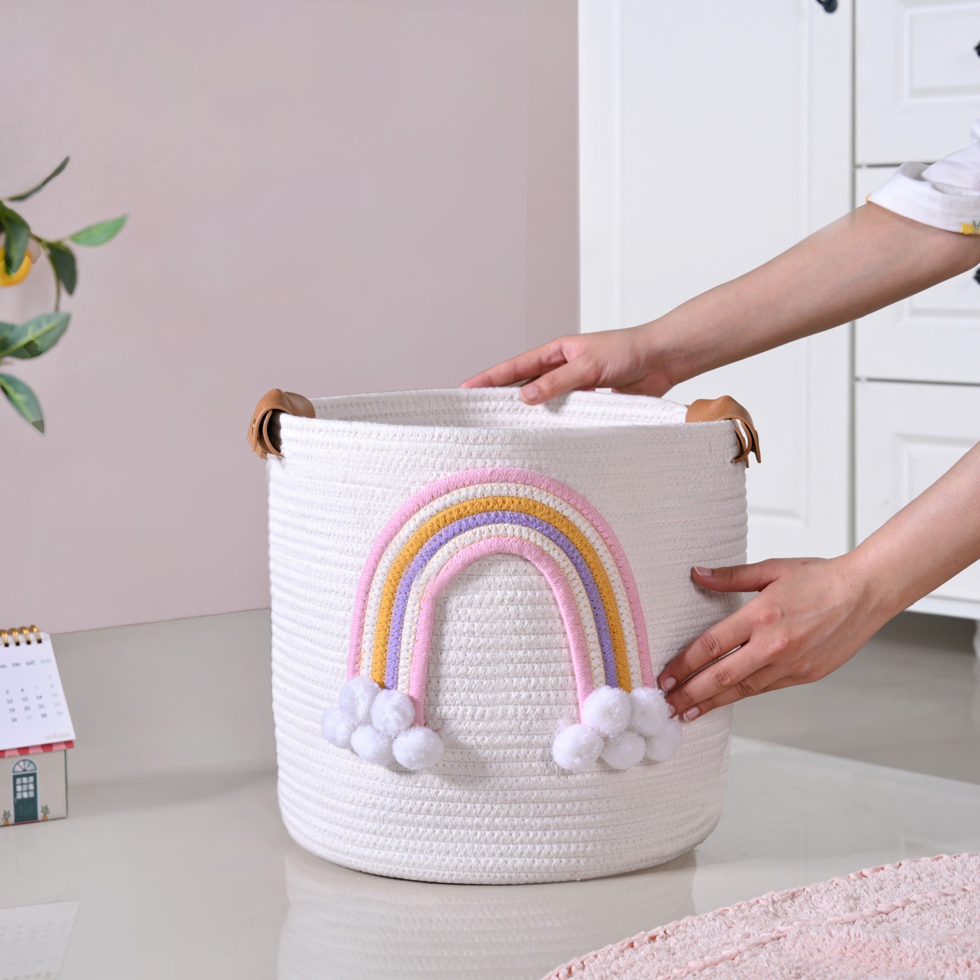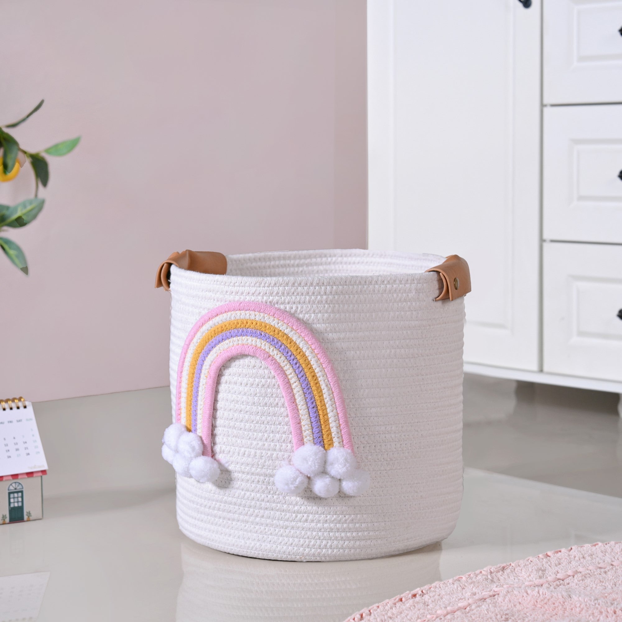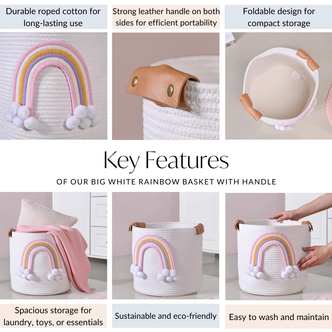 Design: Crafted in a soft off-white woven texture, this basket features a delicate pastel rainbow with fluffy pom-pom clouds for a playful touch. The sturdy brown leather handles add a dash of elegance while ensuring easy portability. Spacious yet lightweight, it’s designed to fit seamlessly into nurseries and bedrooms,