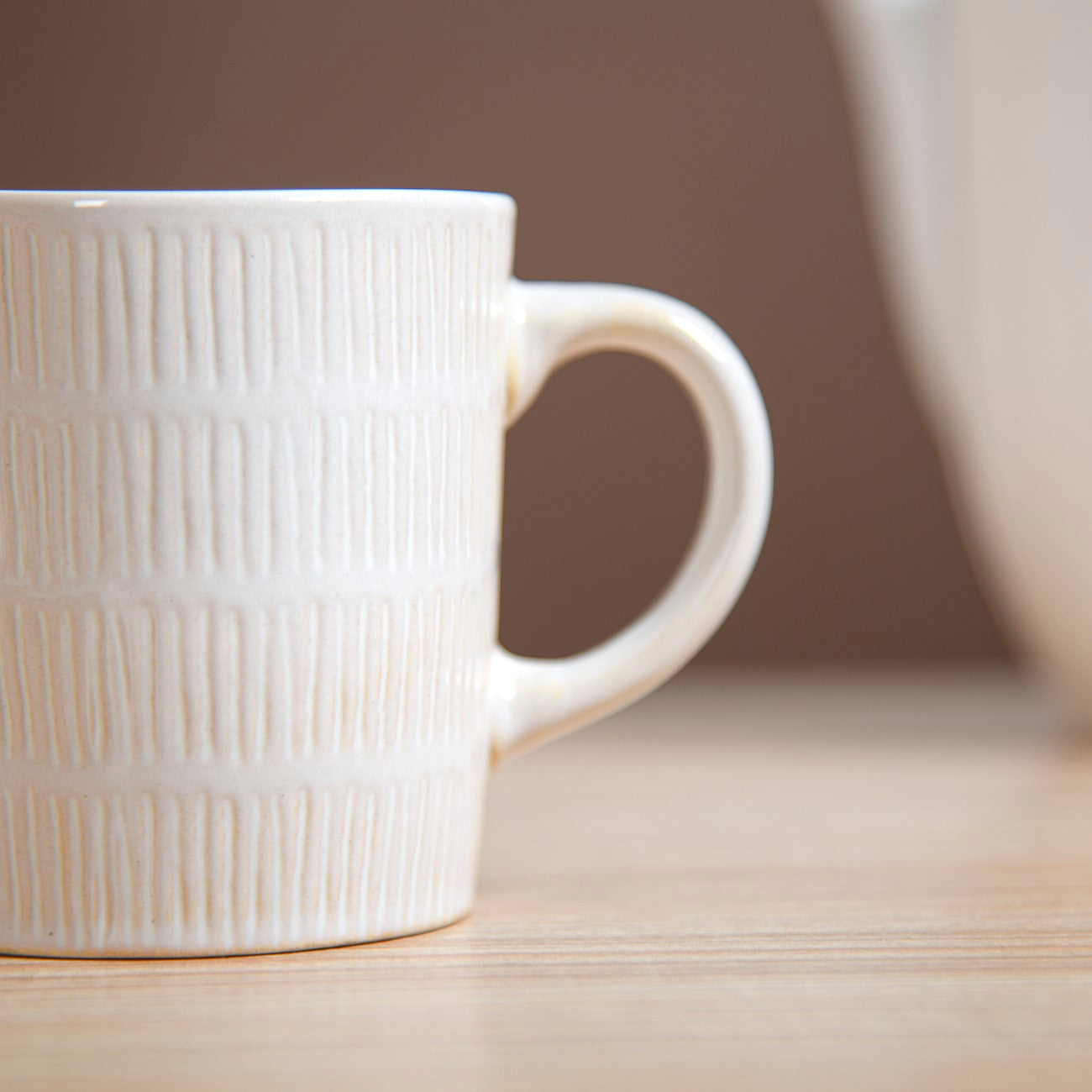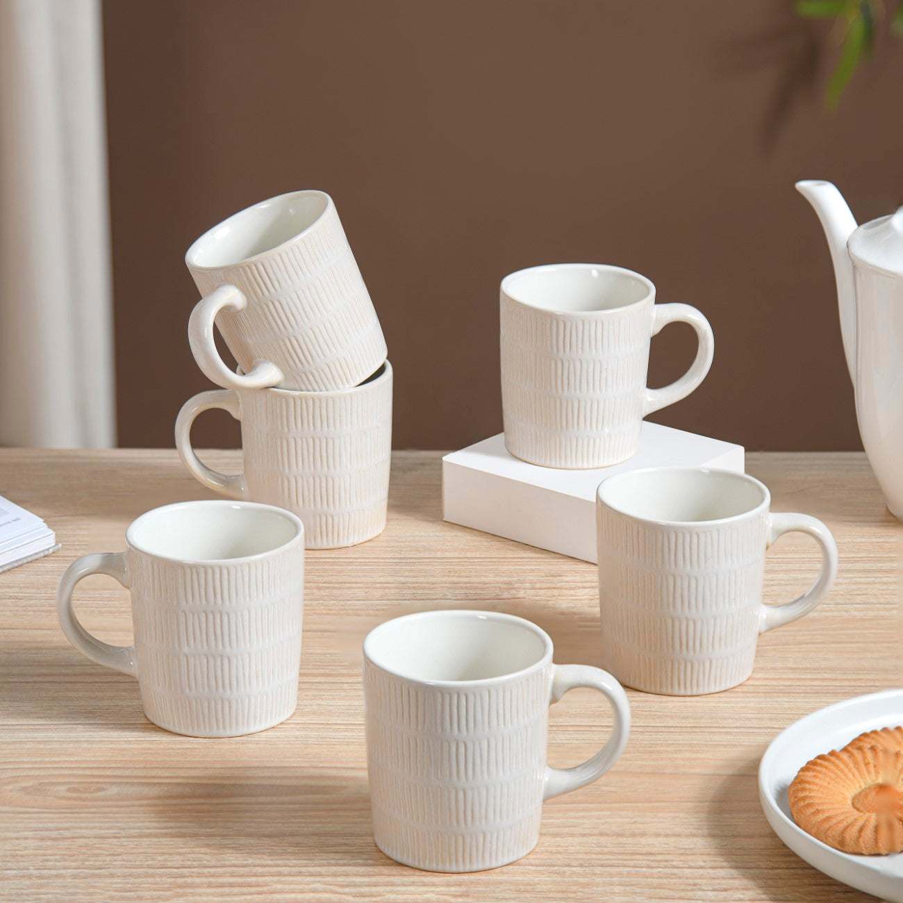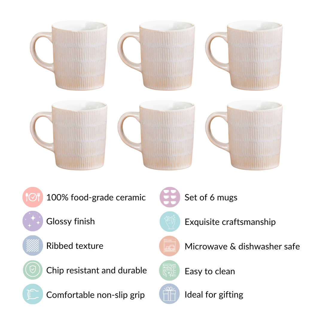 Introducing the epitome of elegance in coffee ware, our white ribbed coffee mug set. These cups are meticulously crafted to redefine your coffee experience. With a unique horizontal ribbed texture on the surface of the mugs in three distinct rows, they elevate the very essence of coffee enjoyment. Made with precision from high-quality ceramic, these mugs boast chip-resistant quality, ensuring they endure the test of time while keeping your coffee rituals mess-free. The comfortable non-slip grip guarantees confident handling, and their microwave and dishwasher compatibility makes them as practical as they are stylish.