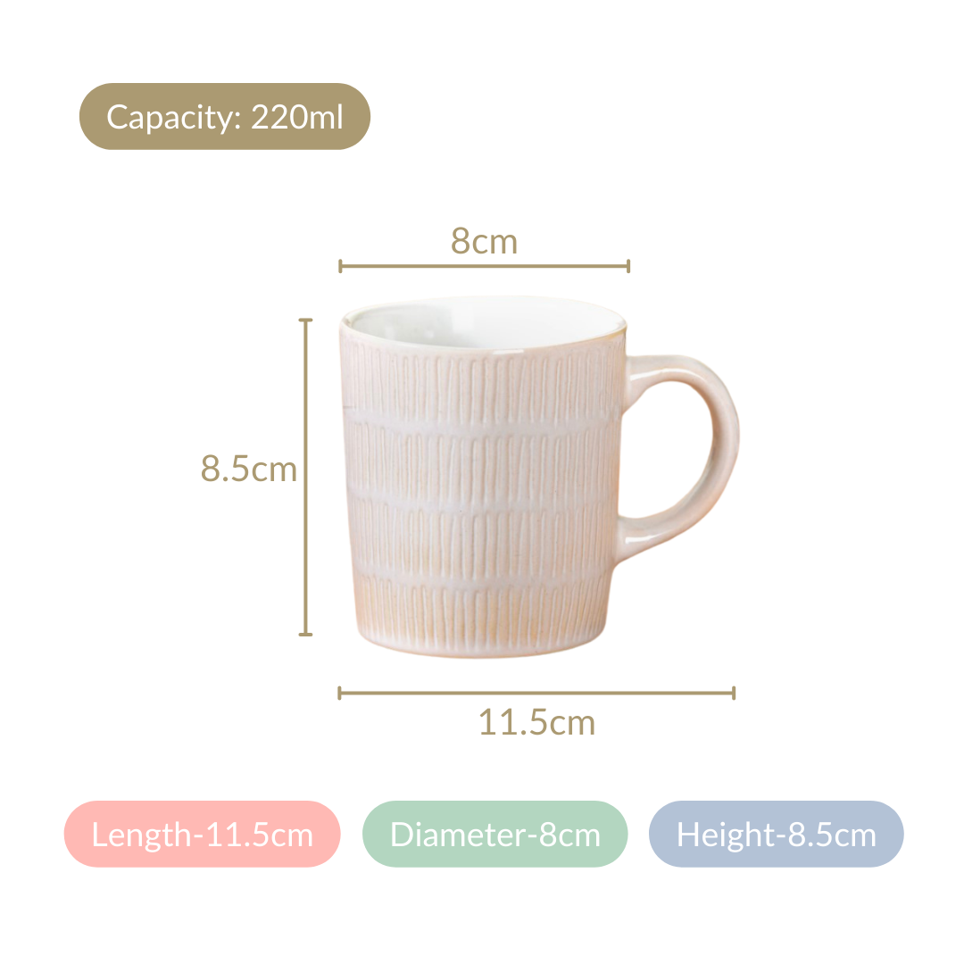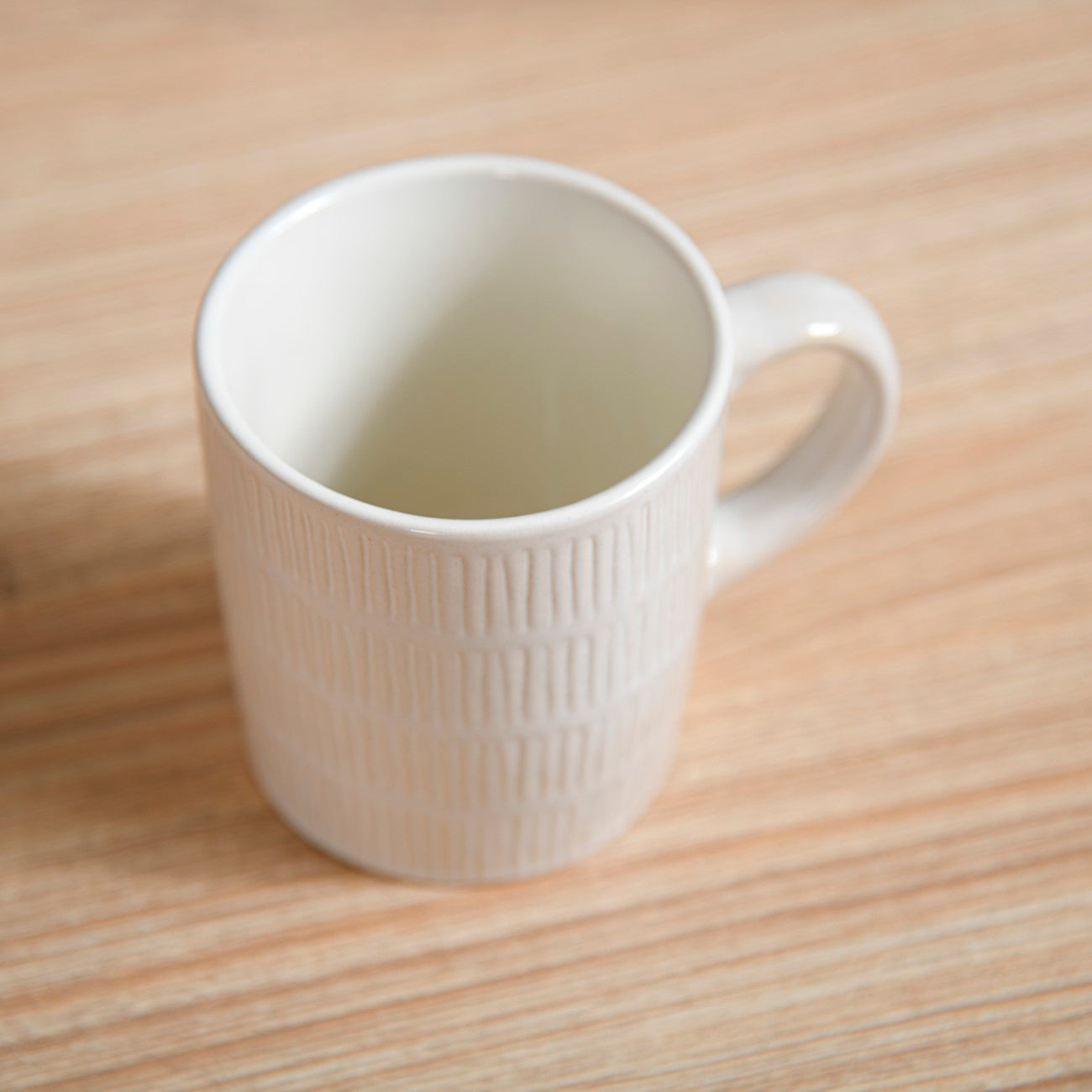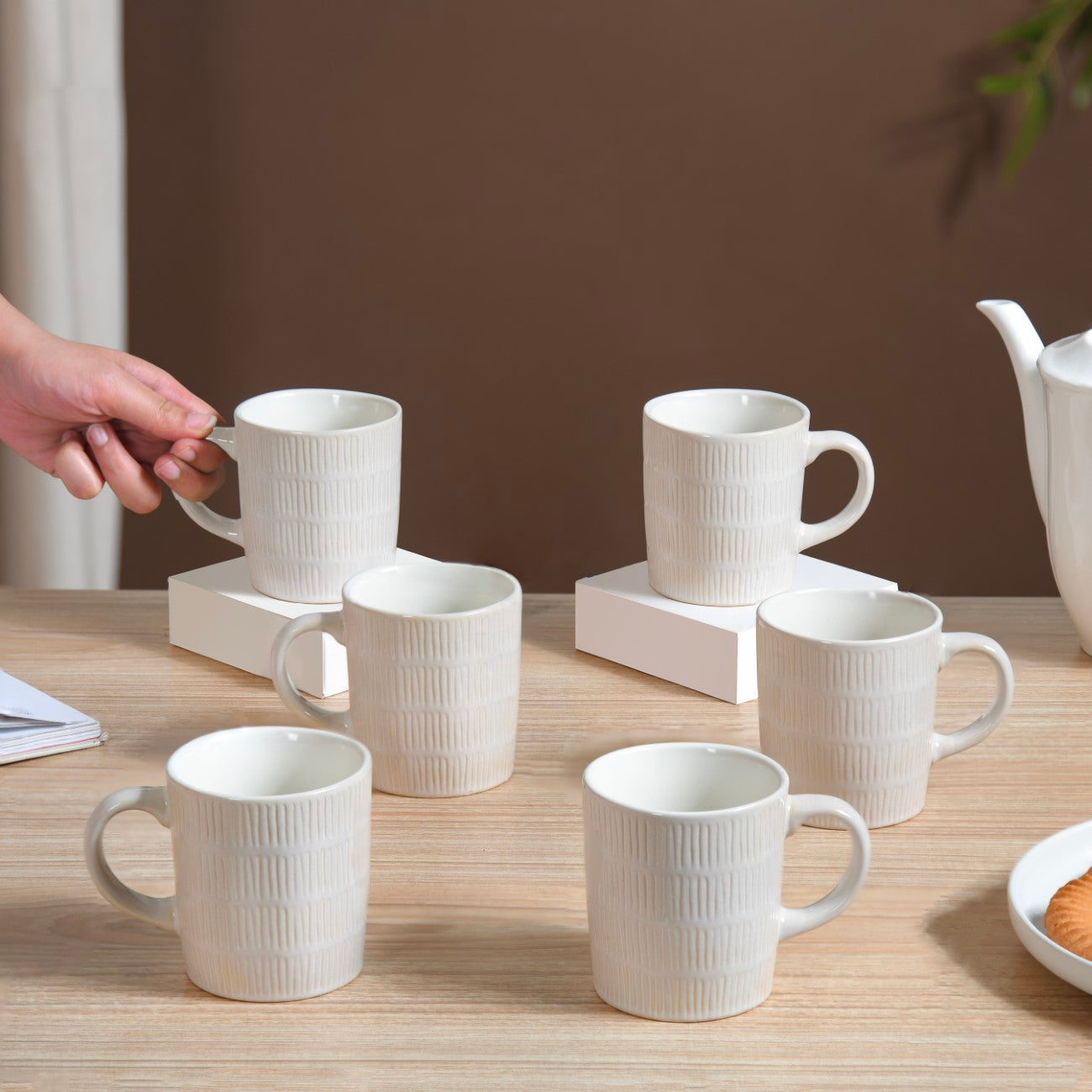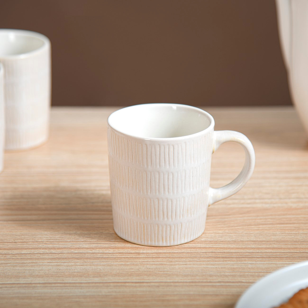 Introducing the epitome of elegance in coffee ware, our white ribbed coffee mug set. These cups are meticulously crafted to redefine your coffee experience. With a unique horizontal ribbed texture on the surface of the mugs in three distinct rows, they elevate the very essence of coffee enjoyment. Made with precision from high-quality ceramic, these mugs boast chip-resistant quality, ensuring they endure the test of time while keeping your coffee rituals mess-free. The comfortable non-slip grip guarantees confident handling, and their microwave and dishwasher compatibility makes them as practical as they are stylish.