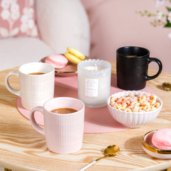 Introducing the epitome of elegance in coffee ware, our white ribbed coffee mug set. These cups are meticulously crafted to redefine your coffee experience. With a unique horizontal ribbed texture on the surface of the mugs in three distinct rows, they elevate the very essence of coffee enjoyment. Made with precision from high-quality ceramic, these mugs boast chip-resistant quality, ensuring they endure the test of time while keeping your coffee rituals mess-free. The comfortable non-slip grip guarantees confident handling, and their microwave and dishwasher compatibility makes them as practical as they are stylish.