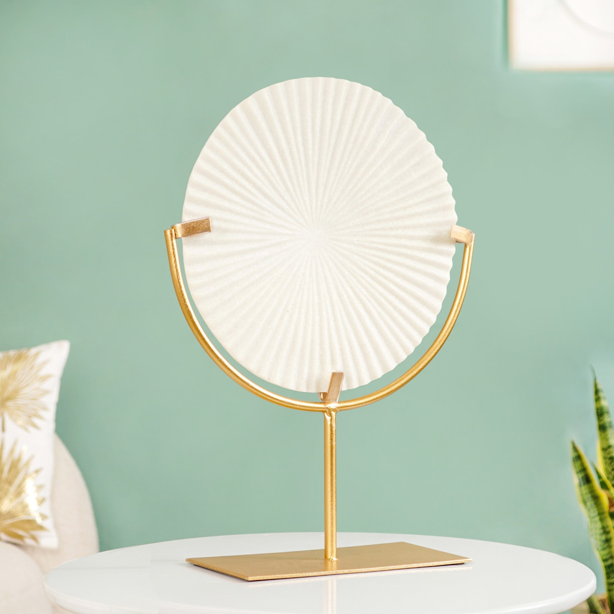 Design: This sculpture features a ribbed, circular disk crafted from high-quality resin, mounted on a sleek, modern stand. Its minimalist aesthetic, clean lines, and geometric appeal make it a versatile art piece for living rooms, shelves, or console tables. Designed to blend with both modern and classic interiors, this home decor object exudes elegance while serving as a statement art piece. The product requires simple assembly, with the disk placed separately on the stand.