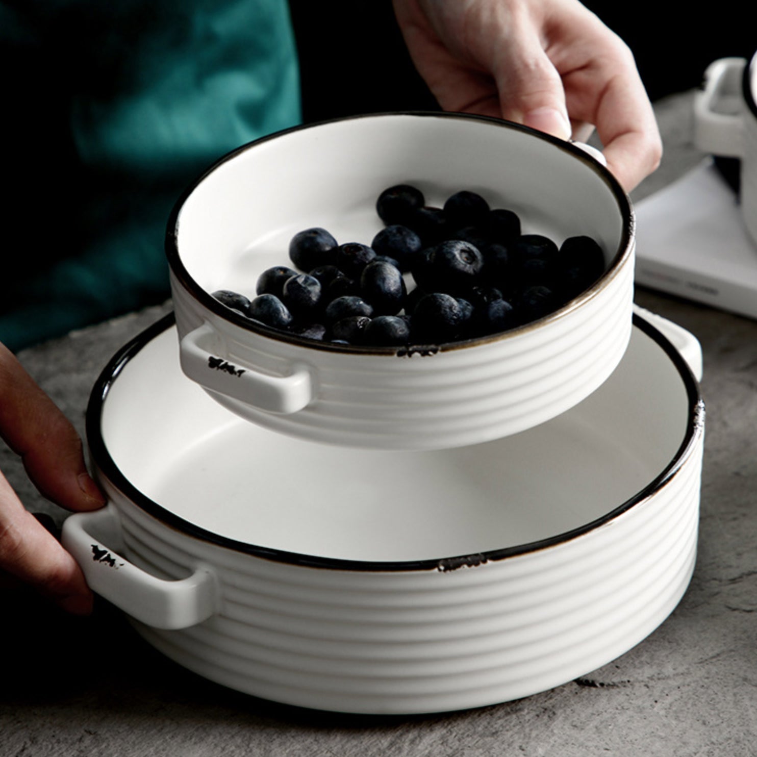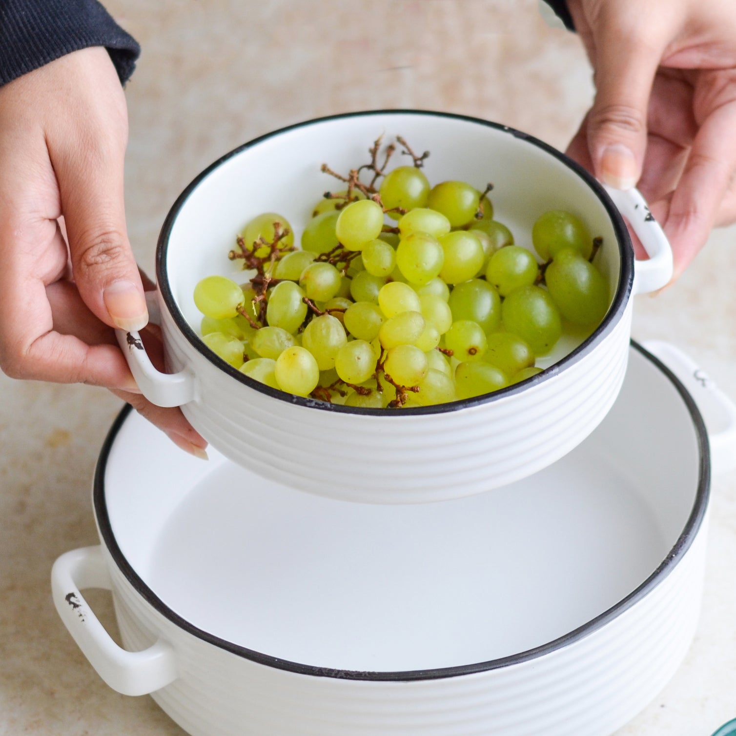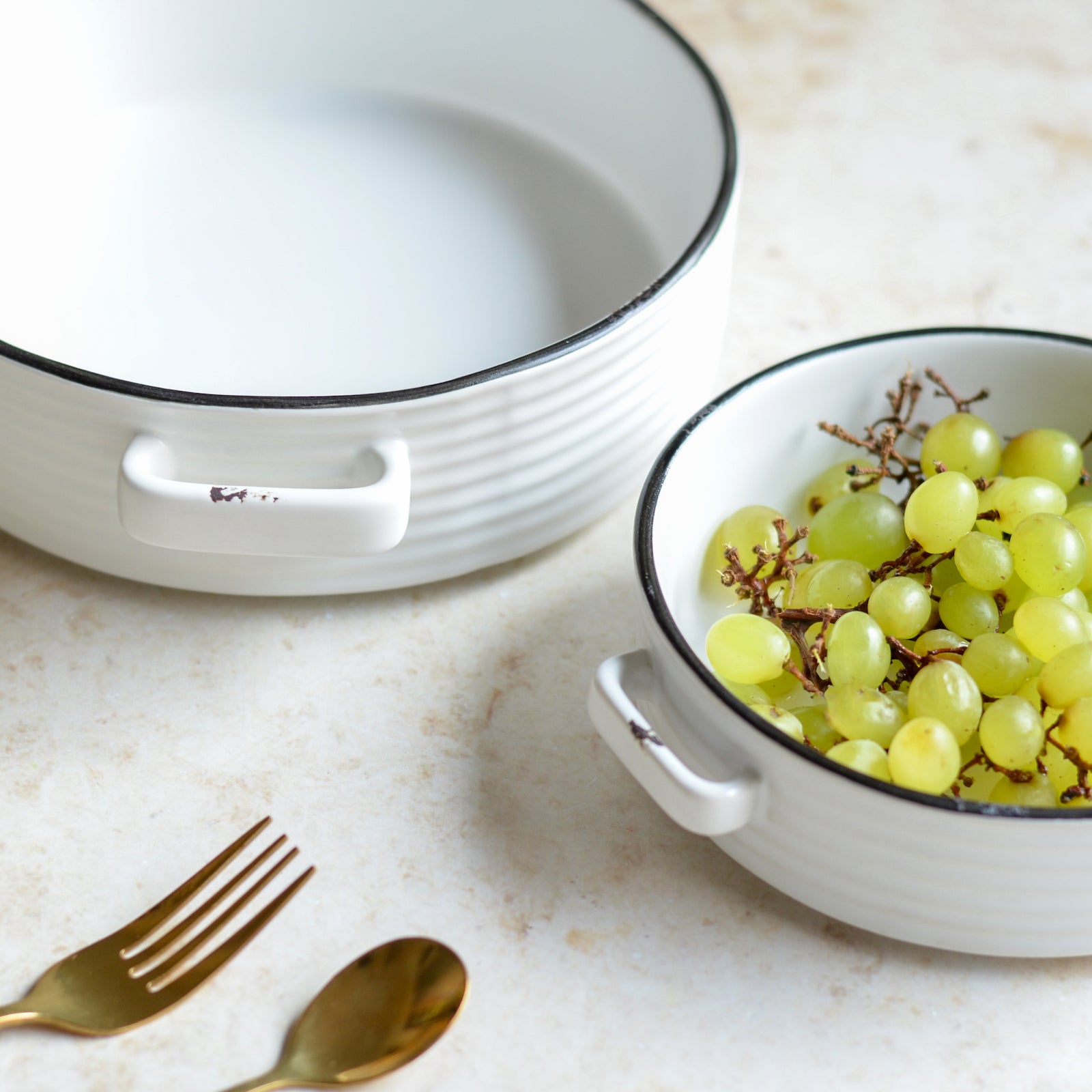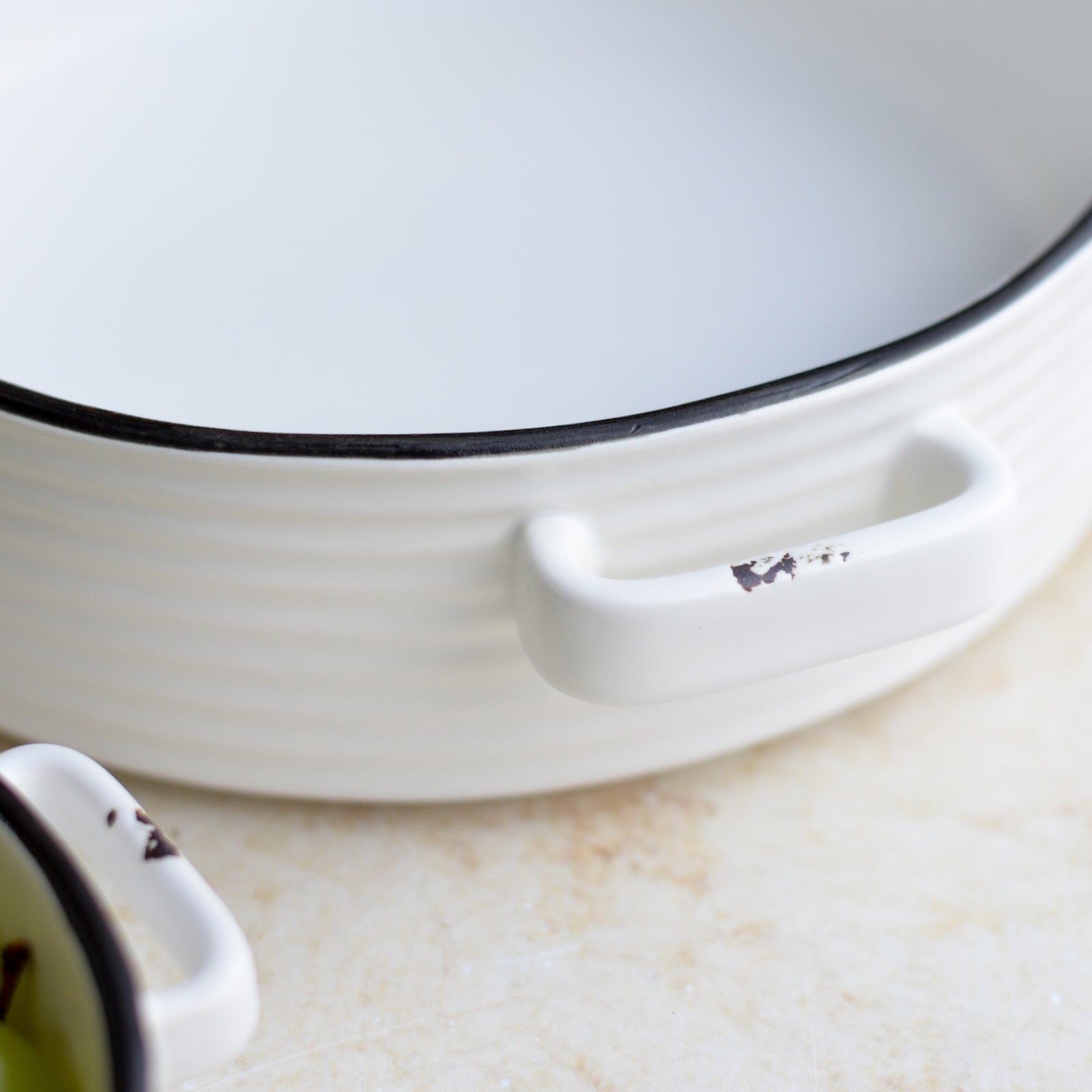 Complete the household range of serve ware with the white serving dishes that are available in 2 sizes. The serving bowls have a distressed look on the handles and surface to add a metallic rustic vibe that can be paired with all kinds of dinner plates, snack plates and bowls. The handles on both side help carry hot food to the table. The bowl can be used regularly or on special occasions. The spots on the dish are a part of the design and are not defects.