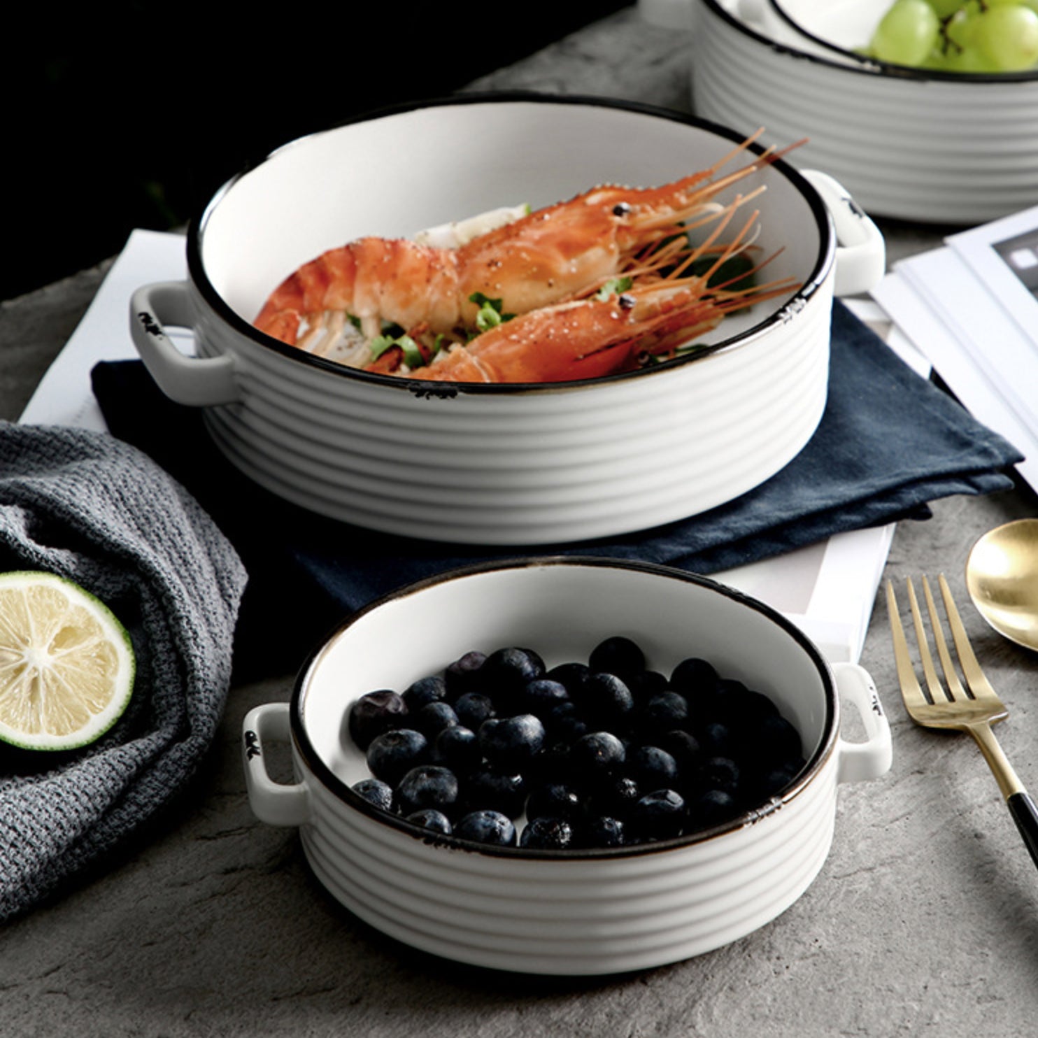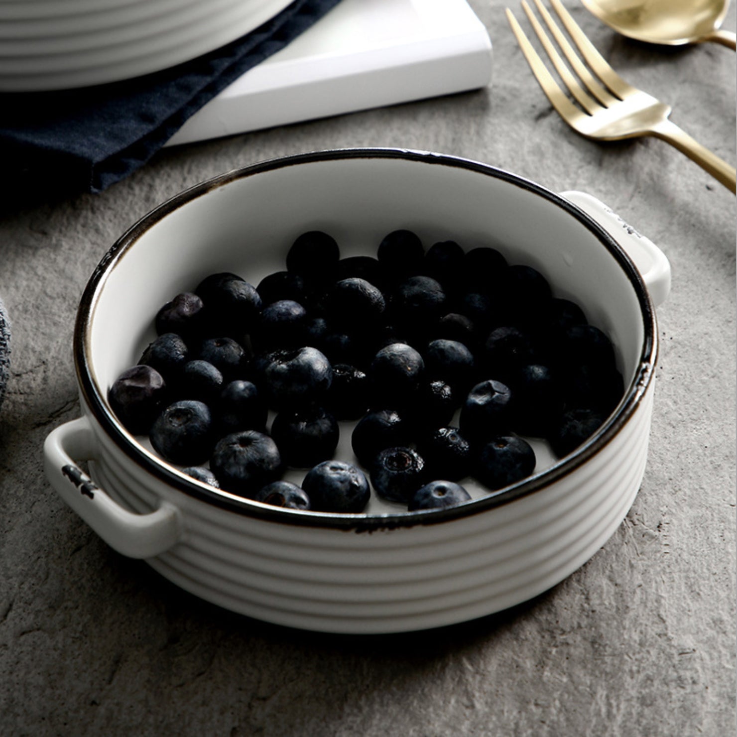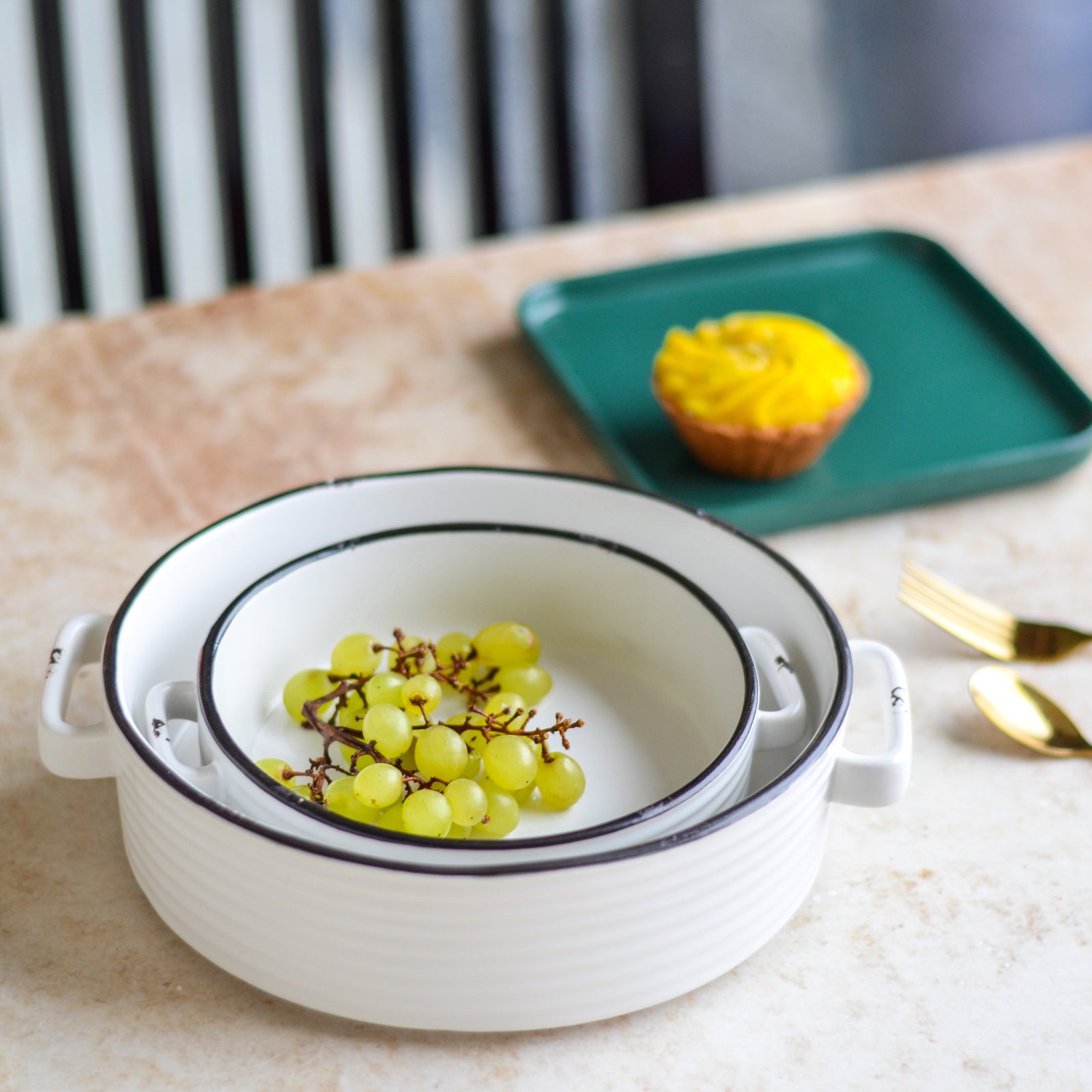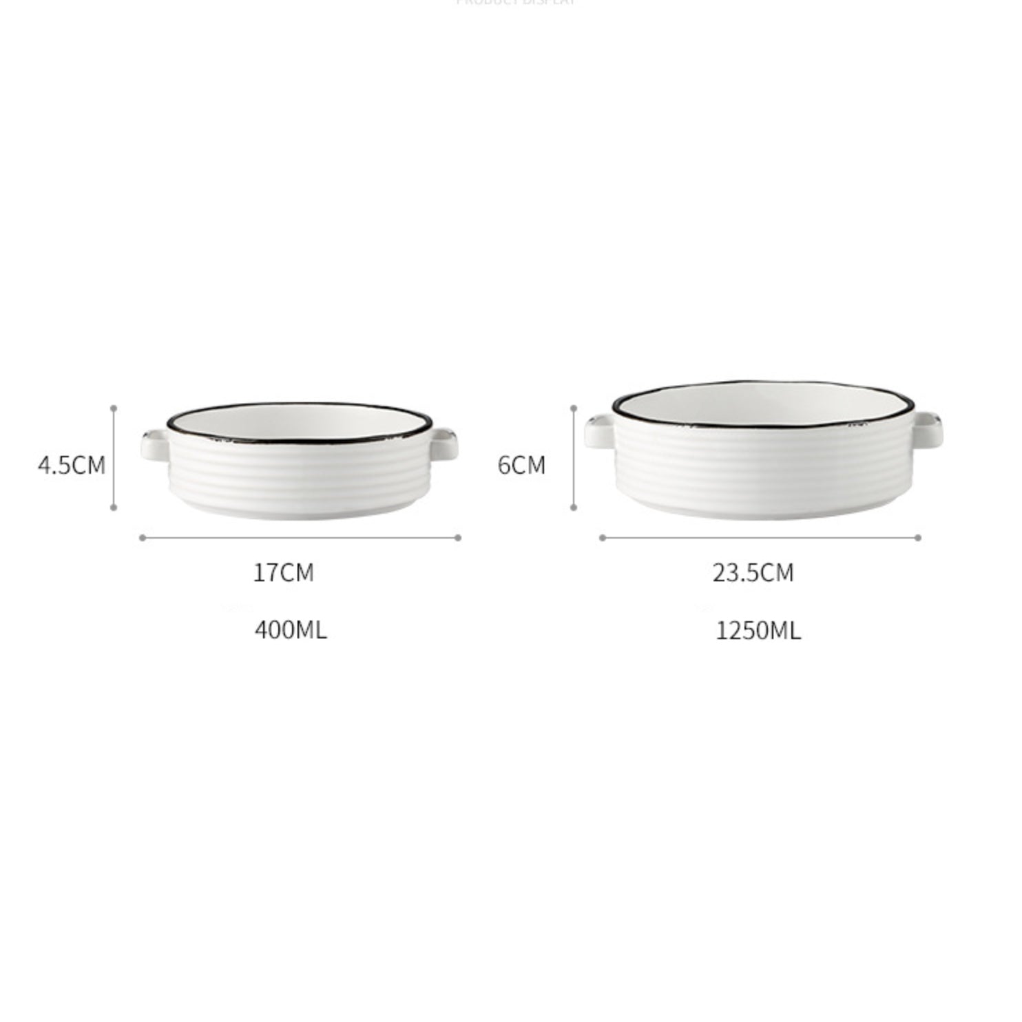 Complete the household range of serve ware with the white serving dishes that are available in 2 sizes. The serving bowls have a distressed look on the handles and surface to add a metallic rustic vibe that can be paired with all kinds of dinner plates, snack plates and bowls. The handles on both side help carry hot food to the table. The bowl can be used regularly or on special occasions. The spots on the dish are a part of the design and are not defects.