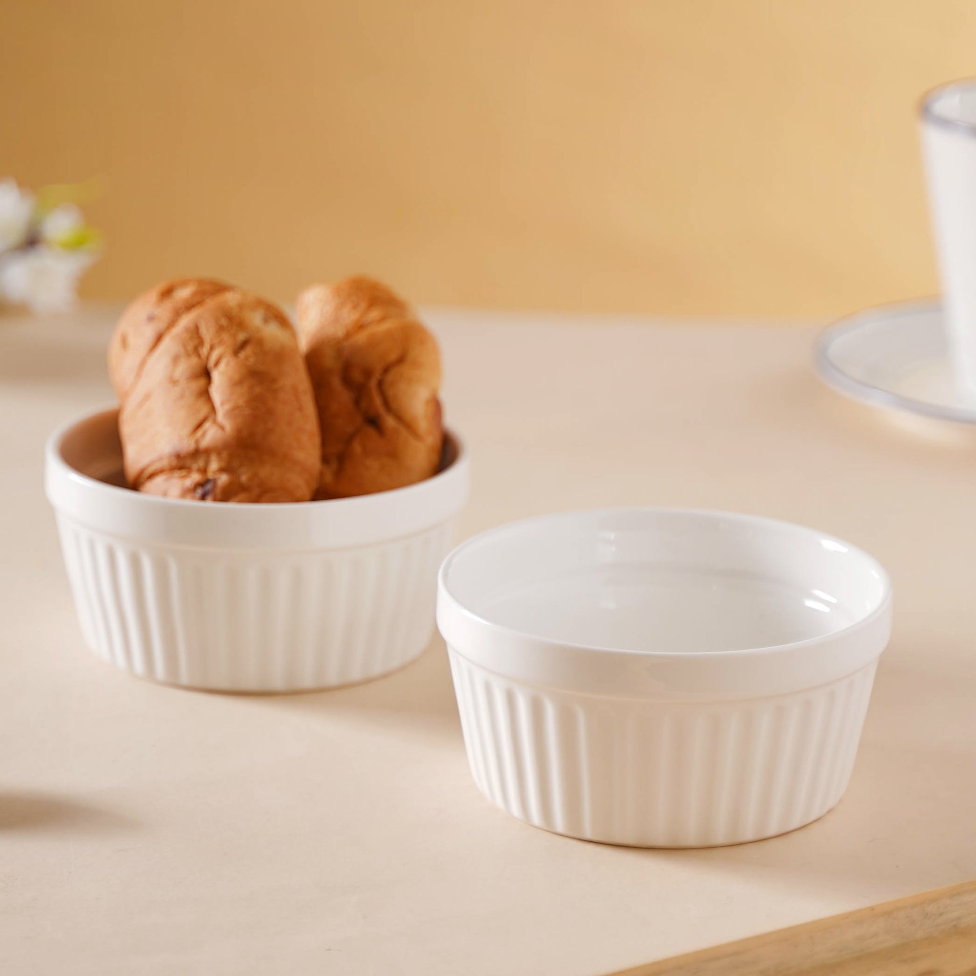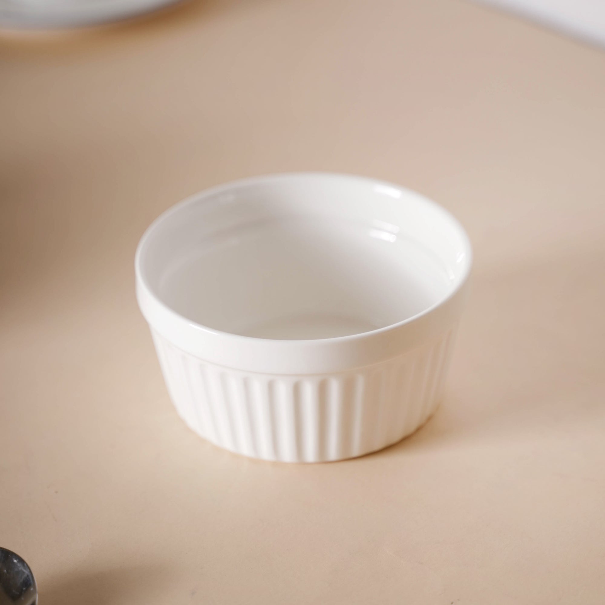 The white serving bowl with ribbed lines on the surface is ideal for serving pasta, stew, noodles, or snacks of any kind. The ceramic serving bowl can be used for baking desserts like custards or for serving berries or salads. The textured stripes give it an excellent appeal that can fit into any decor.