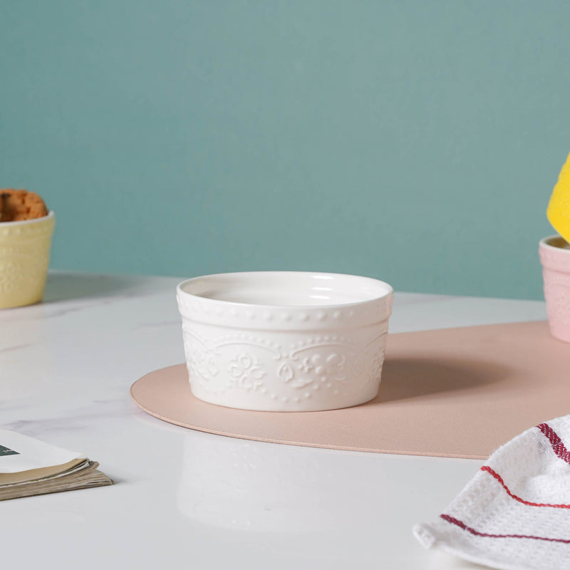 The chic snack bowl in pristine white is accentuated with intricate patterns which liven up any minimal table decor. The microwave-safe bowl is an ideal serving bowl for chips, munchies, and biscuits at high-tea events. One can even serve sweet treats such as pudding, cake slices, and desserts in the engraved bowl.