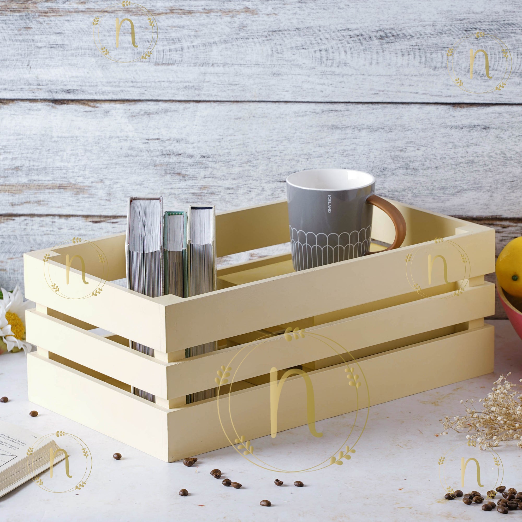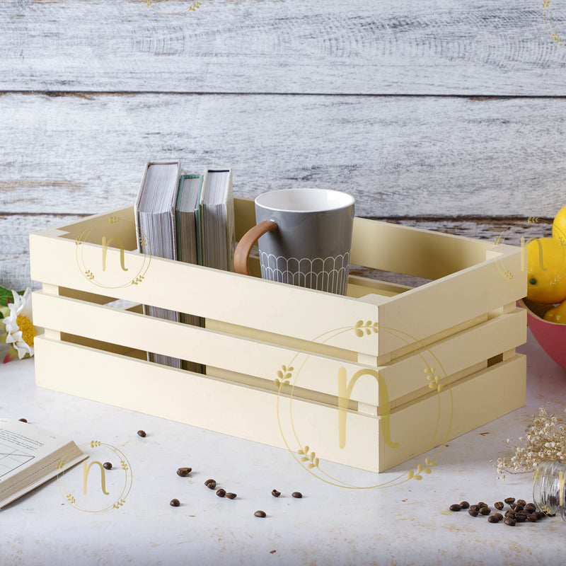 All-purpose wooden crate made with good quality wood is a very useful addition to any house. Off-white in colour, the wooden container can be used to store toiletries, make-up, newspapers, books and kitchen utensils. The wooden storage box can also be used as a toy storage for kids. It is lightweight and durable. The crate can be used to stack books and coffee cups in the reading nook. It can also be used as a gift hamper tray to create a basket of goodies.