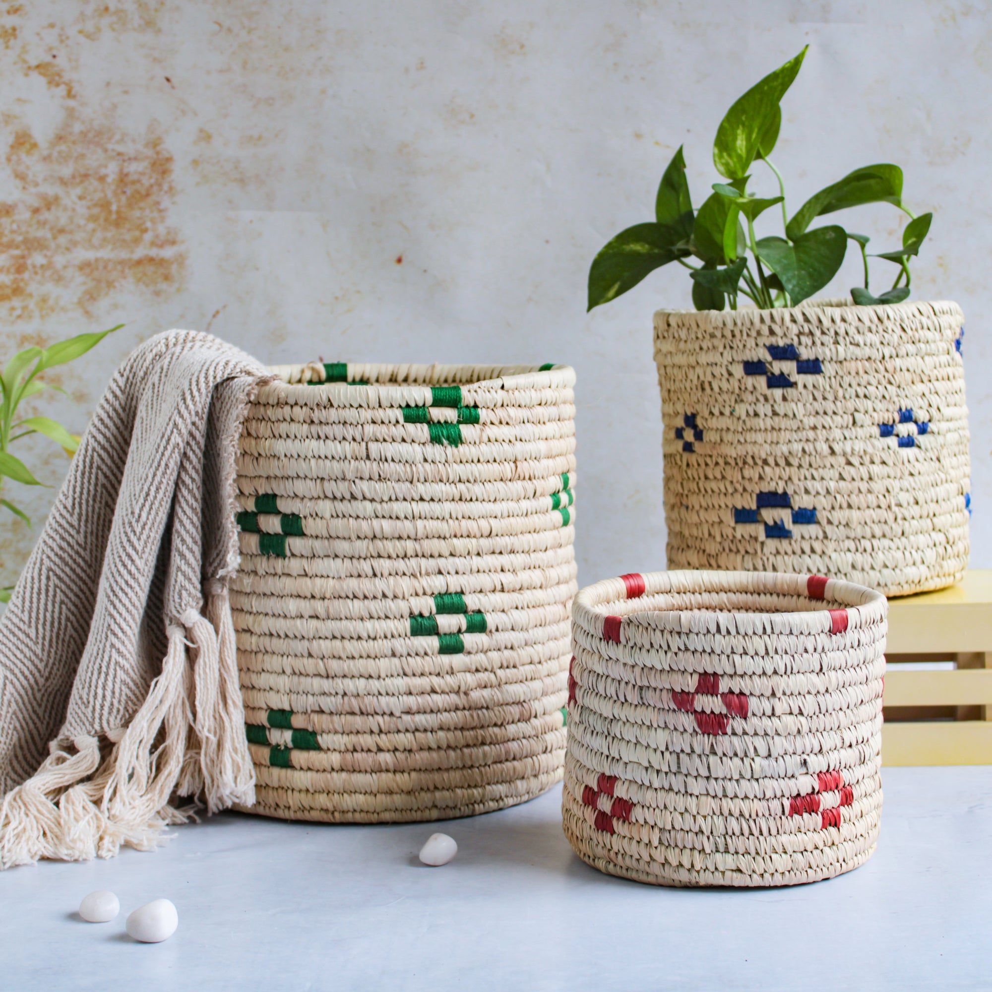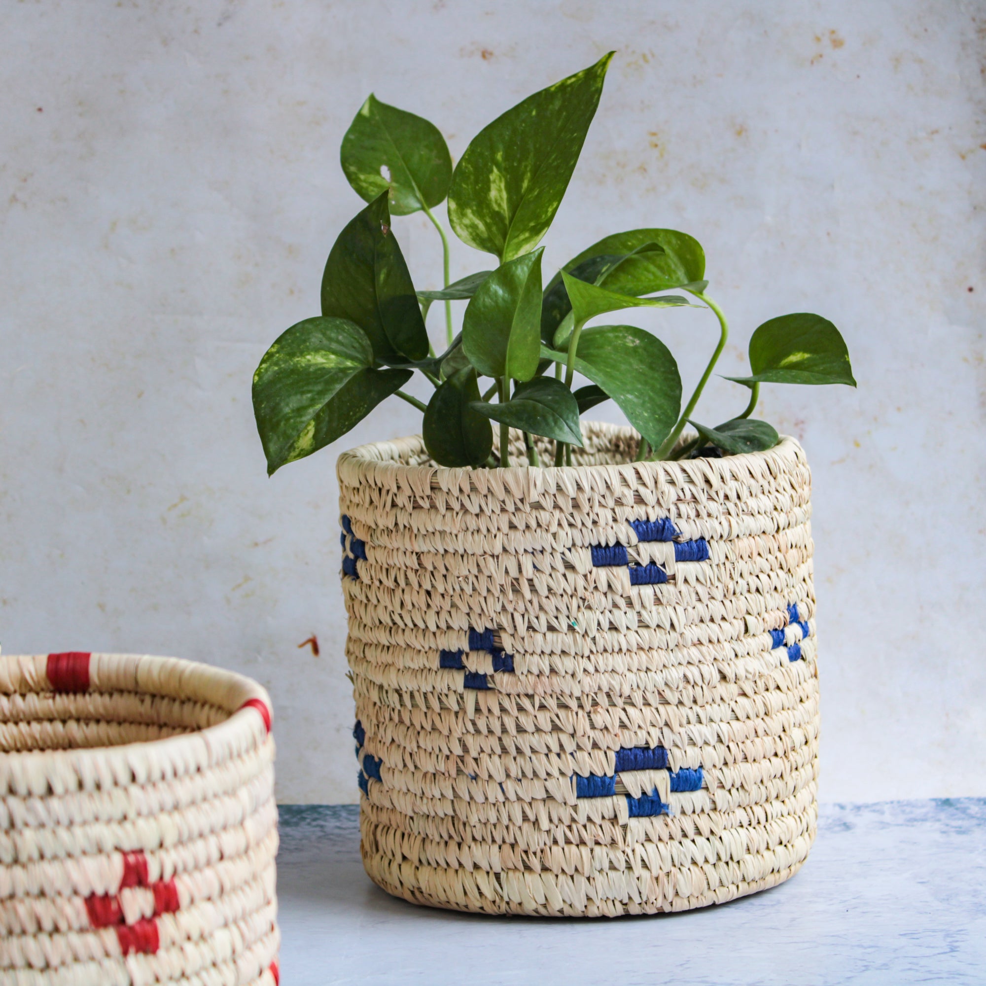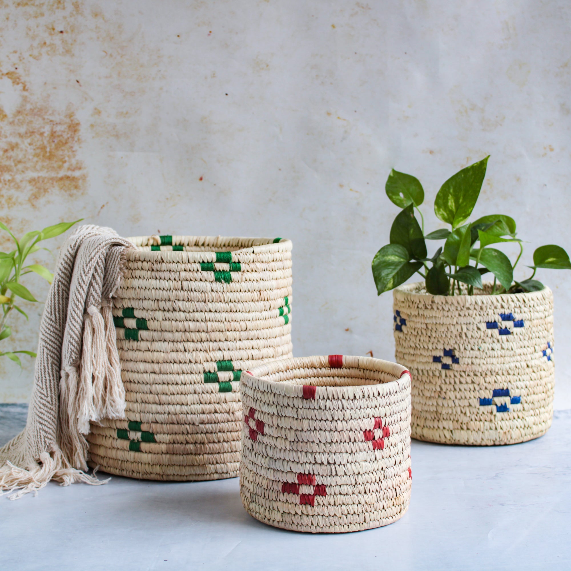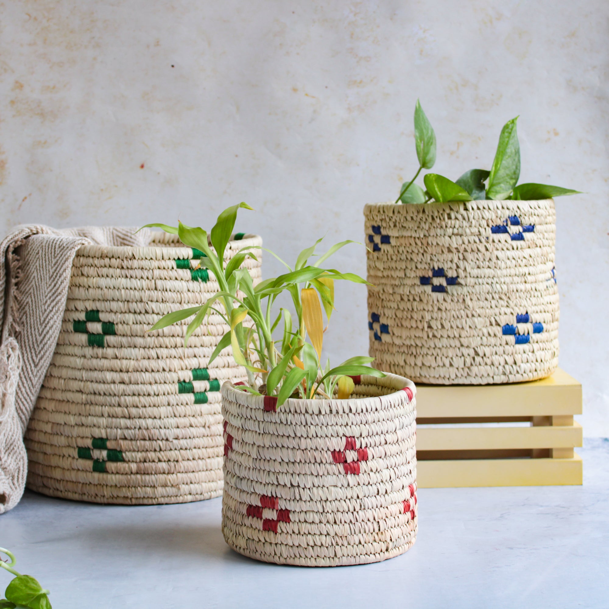 Add to an eco-friendly gardening collection by indulging in the handmade sabai planters. The handmade planters come in a set of 3 variable sizes - large, medium and small. Weaved with extreme care and intricacy, the handmade plant pots are ideal for planting little flowers or succulents, along with doubling as decorative accents on a balcony, console table, or mantelpiece. The eco-friendly planters retain their natural color and each have simple cross/plus signs weaved onto them and dyed using completely organic vegetable colours, which adds to their minimal aesthetic. The large one has bottle green signs, the medium one has navy blue ones, and the small one has red plus symbols.