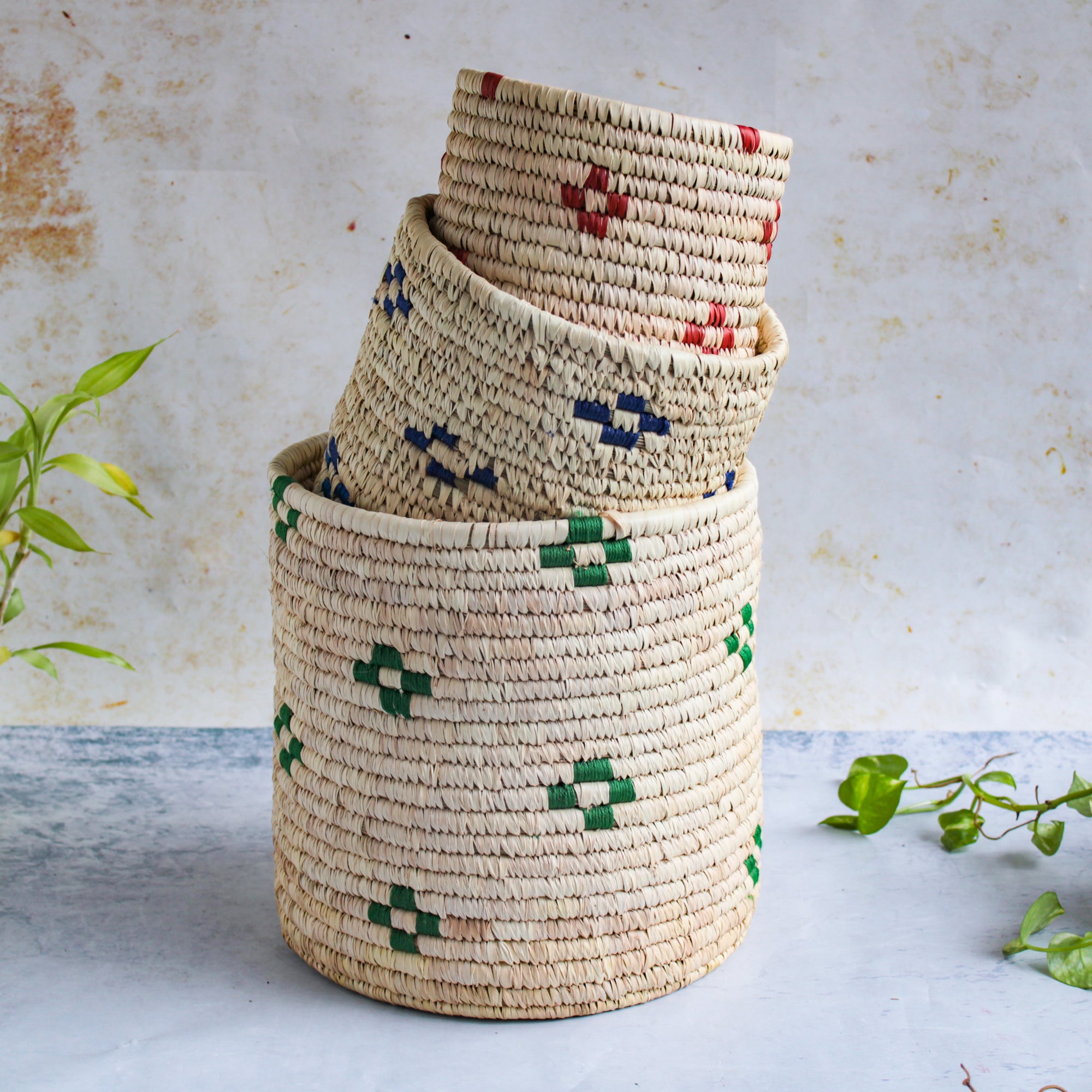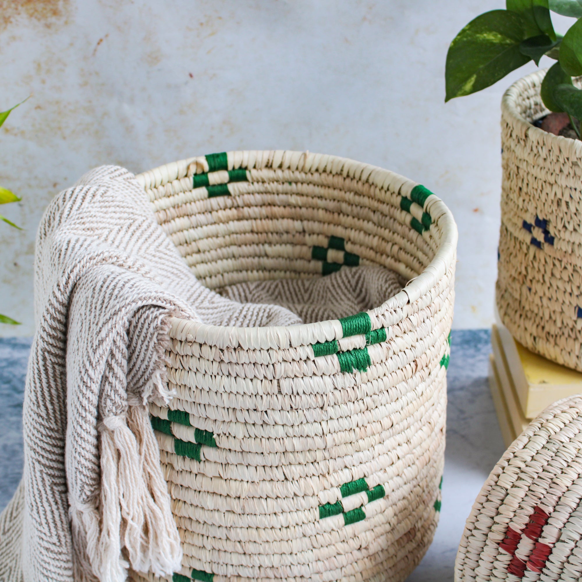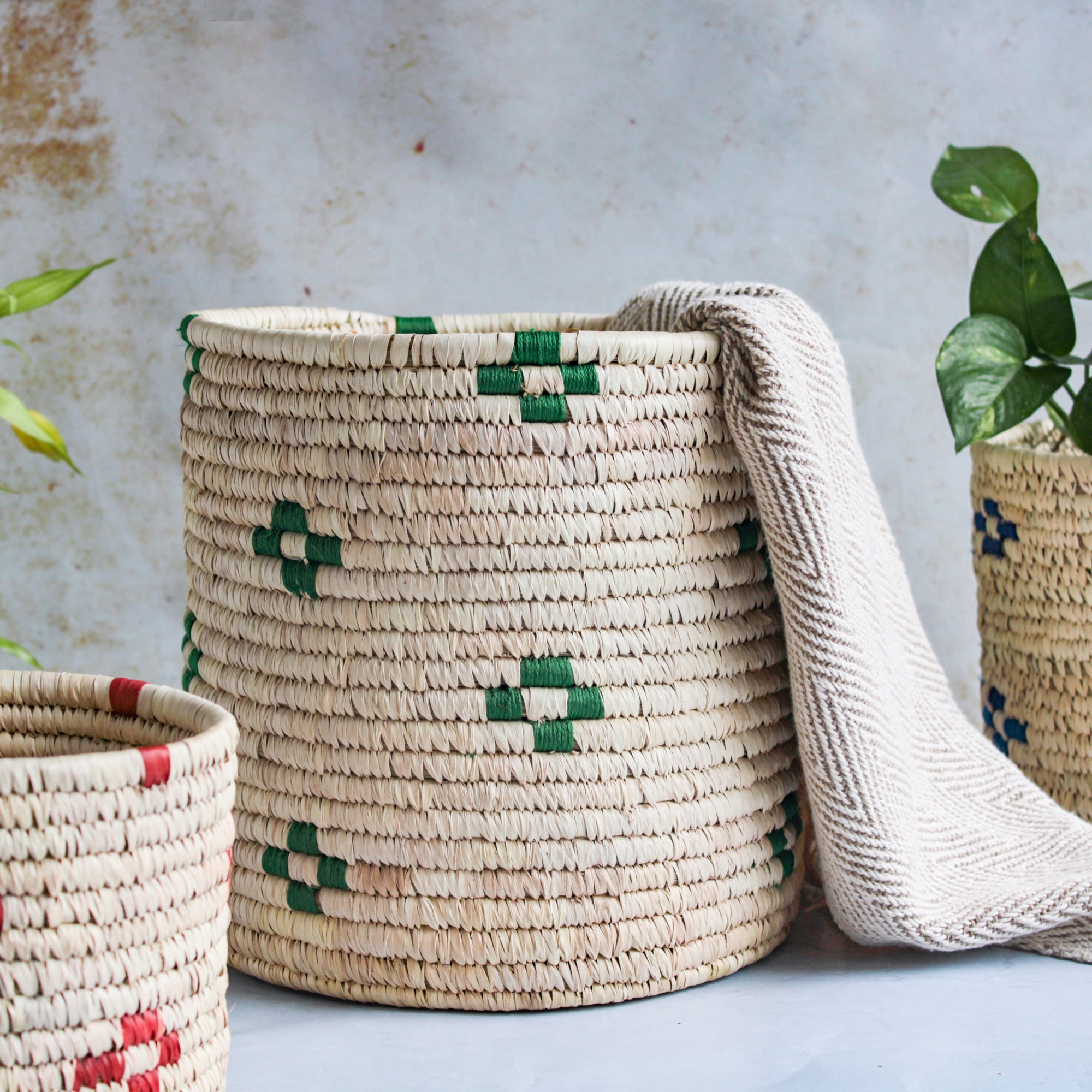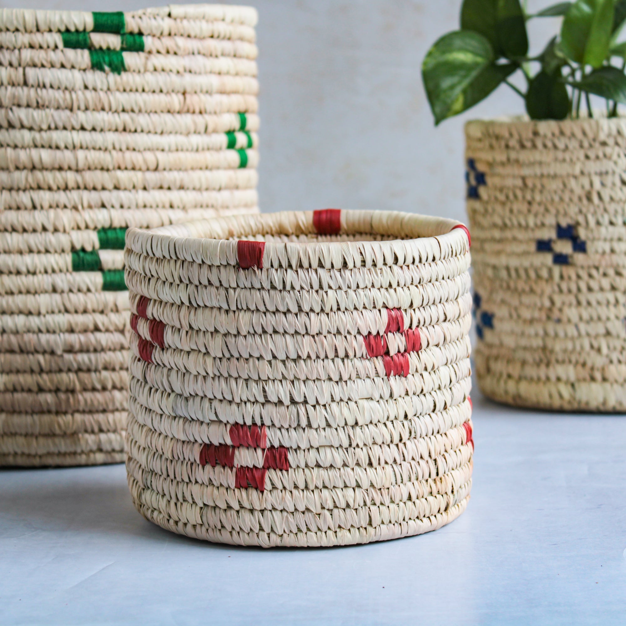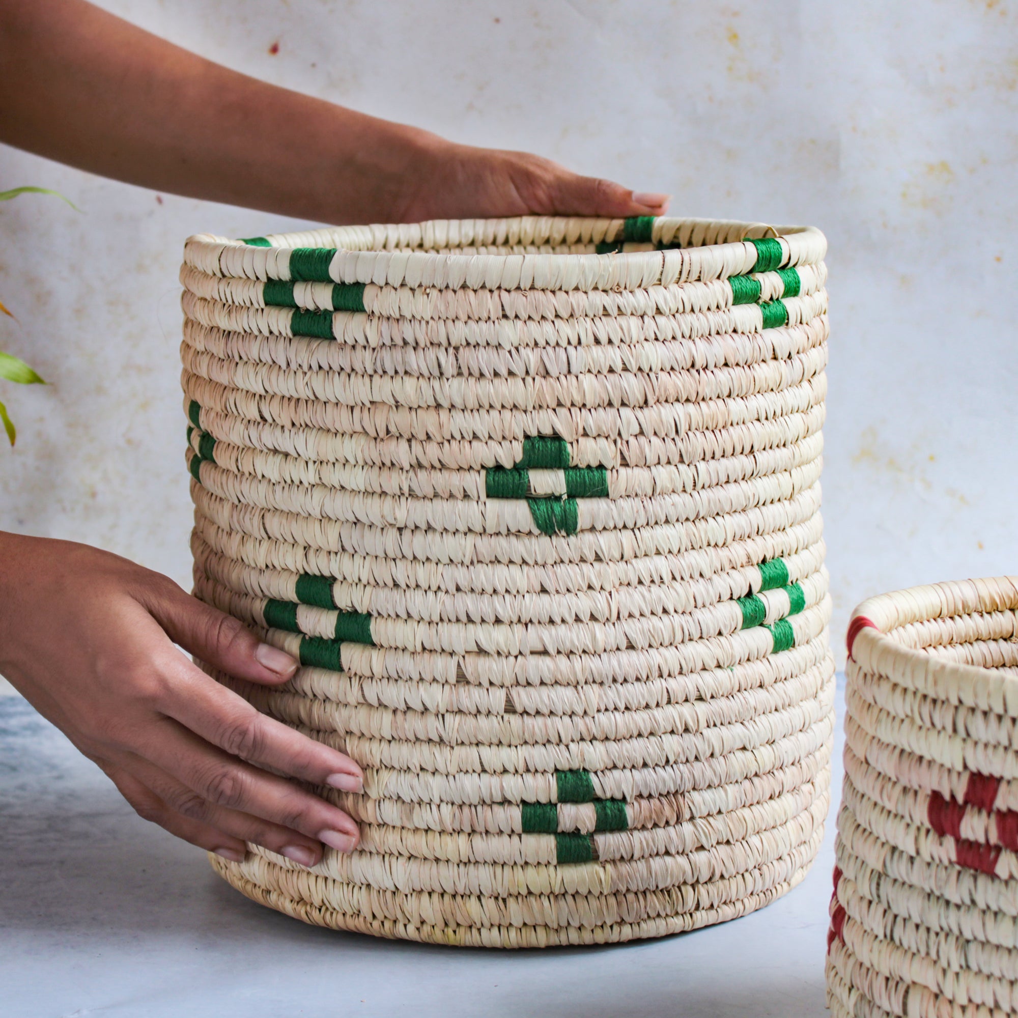 Add to an eco-friendly gardening collection by indulging in the handmade sabai planters. The handmade planters come in a set of 3 variable sizes - large, medium and small. Weaved with extreme care and intricacy, the handmade plant pots are ideal for planting little flowers or succulents, along with doubling as decorative accents on a balcony, console table, or mantelpiece. The eco-friendly planters retain their natural color and each have simple cross/plus signs weaved onto them and dyed using completely organic vegetable colours, which adds to their minimal aesthetic. The large one has bottle green signs, the medium one has navy blue ones, and the small one has red plus symbols.