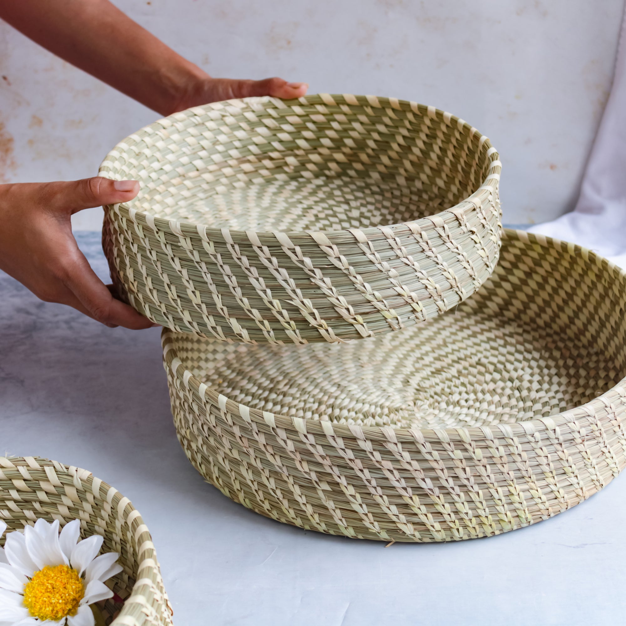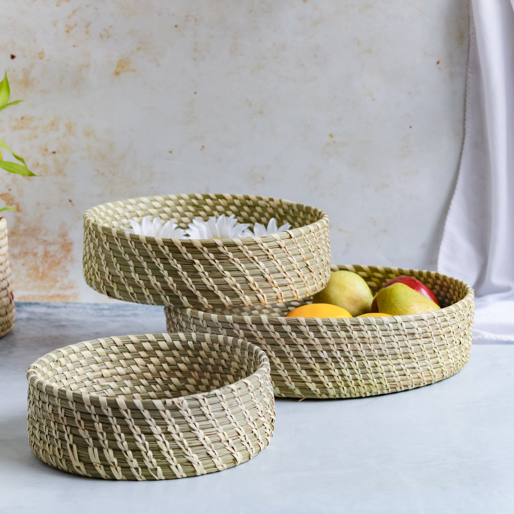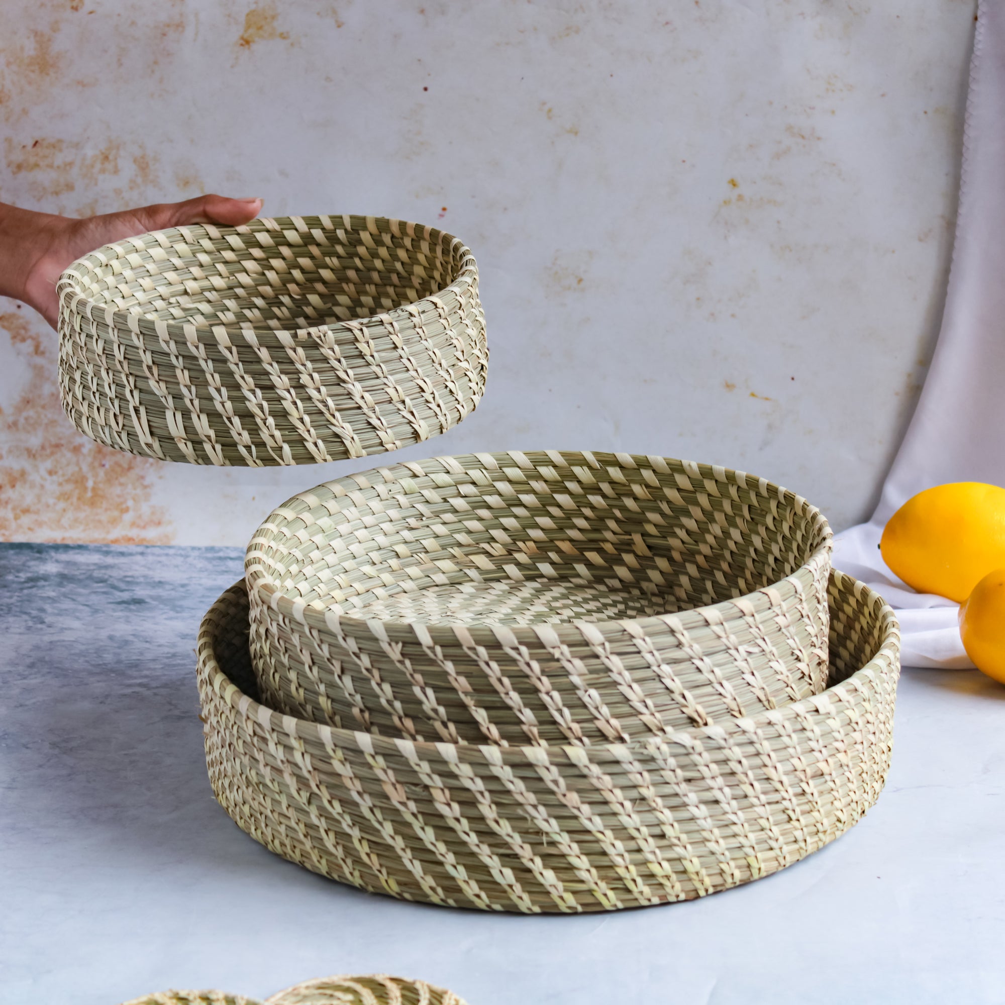 Set of 3 natural sabai grass handwoven baskets that can be used as fruit baskets on the dining table or in the kitchen. The versatile baskets can be used for storing a number of items, from vegetables to toys and trinkets. The naturally made baskets can also be used as a tray on the side or coffee table to place books and decor pieces. The set of 3 baskets together can also be used as a snack tray for keeping jars of snacks, pickles and munchies. The baskets come in 3 sizes - large, medium and small but are all of the same height. The round tray set is naturally dried and retains the simple aesthetic of the braided product.