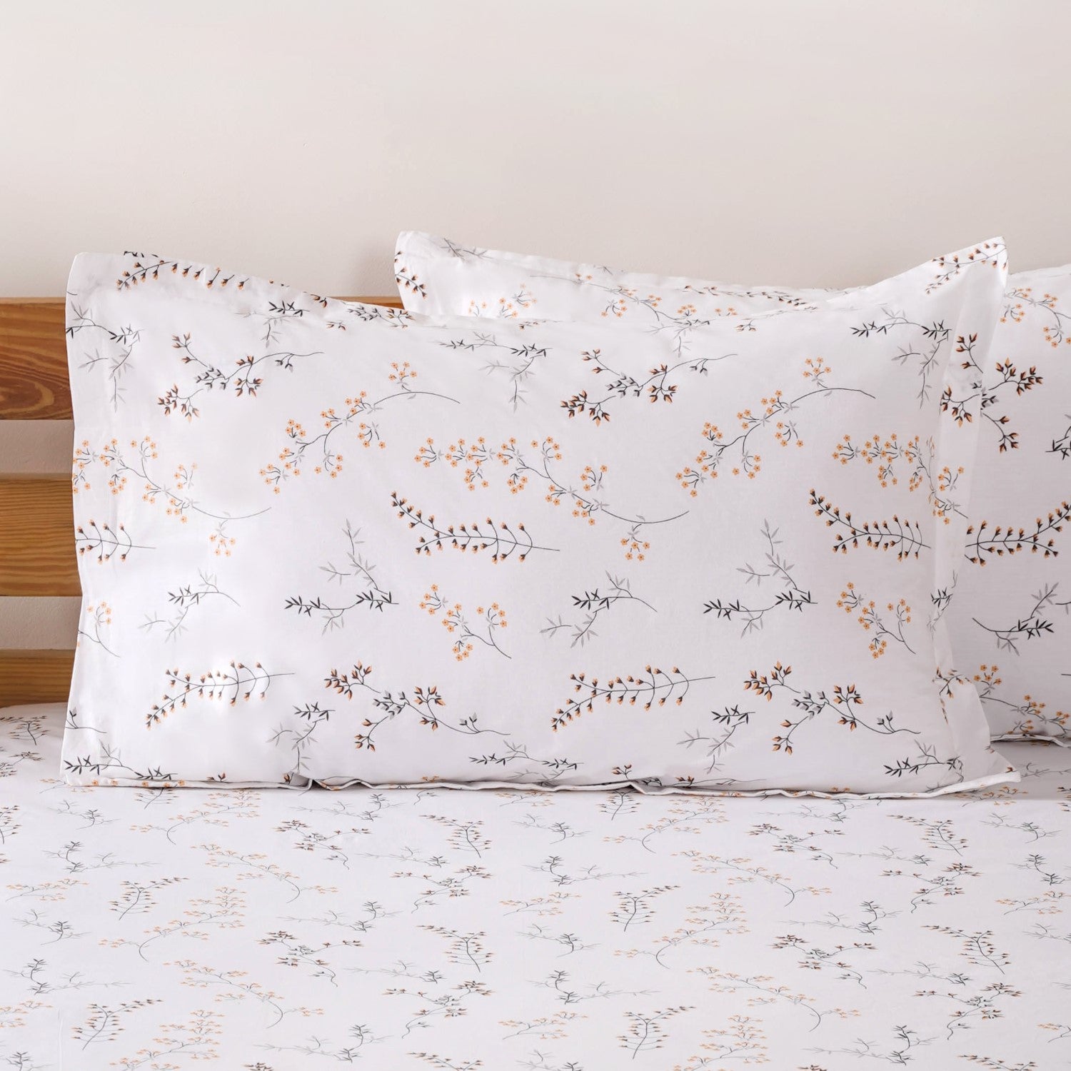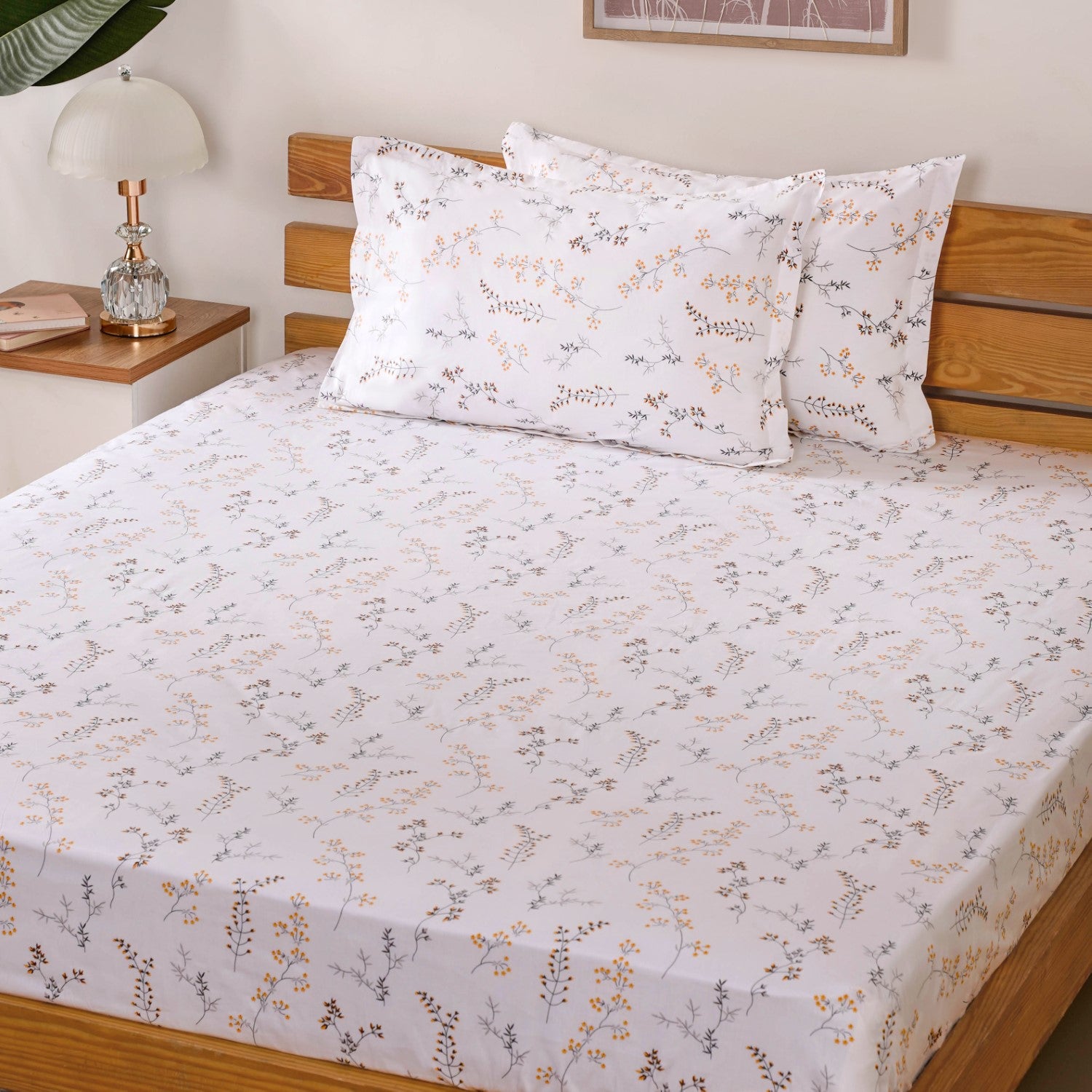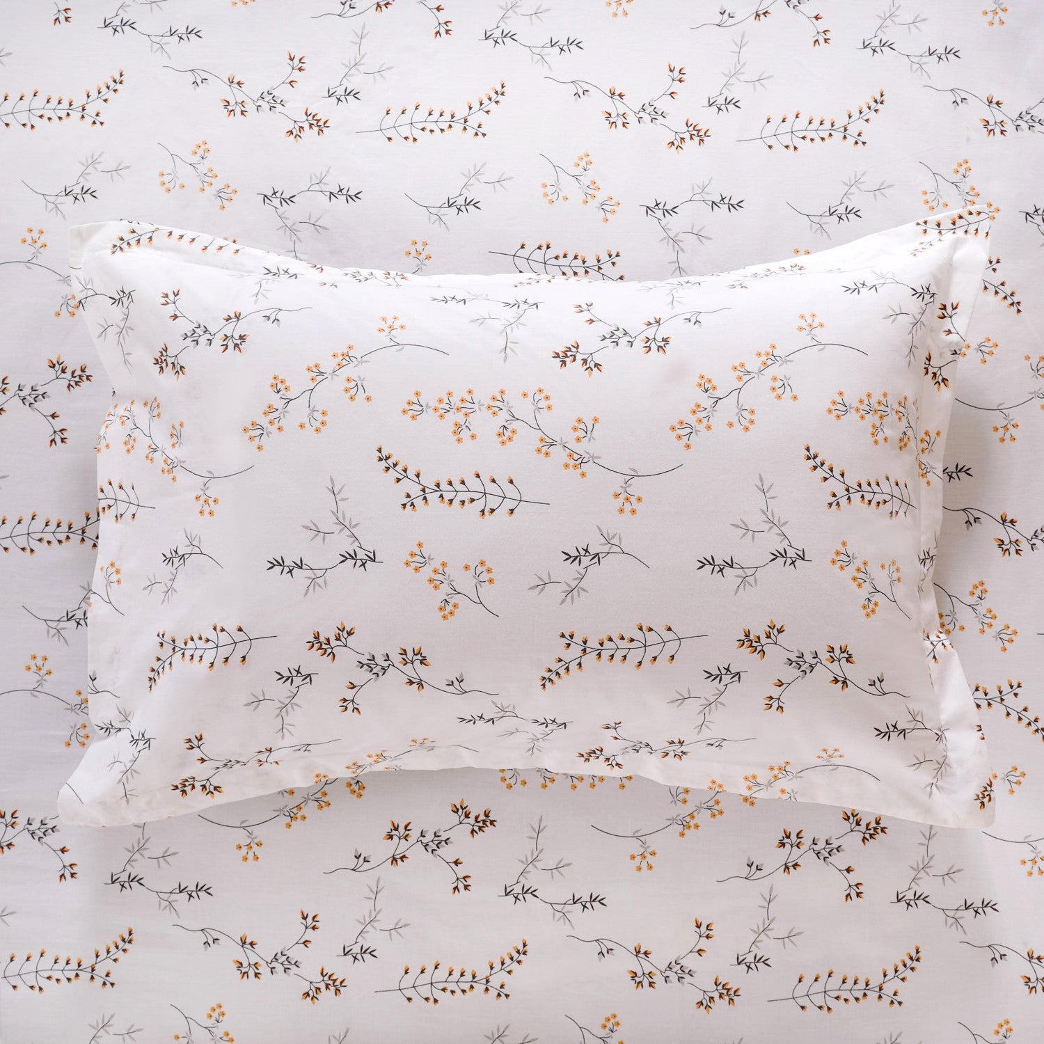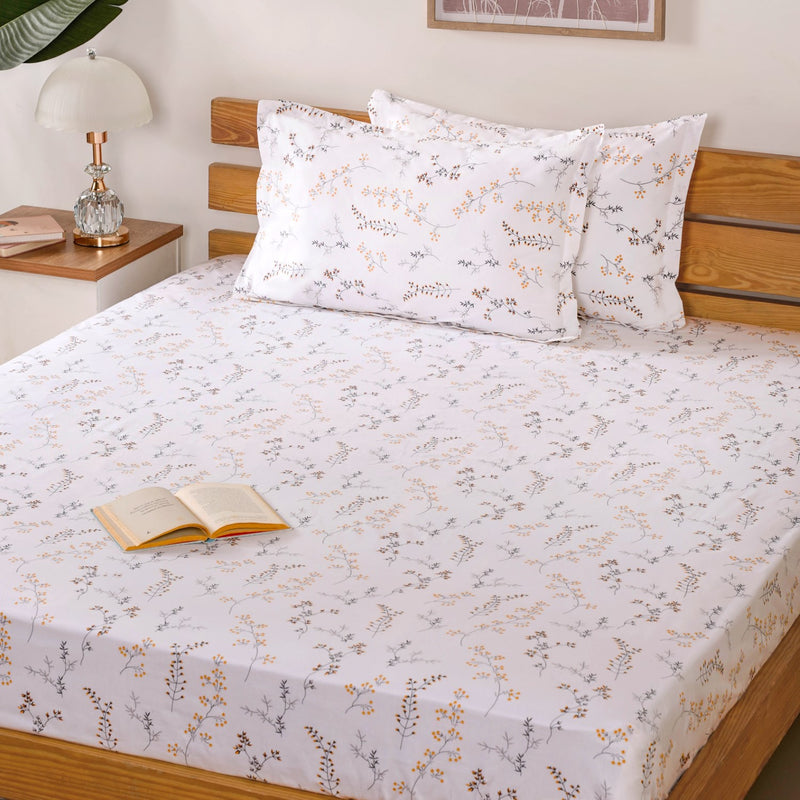 Design: This bedsheet set features a fresh, white flat bedsheet made from soft, high-quality cotton, with a 180-thread count for a smooth, comfortable feel. The subtle floral print, crafted in soothing shades of grey, sunny yellow, and vibrant pops of maroon, adds a lively yet serene touch to your bedroom. The design strikes the perfect balance between modern minimalism and a welcoming, cosy vibe. Paired with two matching pillowcases, the same floral pattern ties everything together, bringing an effortlessly stylish and refreshing look to your bedding set.