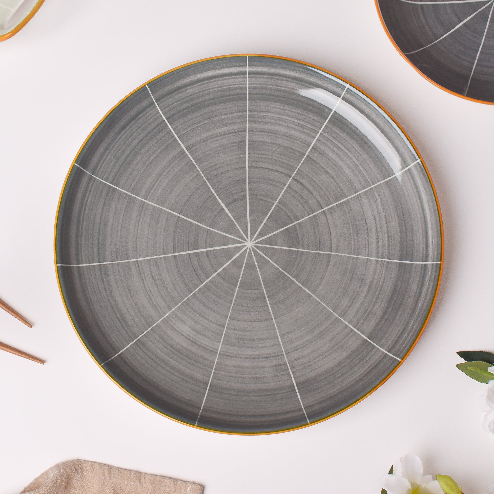 The grey willow dinner plate looks classy and exquisite on a dinner table. The fine lines in white highlighting the grey backdrop lend a simple yet striking look to the plate. Mix and match the dish with serving bowls and soup bowls from the collection to create a serene dining set-up. Nestip: The grey plate can be placed on silver mats to complement the look of the dinner setup. Size: 26cm D x 2cm B Color: Dark grey, white, and ochre Material: Ceramic Products included: 1 dinner plate Style: PRS67C78
