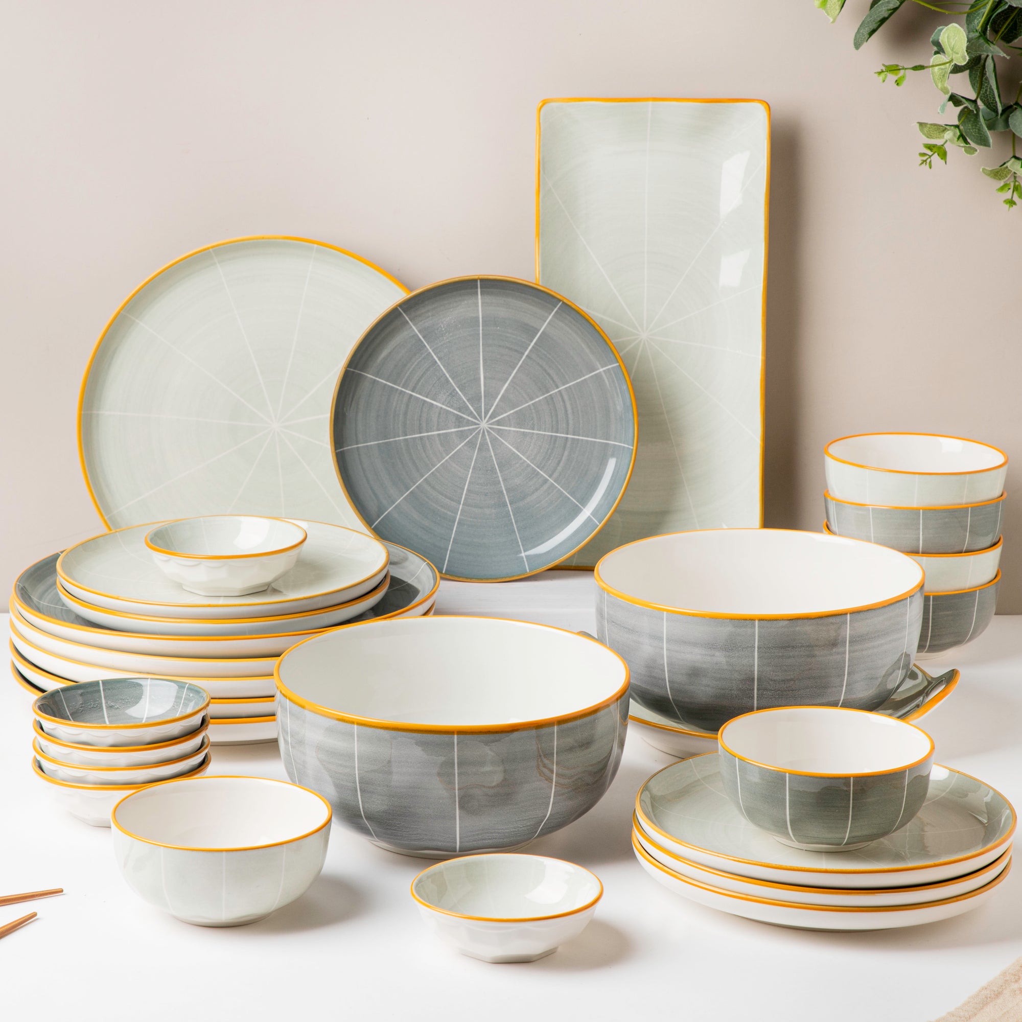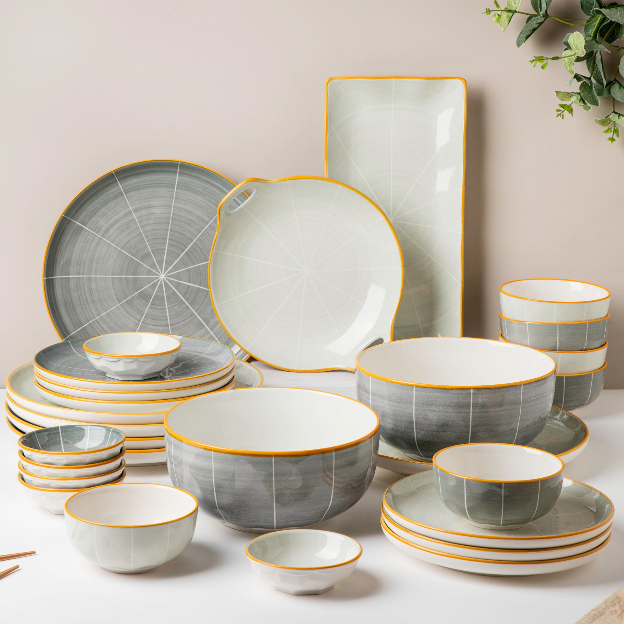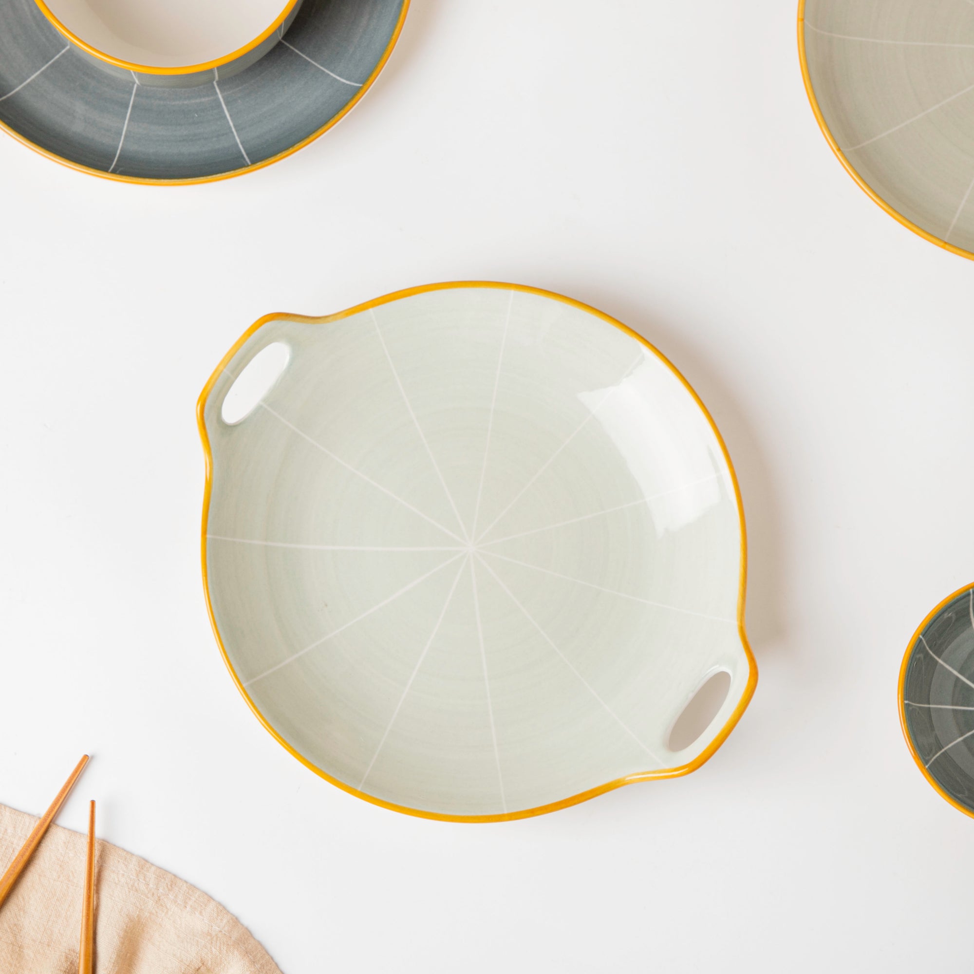 Food is better when savored with family and friends. It calls for a quintessential, à la mode Willow dinner set. Immersed in a calm, soothing, relaxing color, the ceramic collection is curated to deliver tranquility with the platter. With a team, 6 dinner plates, 6 snack plates, 6 soup bowls, 6 dessert/dip dishes, 2 serving bowls, 1 long plate, and 1 baking plate, the Willow set will always be in the service of catering felicity effortlessly.