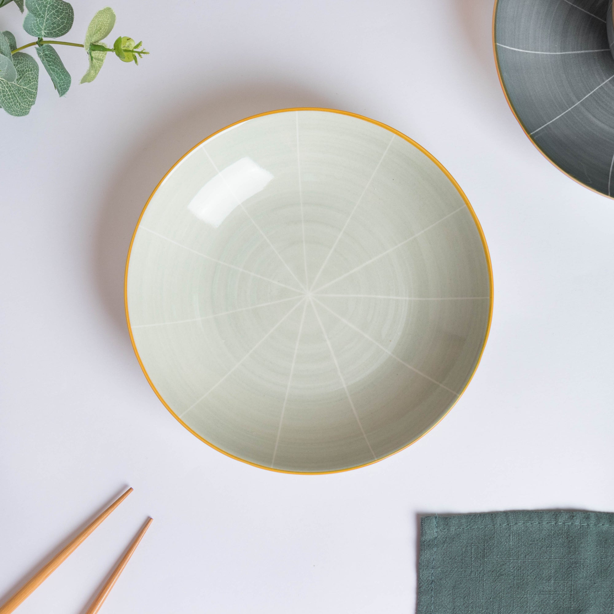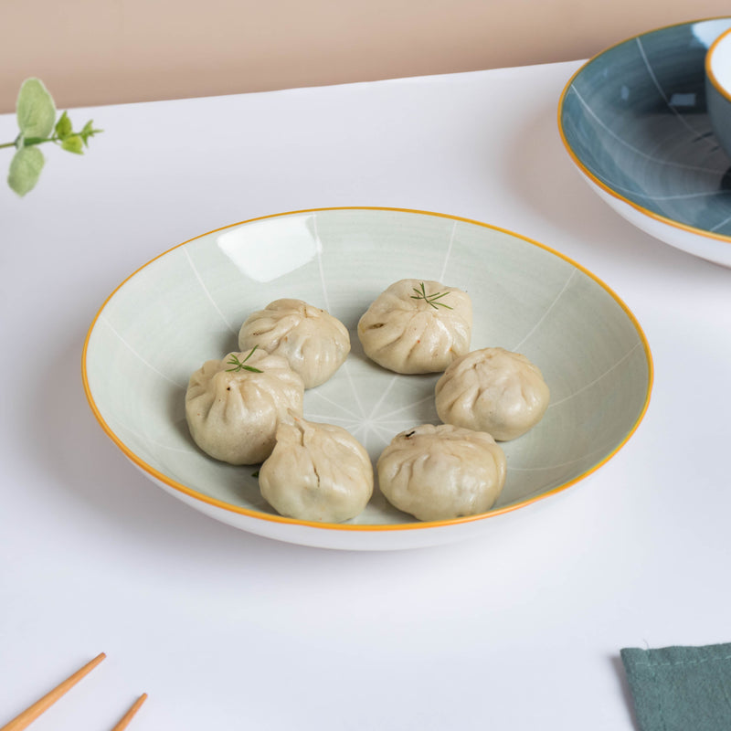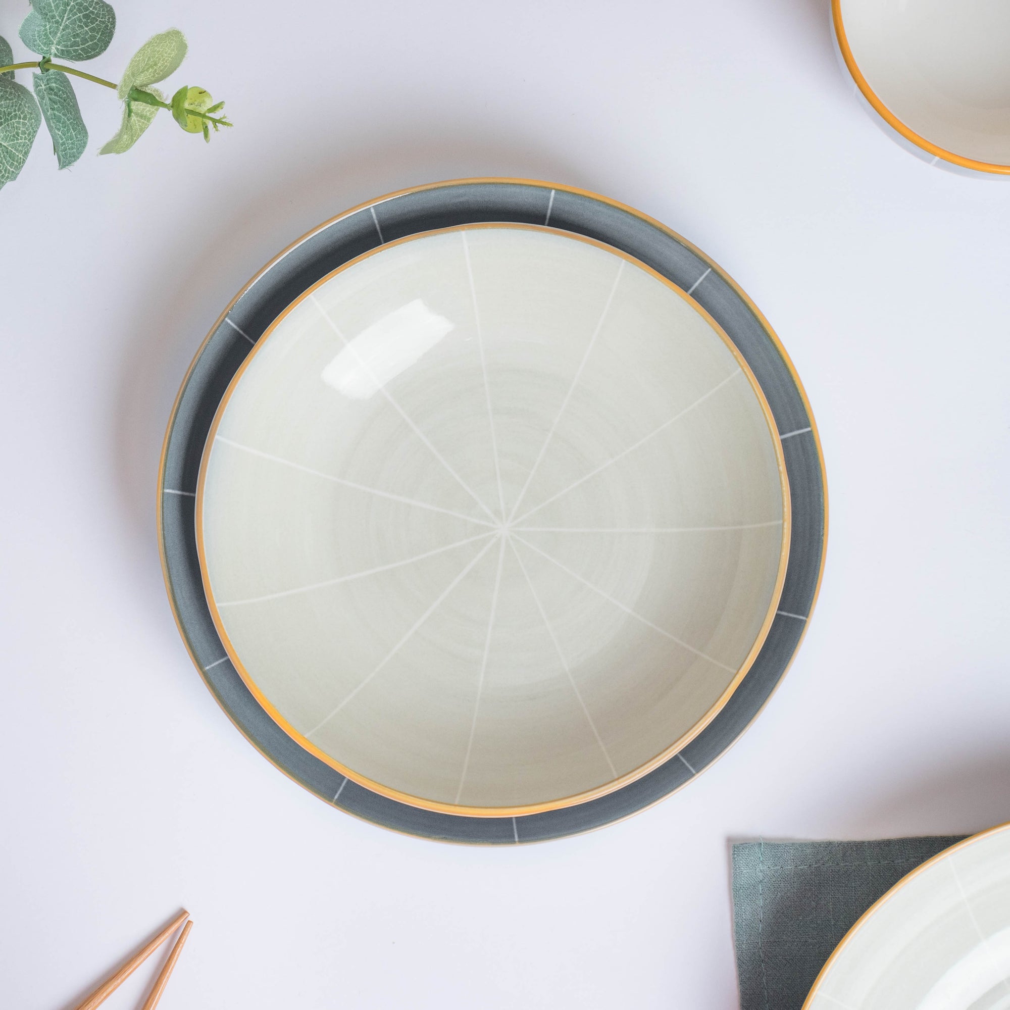 Add grace and elegance to the tablescape with the stunning snack plate. The plate has been manufactured with high-quality ceramic with minimalistic patterns, making it ideal for daily use. Whether it's appetizers, fruits, salads, or some delicious fries, the plate will put focus on whatever food one serves. Nestip: Pair the plate with white or silver cutlery. Size: 21cm D x 13cm D (base) x 5cm H Color: Grey, white, and ochre Material: Ceramic Products included: 1 plate Style: PRS67C88
