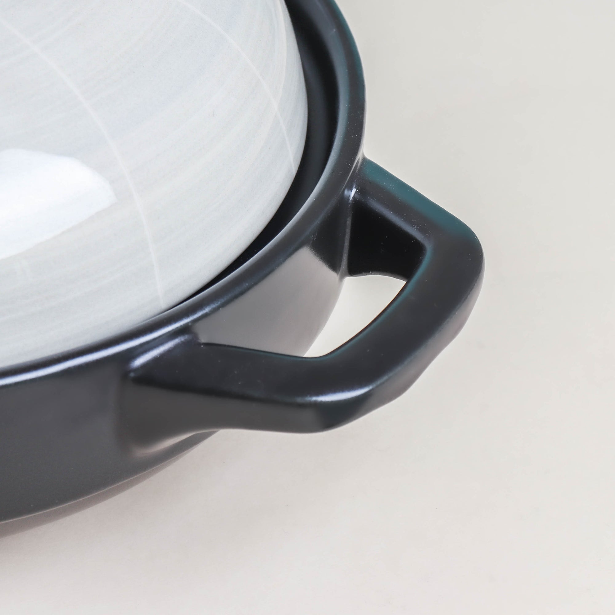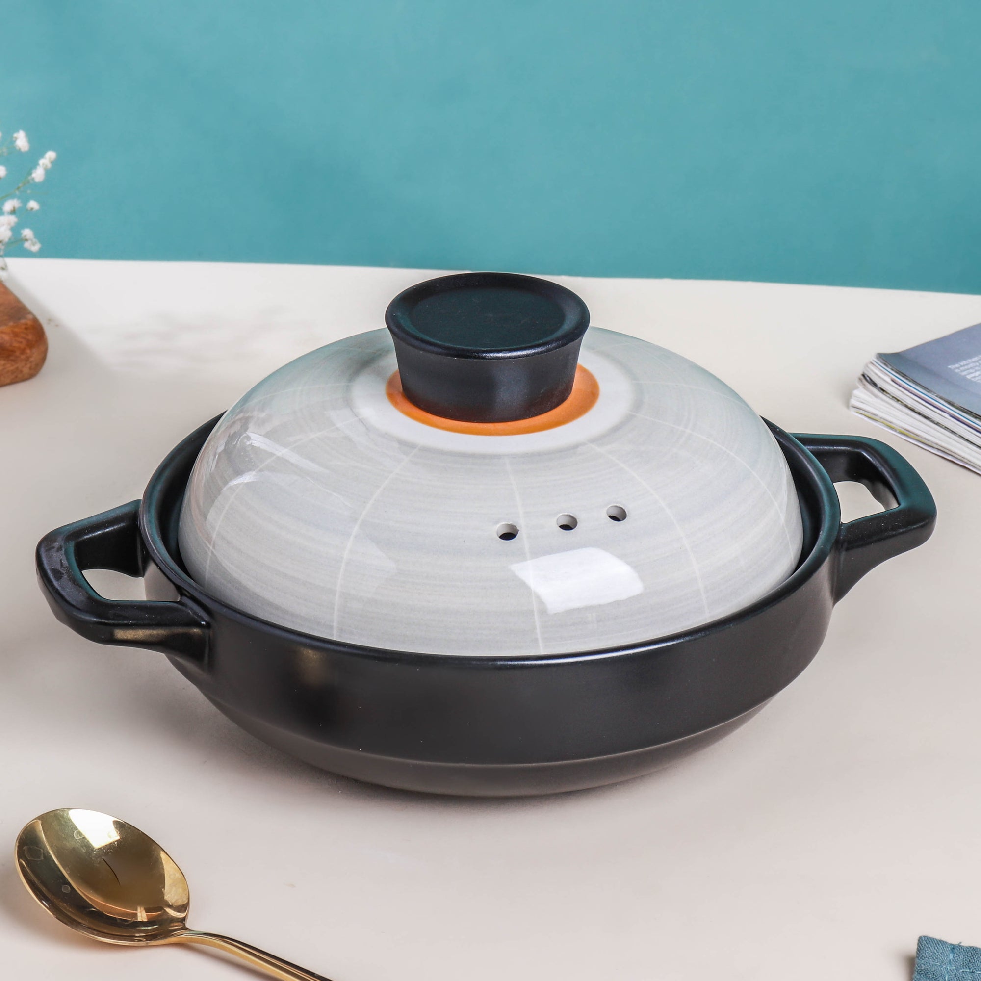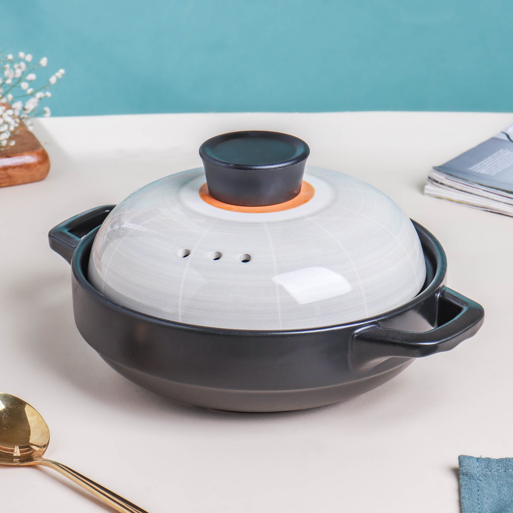 The Sangmo low stockpot fills any kitchen space with oriental charm. With two ear-like handles and a fitting cover lid, the ceramic pot can help cook and serve a variety of dishes. Provided with a knob-like handle, the lid ensures thorough coverage of the food cooked inside. One can safely use the cooking pot on a gas stove or in the oven. Interestingly, an oriental culture enthusiast can easily catch a resemblance between the lid’s design and a Sangmo (i.e., a Korean folk arts hat worn during a traditional Pungmul performance). Nestip: The low stockpot can be used as serving ware for a table arrangement, laid on a housewarming or birthday party. Size: With handle - 27cm L × 20cm D With lid - 15cm H Capacity: 800ml Color: Black, light gray, and yellow Material: Ceramic Products Included: 1 low stockpot, with a cover lid Style: FC57C47