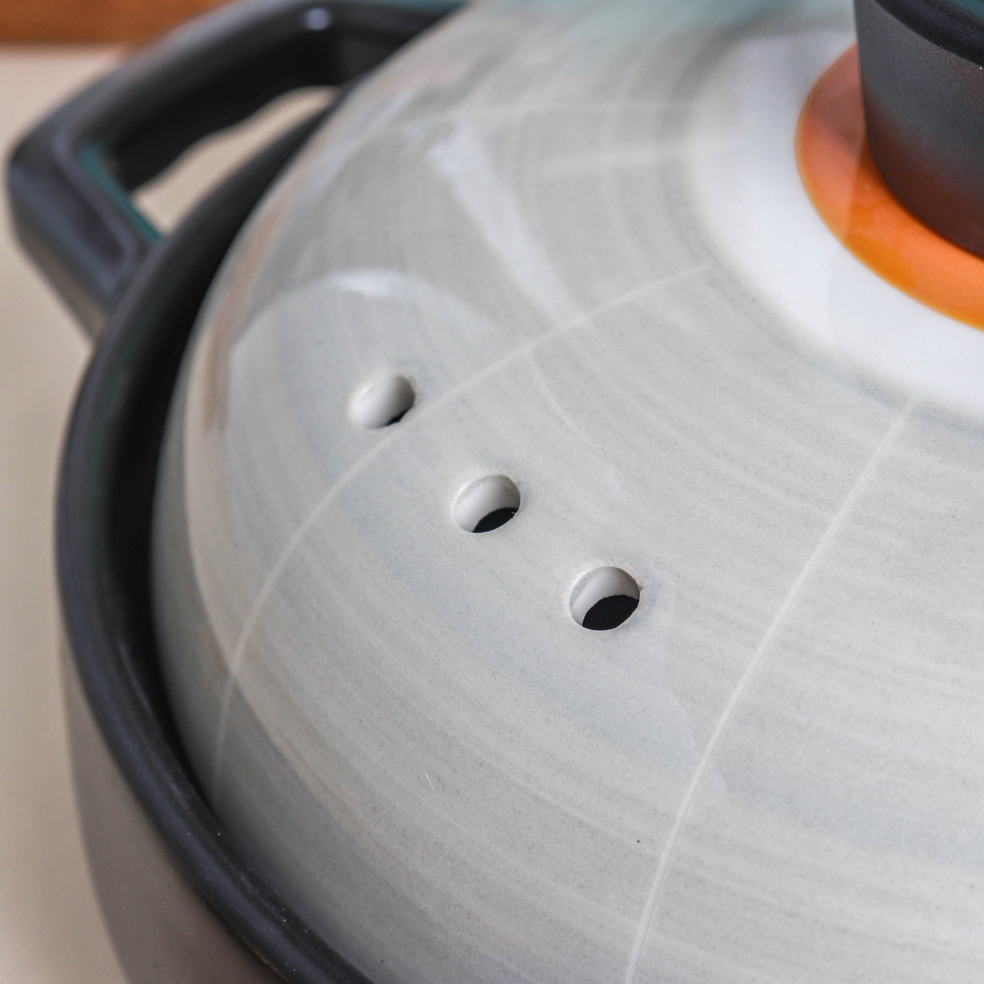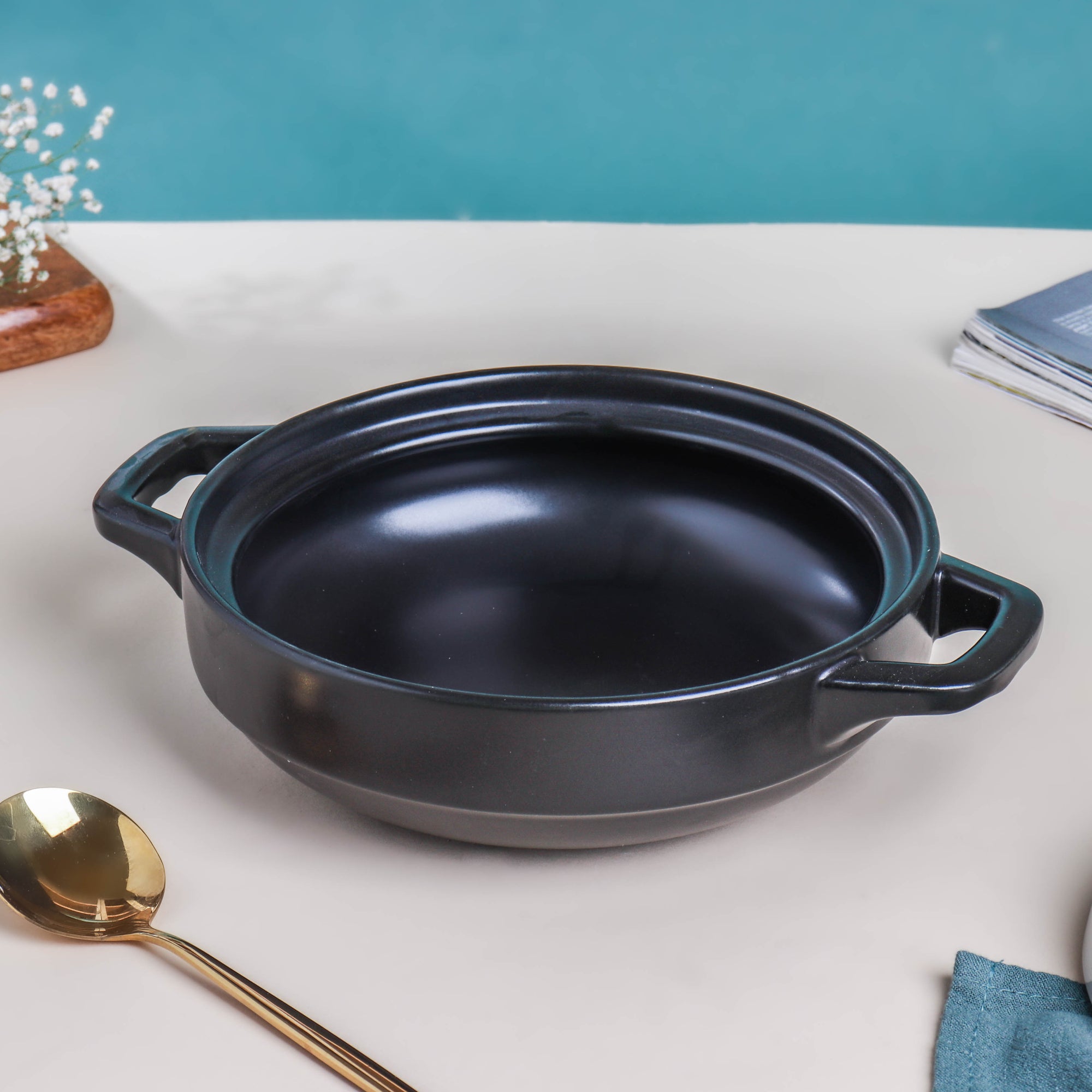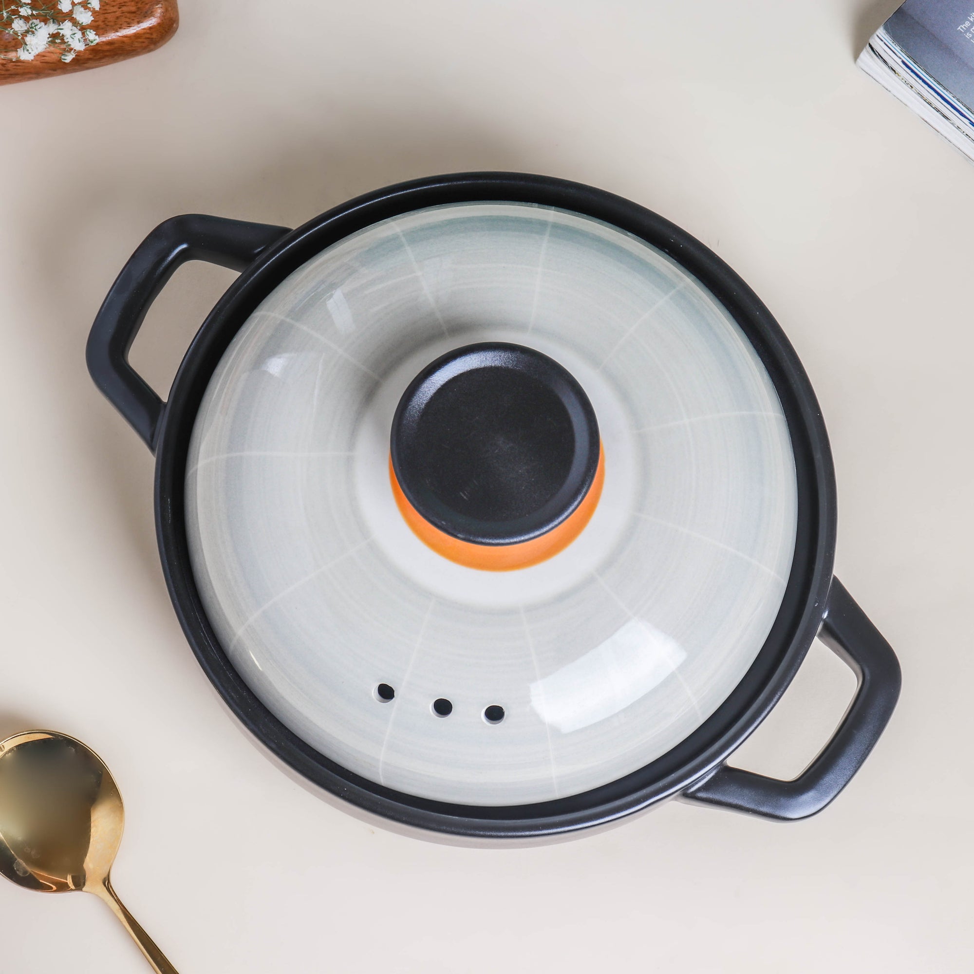 The Sangmo low stockpot fills any kitchen space with oriental charm. With two ear-like handles and a fitting cover lid, the ceramic pot can help cook and serve a variety of dishes. Provided with a knob-like handle, the lid ensures thorough coverage of the food cooked inside. One can safely use the cooking pot on a gas stove or in the oven. Interestingly, an oriental culture enthusiast can easily catch a resemblance between the lid’s design and a Sangmo (i.e., a Korean folk arts hat worn during a traditional Pungmul performance). Nestip: The low stockpot can be used as serving ware for a table arrangement, laid on a housewarming or birthday party. Size: With handle - 27cm L × 20cm D With lid - 15cm H Capacity: 800ml Color: Black, light gray, and yellow Material: Ceramic Products Included: 1 low stockpot, with a cover lid Style: FC57C47