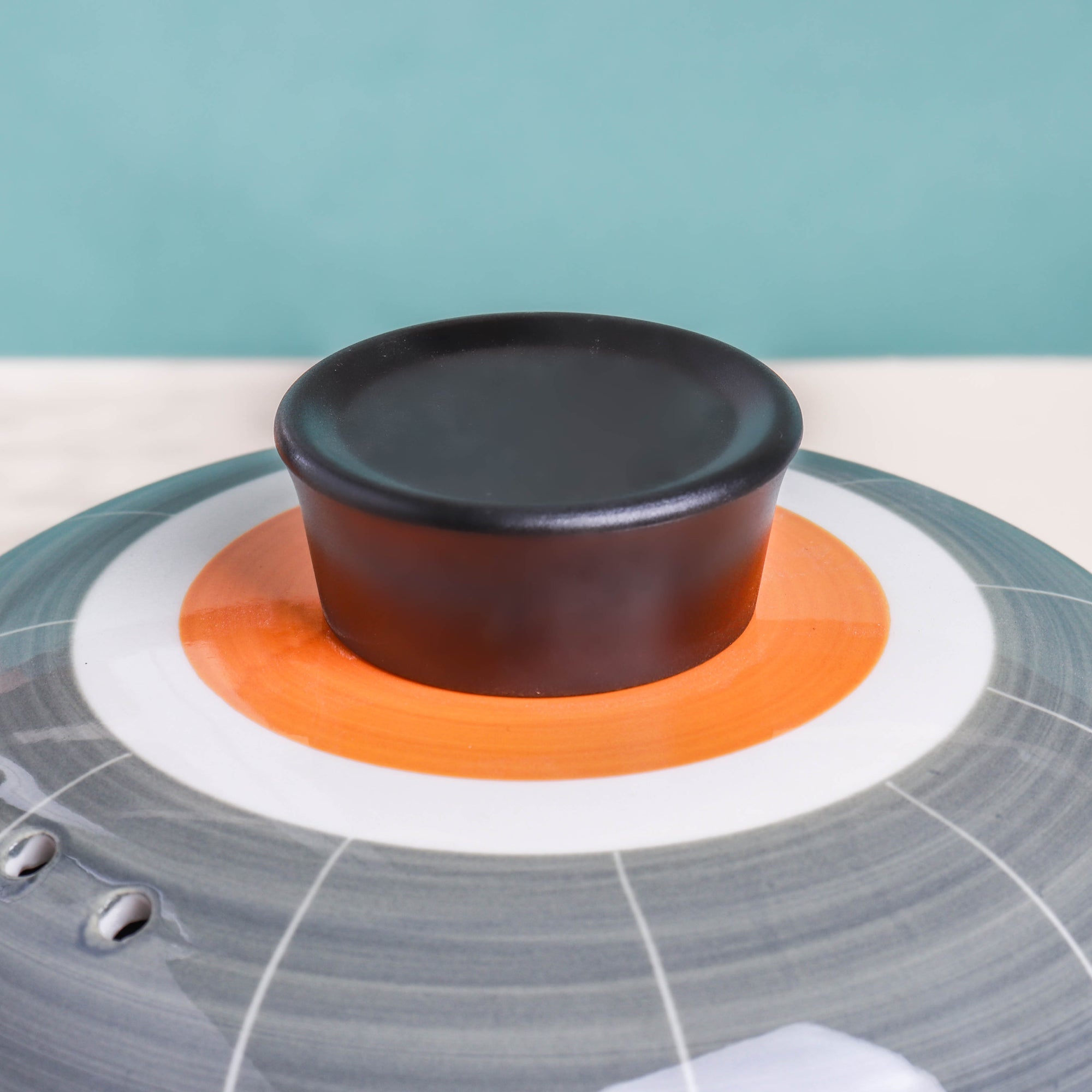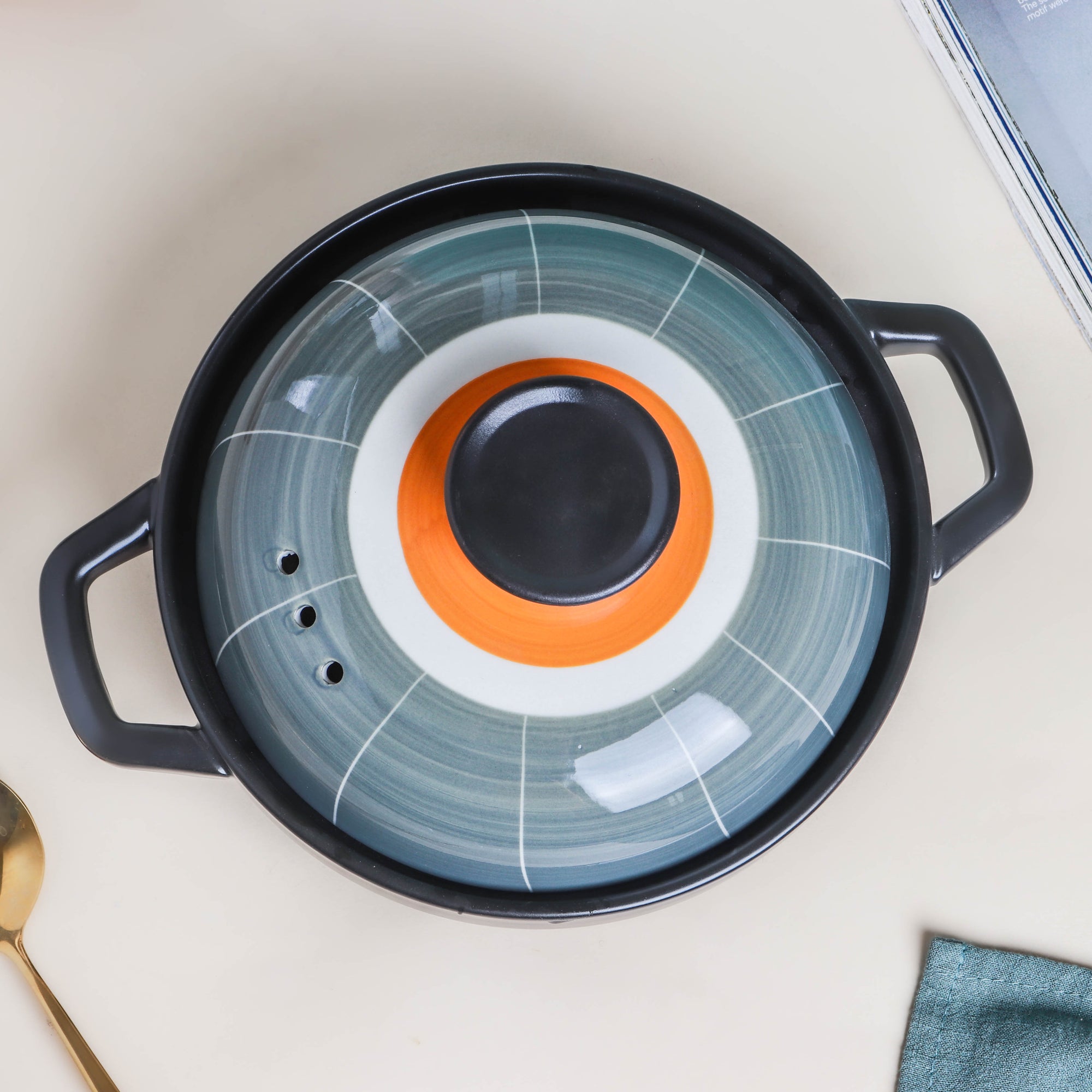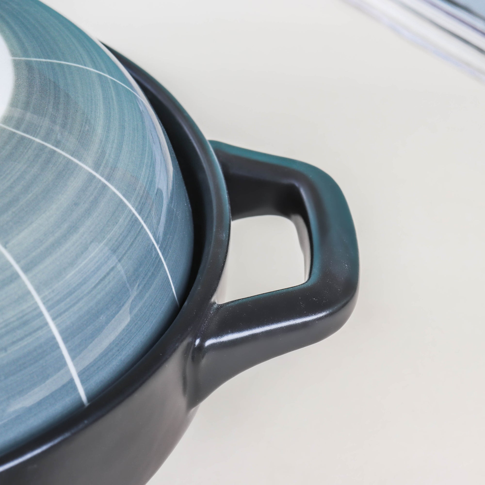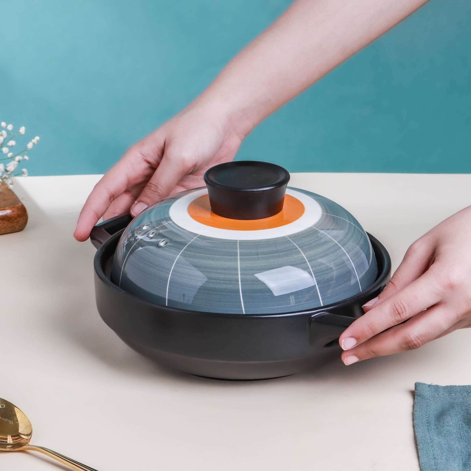 The Sangmo low stockpot is sure to delight your aesthetic appetite. Equipped with two ear-like handles and a cover lid, the cooking pot can help to cook and serve a variety of stews and dishes. Perfectly safe to be used on a gas stove or in the oven, the ceramic pot comes with a sturdy structure. To secure the correct placement of the lid, so that the food kept inside is properly covered - the low stockpot has a knob-like handle present on the lid's top. An oriental culture enthusiast can easily catch the resemblance between the lid’s design and a Sangmo (i.e., a Korean folk arts hat worn during a traditional Pungmul performance). Nestip: The low stockpot can be used as serving ware for a table arrangement, laid on a housewarming or birthday party. Size: With handle - 27cm L × 20cm D With lid - 15cm H Capacity: 800ml Color: Black, dark gray, and yellow Material: Ceramic Products Included: 1 low stockpot, with a cover lid Style: FC57C48