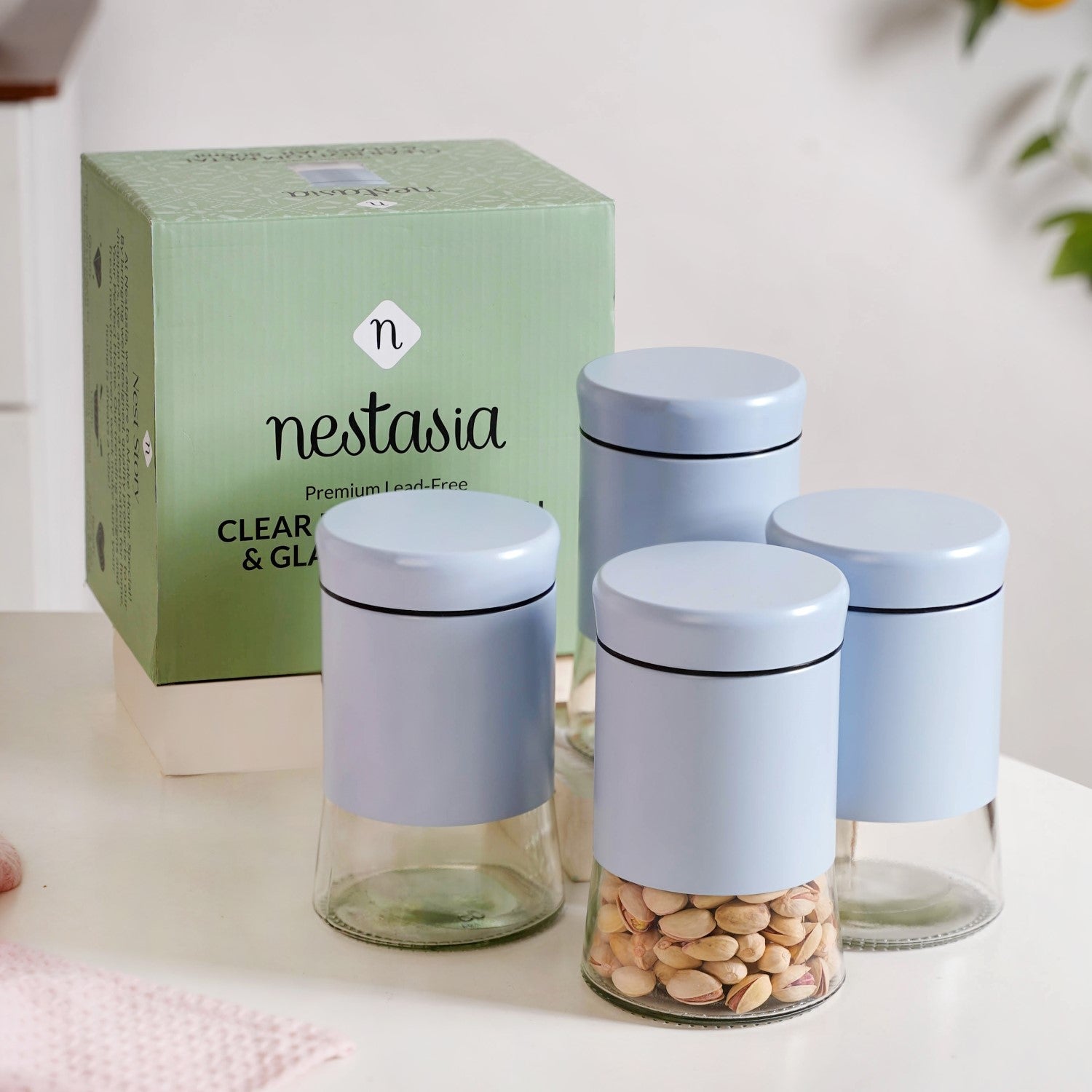 Design: Each jar in the set features a clear, sturdy glass base that provides visibility while ensuring strength and stability. The upper half is encased in smooth, matte blue metal, creating a modern and clean look. The rounded lids complement the minimalist design, ensuring the jars seamlessly integrate into any room, from kitchens to offices. With an 800ml capacity per jar, the set offers ample storage while maintaining a compact footprint. The unique blend of glass and blue metal gives each jar a chic, minimalistic vibe, offering both durability and aesthetic appeal. Whether for storage or display, this set brings an elegant touch to your home.