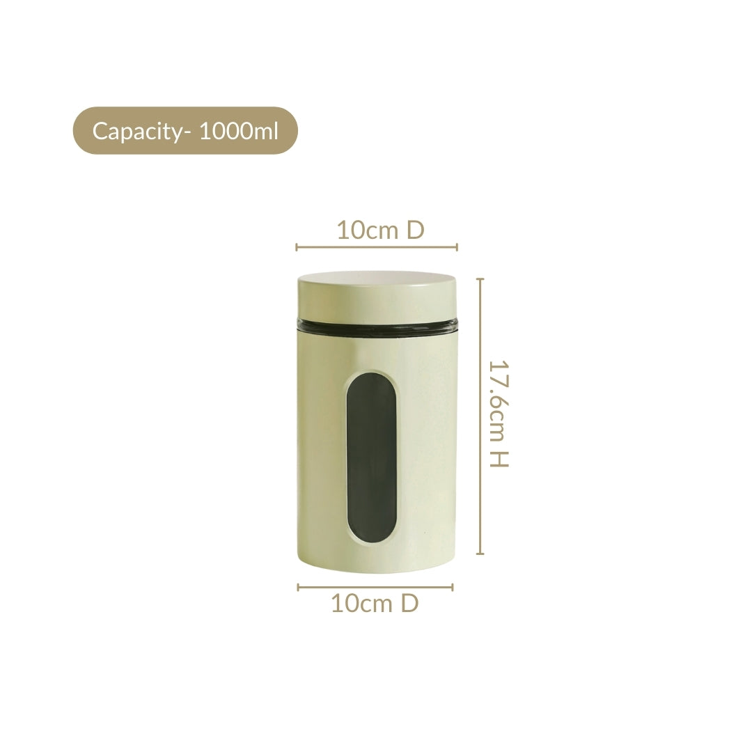 Design: Each jar features a tall, cylindrical silhouette wrapped in a soft green finish, giving them a sleek and modern look. A slim, vertical oval cut-out on the front of each jar offers a glimpse of the inner glass container. The lids mirror the same soft green colour, with a gently domed shape and smooth edges that create a cohesive look. The combination of glass and soft green finish gives these jars a clean, structured aesthetic.