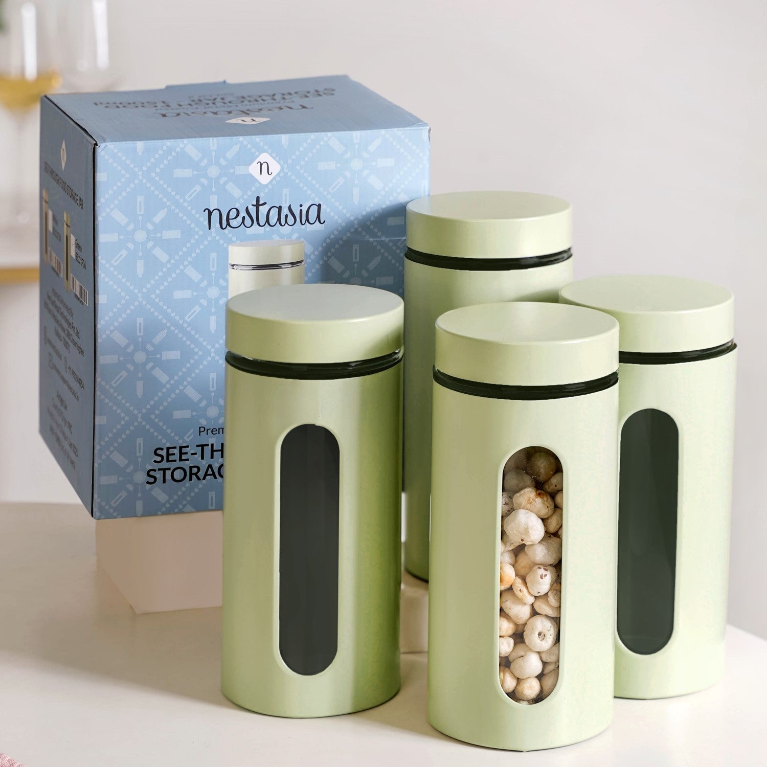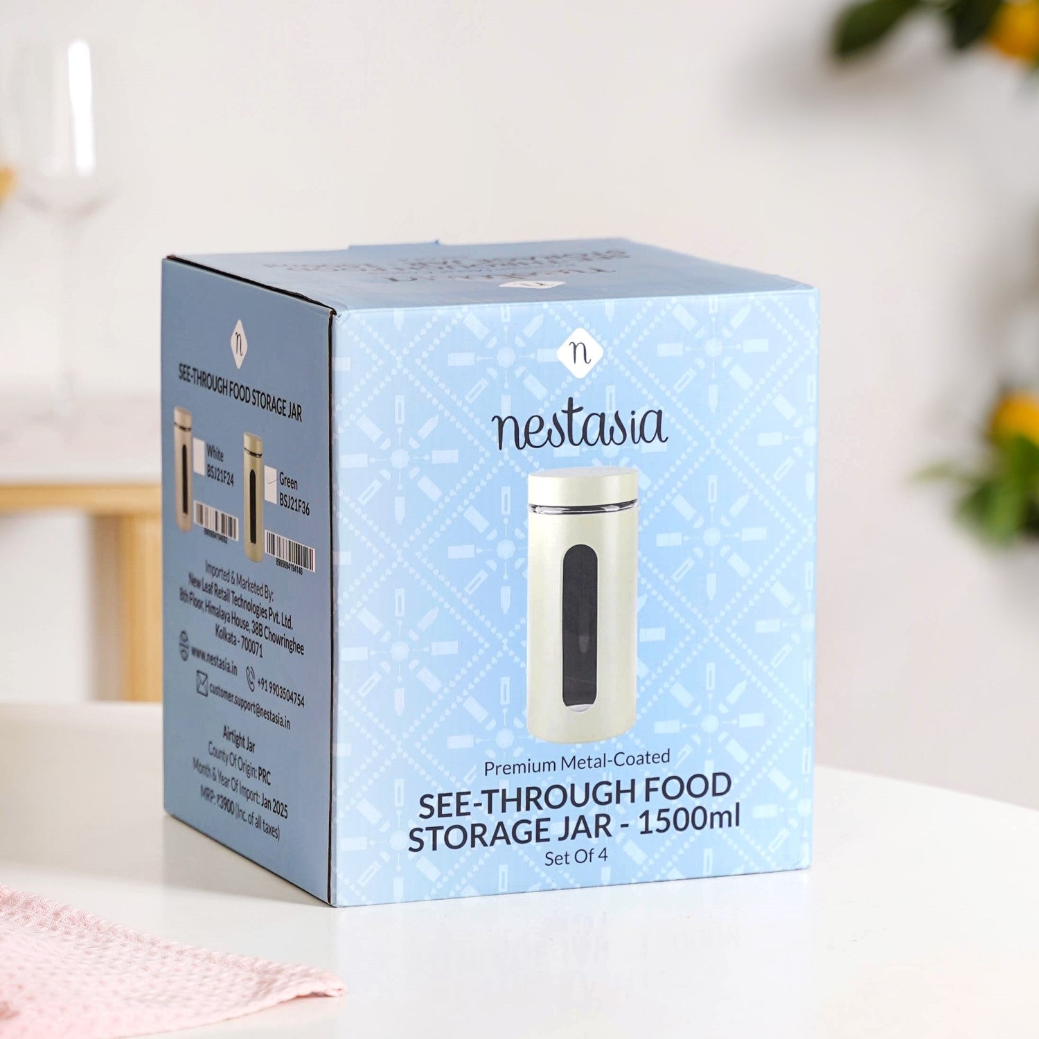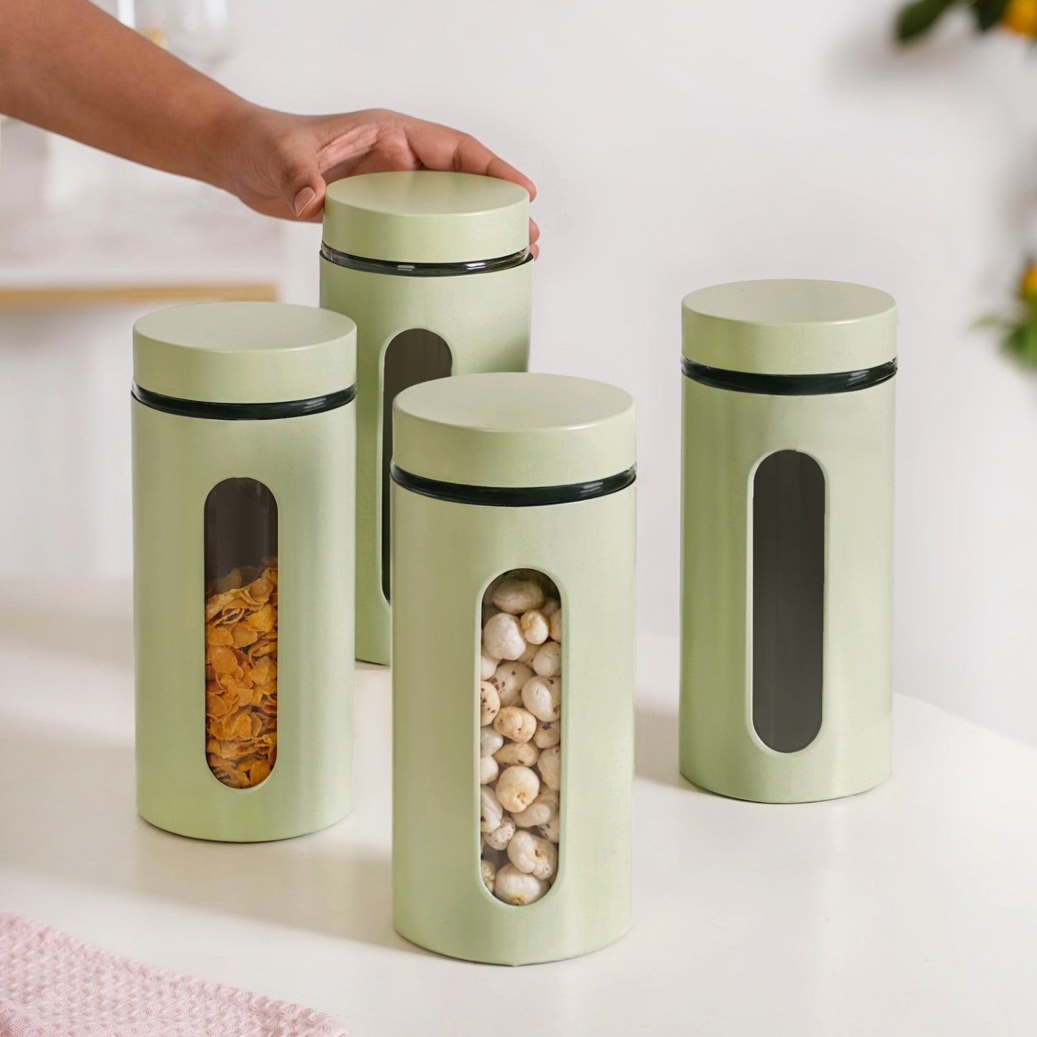 Design: Crafted from high-quality clear borosilicate glass, each canister features a solid metal casing for a durable and stylish finish. The jars have a smooth, modern surface with a clear front panel to make viewing contents quick and easy. A snug-fitting PVC lid ensures your food stays fresh for longer by keeping air and moisture out. The anti-skid ribbed base keeps the canisters steady, preventing slipping on countertops or shelves. Designed with ample capacity, they hold enough food for everyday use while maintaining a sleek aesthetic. The solid colour of the metal casing complements the transparent glass, creating a minimalistic yet striking design.