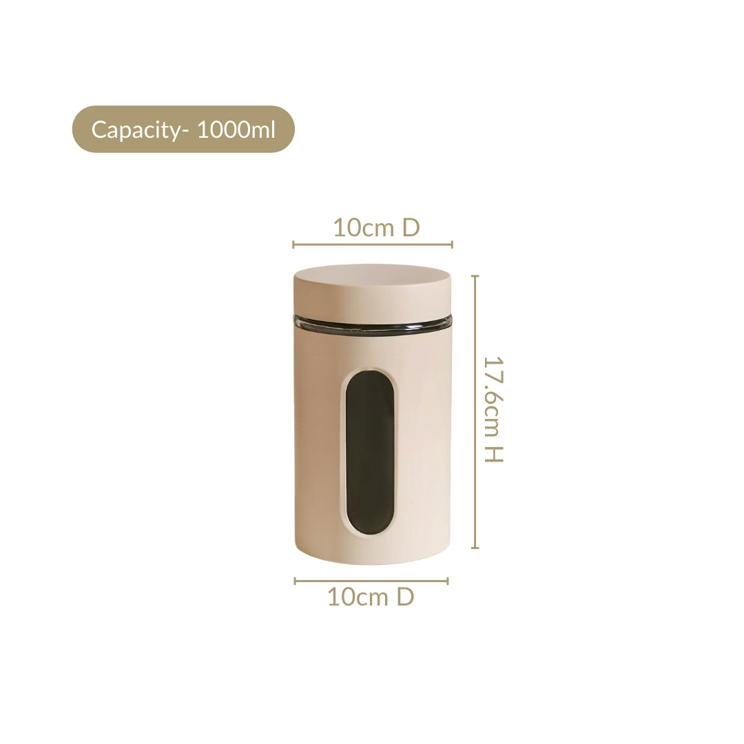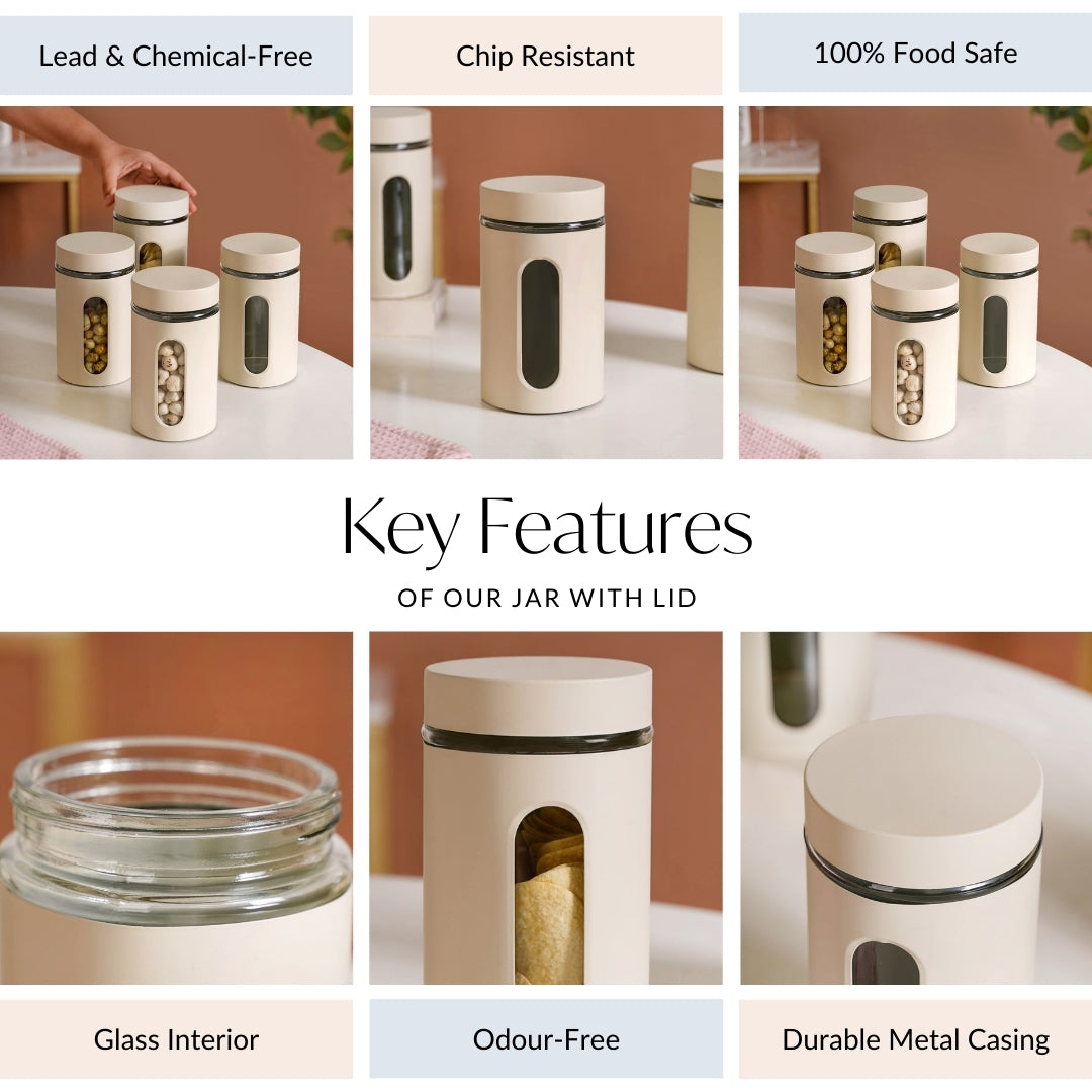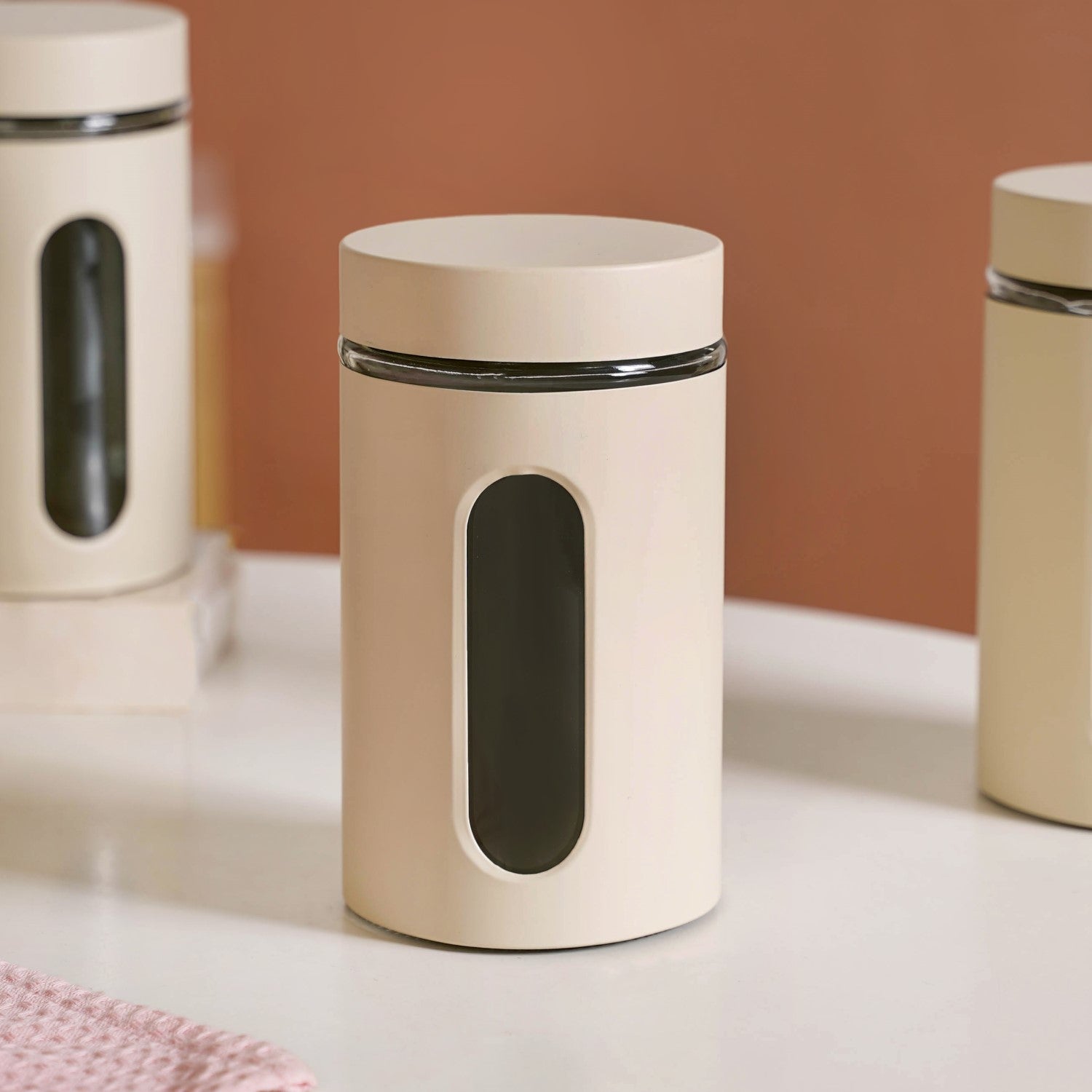 Design: Each canister is crafted from premium clear borosilicate glass and encased in a solid-coloured metal shell for added durability and visual appeal. A vertical clear window runs down the front, making the contents visible at a glance. The snug-fit, air-tight PVC lid helps keep everything sealed and fresh inside. Their compact size makes them perfect for small pantries, tea stations, or spice shelves while still offering enough capacity for everyday essentials. A smooth outer surface adds a sleek finish, making them as stylish as they are practical.