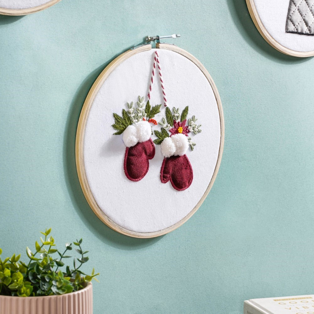 The hand-embroidered hoop can perfectly jazz up the wall decor to celebrate the chilly winter season. The hand-embroidered wall hanging features a pair of red hand gloves design, symbolising the warmth and fuzziness of woollen gloves during the winter season. The embroidery hoop wall art is also embellished with beads and green leafy velvet patchwork to add a unique aesthetic charm to any wall decor. Features: - Premium quality - Hand-embroidered artistry - Meticulous detailing - Unique and attractive design - Vibrant colours - Embroidery wall art Nestip: Hang the hand-embroidered hoop wall hanging on the living room wall as Christmas decor. Size: 10" D Colour: White, red, and green Material: Cotton, velvet, polyester leaves, and beads Products included: 1 hand-embroidered hoop wall hanging Style: EF16NSM01