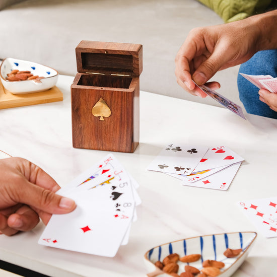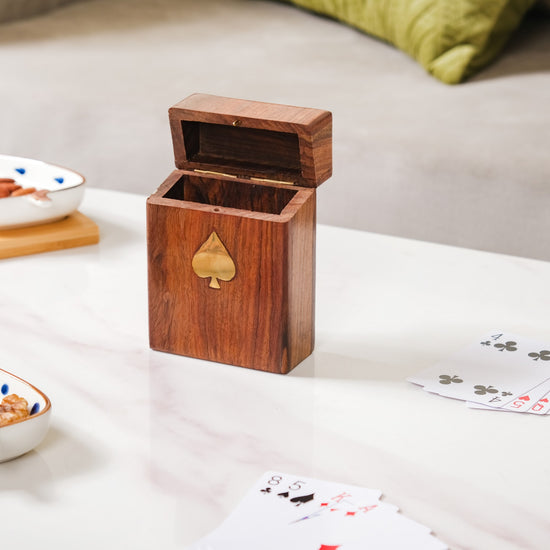 Discover the harmonious blend of form and function with our playing cards encased in a stylish wooden box. Meticulously designed, this versatile box is your go-to solution for storing and protecting the given deck of cards. The hinged top opening ensures easy access while safeguarding your cards from wear and tear. Crafted from premium wood, the box adds a touch of timeless elegance to any gaming space or home decor. Whether you're an avid card player or simply looking to organize your collection, this box offers both utility and style. Its high-quality build, practical features, and aesthetic charm make it an ideal addition to your gaming routine or a thoughtful gift choice.
