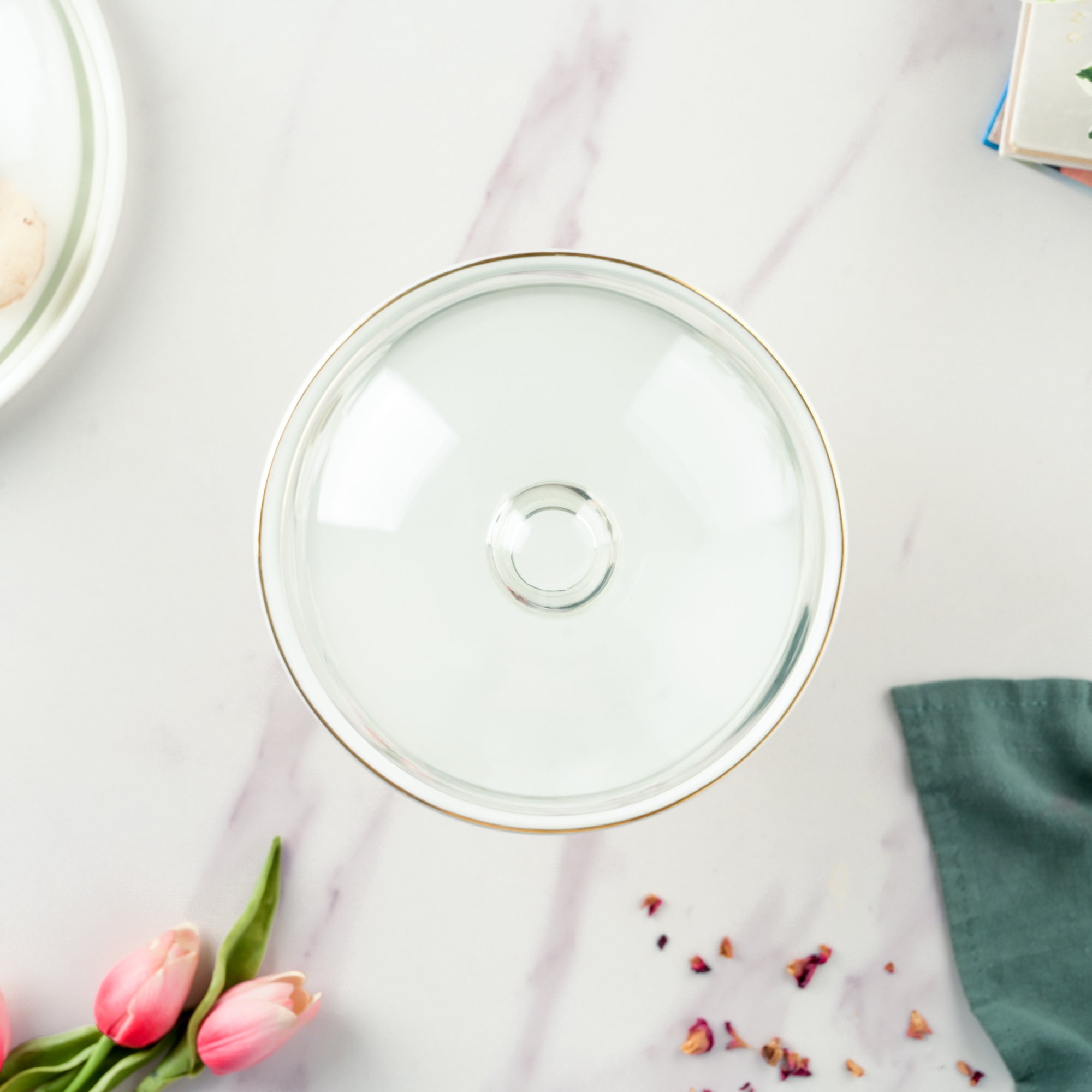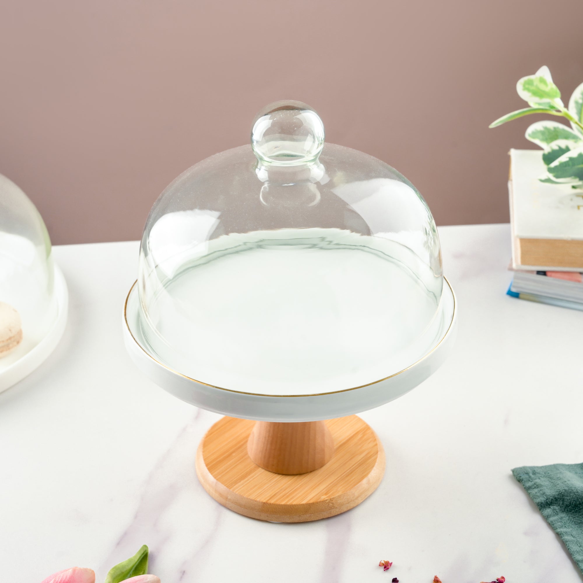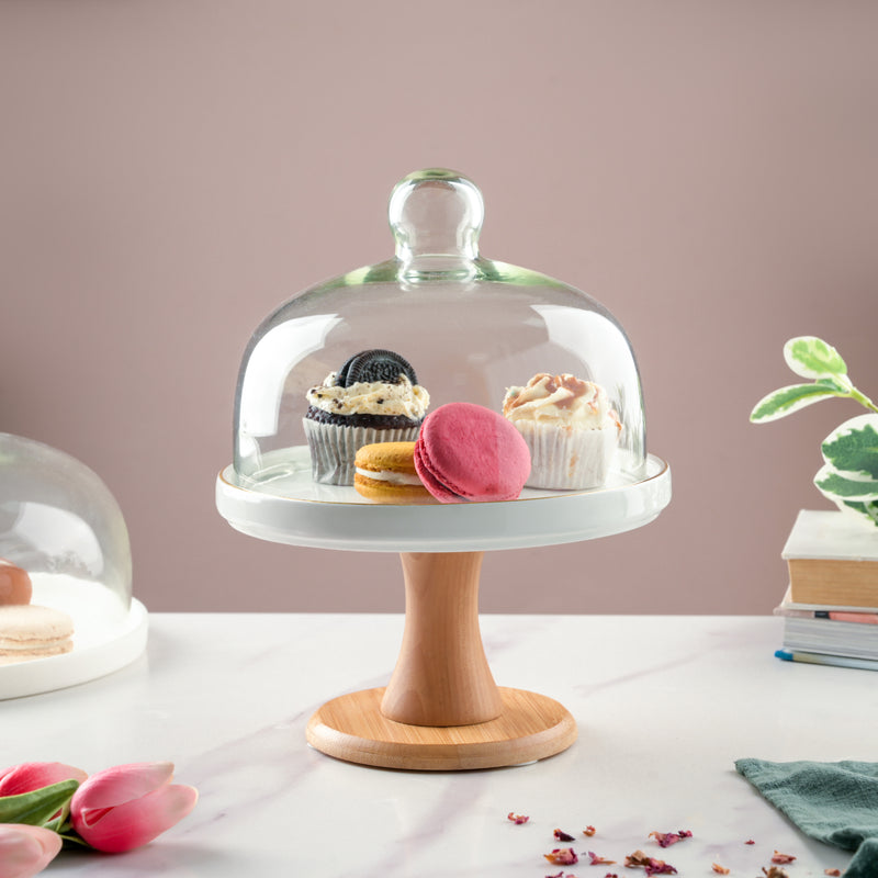 Wooden cake stand with dome has a ceramic plate attached to a wooden stand, and a glass lid which is apt for being used as a fruit plate as well. The lid can be used individually to cover food and keep it fresh for a long time. The stand can be used to display cakes, cupcakes, brownies, buns, breads, and macrons. The wooden stand is capable of adding an organic aesthetic to any dining table setting.